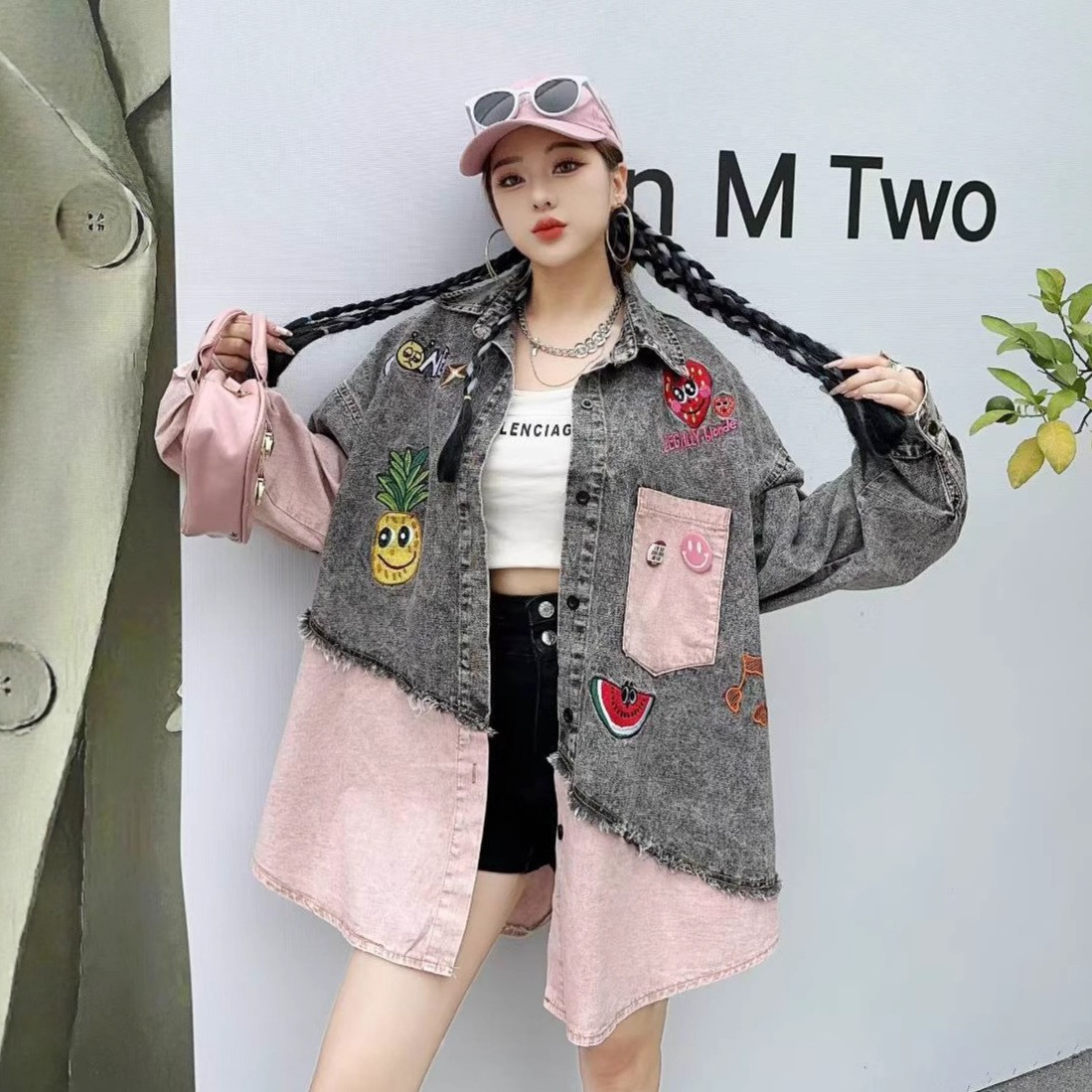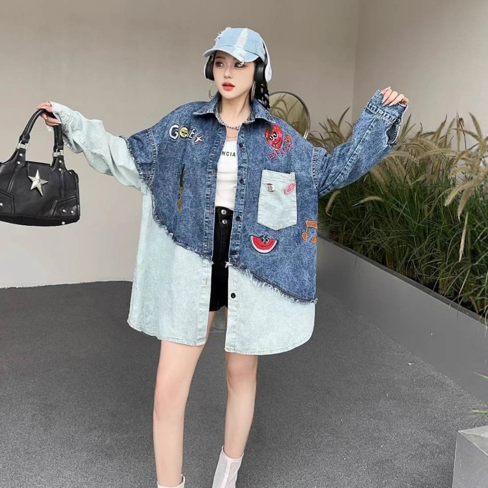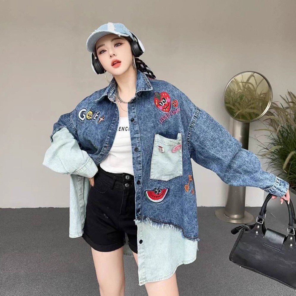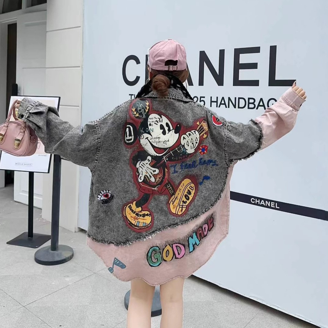 European Trendy Brand 2025 Spring and Autumn Heavy Industry Cartoon Printed Cowboy Shirt for Women, Loose, Casual, Versatile, and Age reducing Top