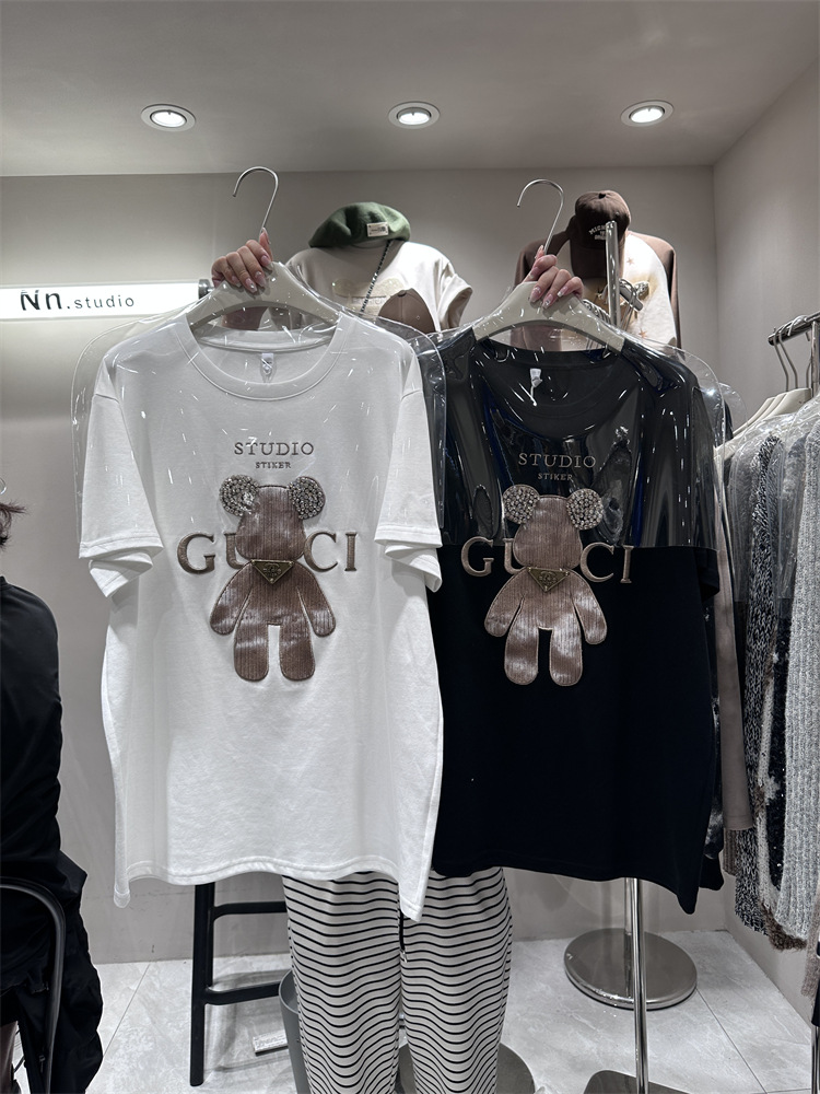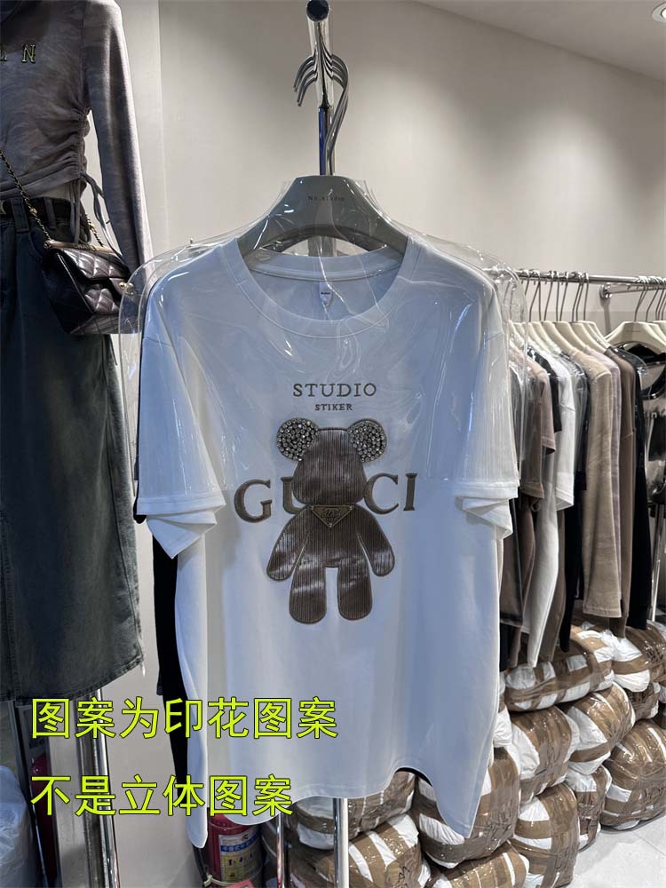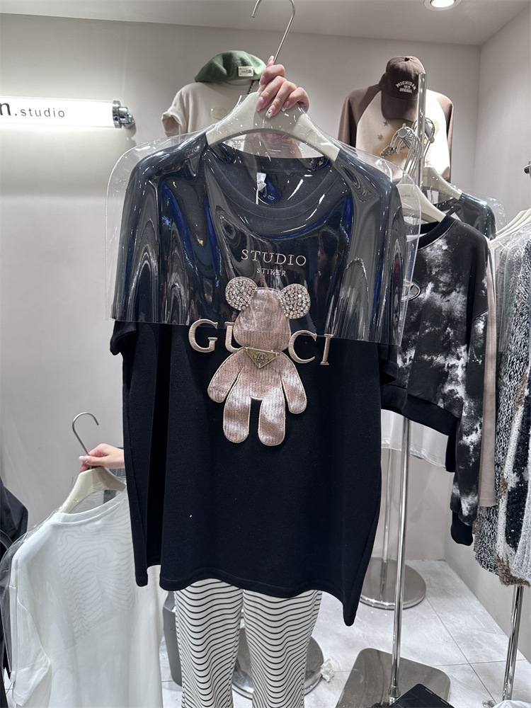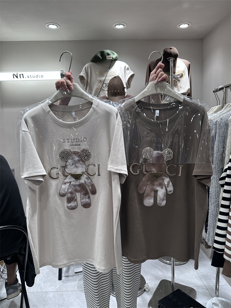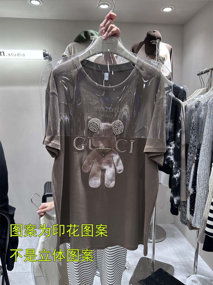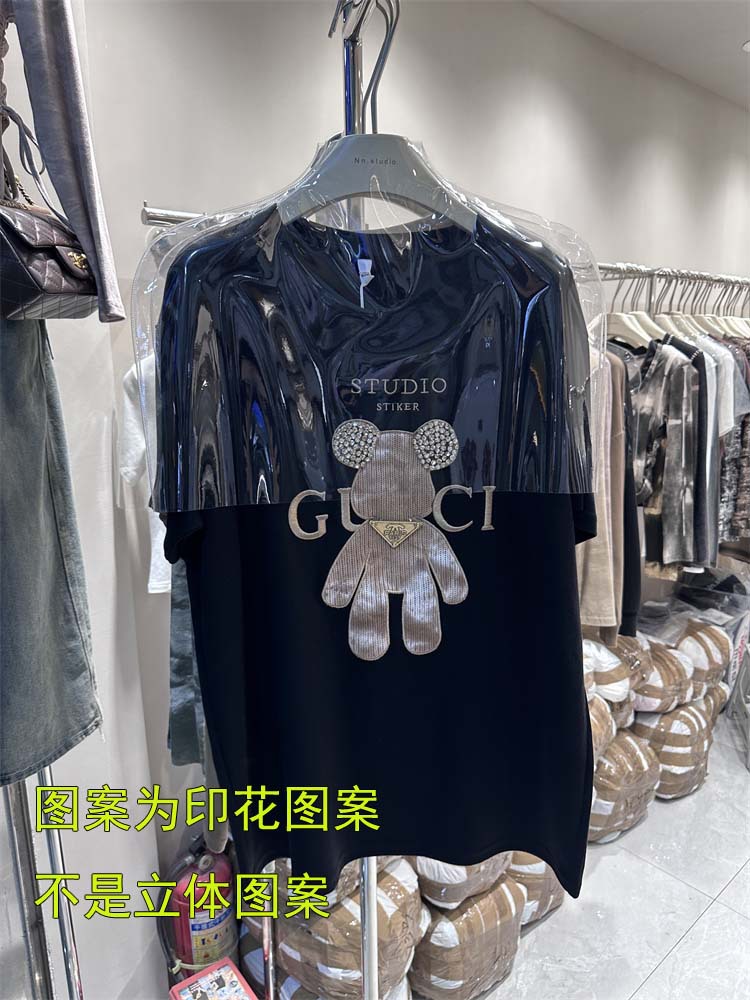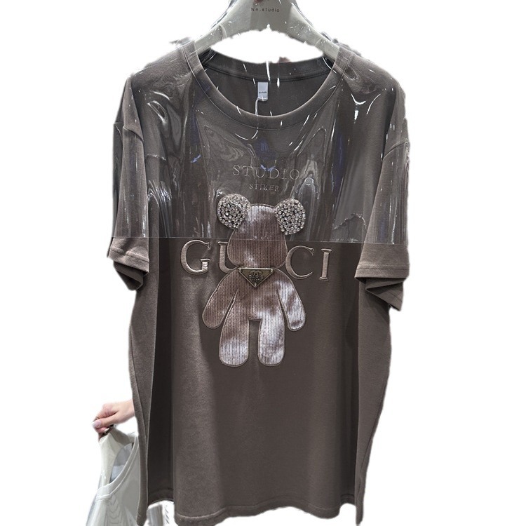 2024 Spring New Bear Printed Half Sleeve T-shirt European Loose Large Edition Medium to Long Short Sleeve Top for Women Summer