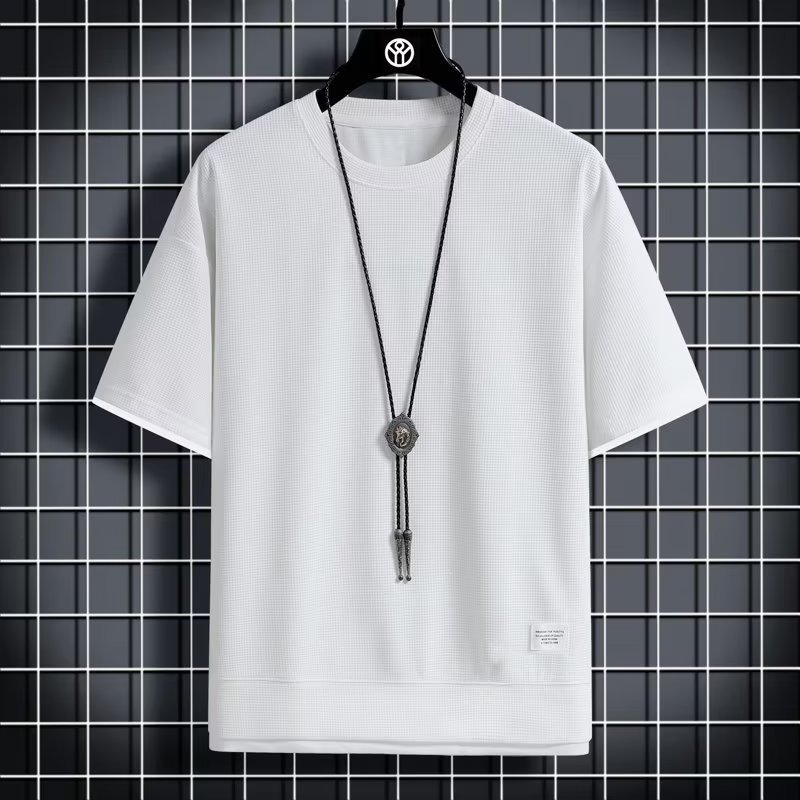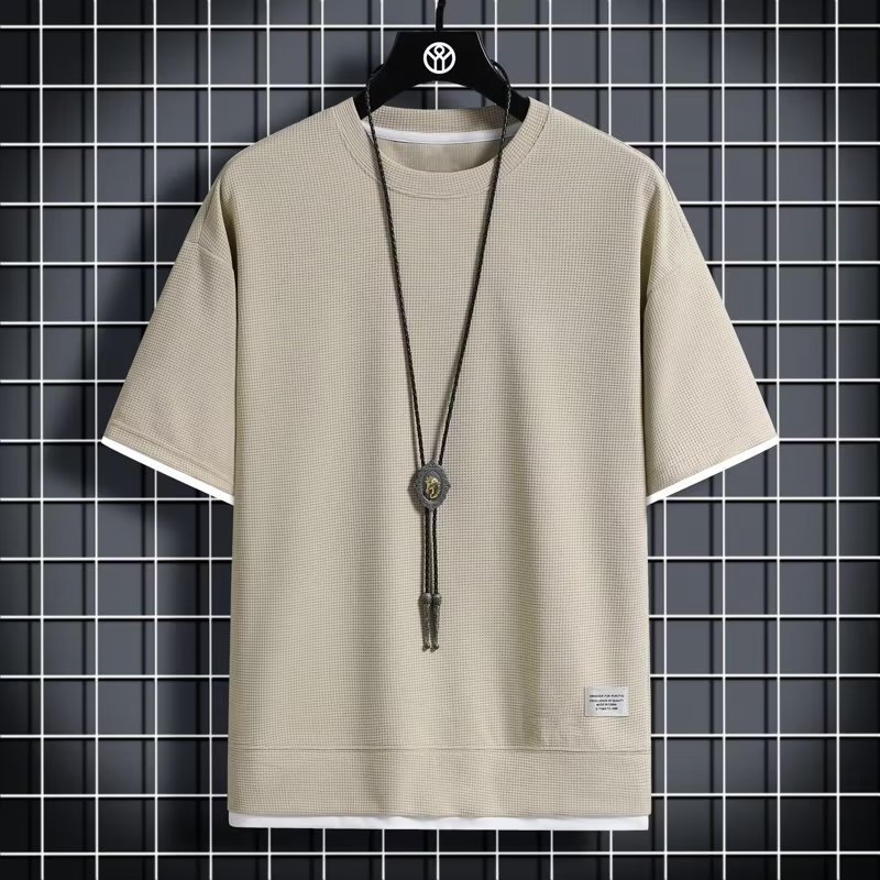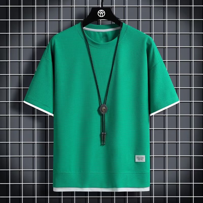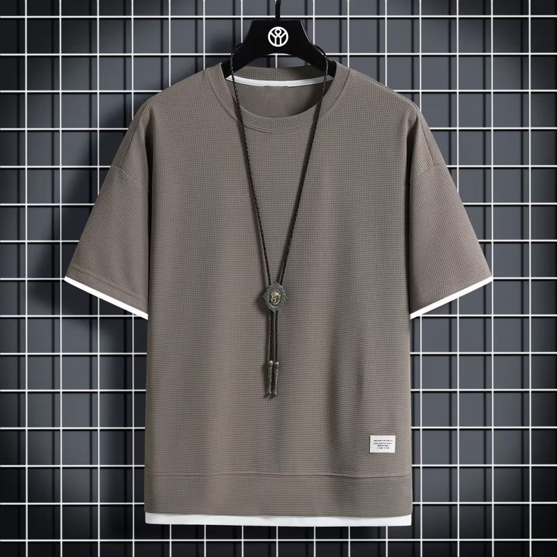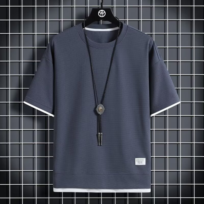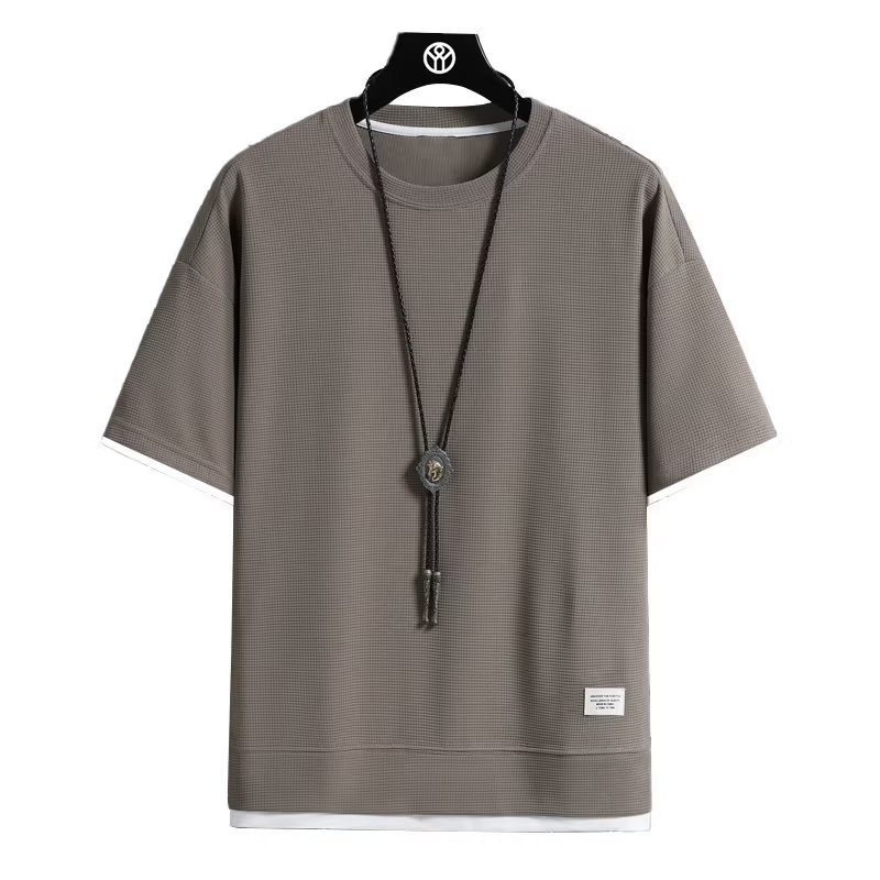 Clothing Waffle round neck short sleeved men's summer new item, fake two piece loose oversized ice silk thin version, five quarter sleeve