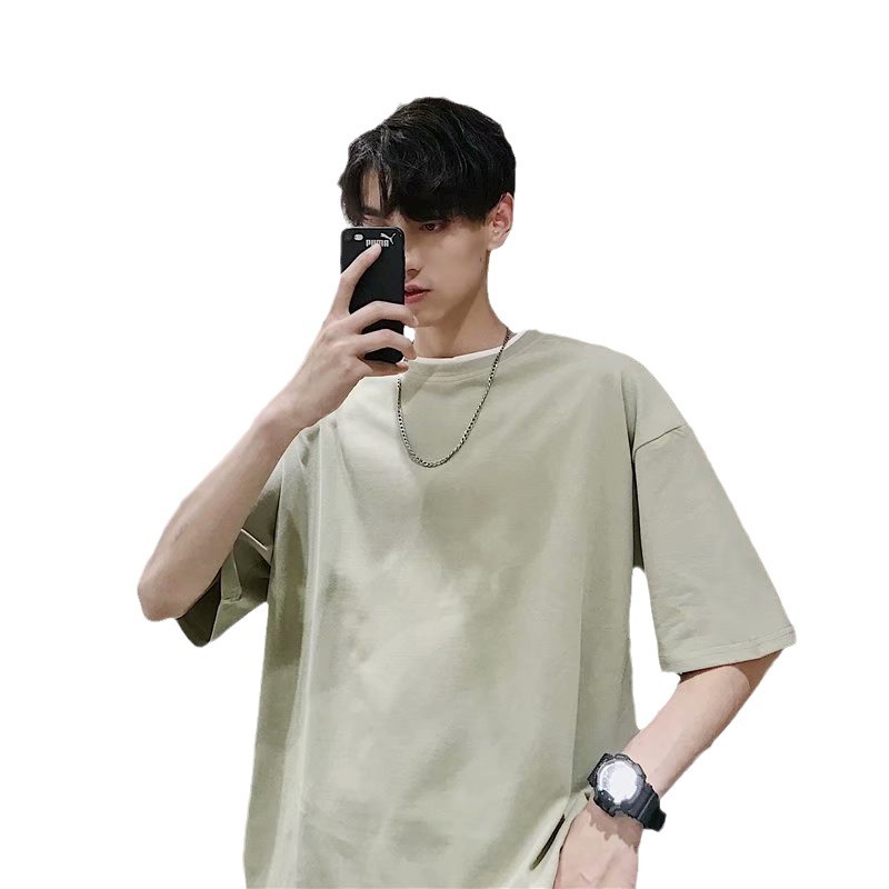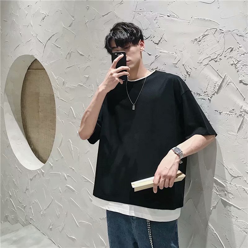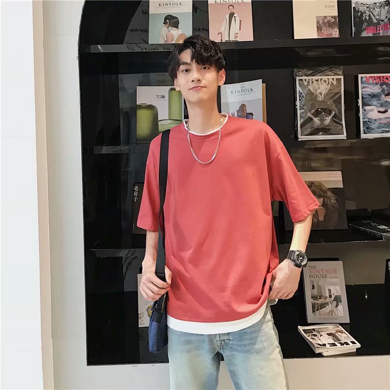 Fake two men's short sleeved t-shirts in solid color trend. T-shirt printed loose fit teenage ins half sleeved summer versatile clothes