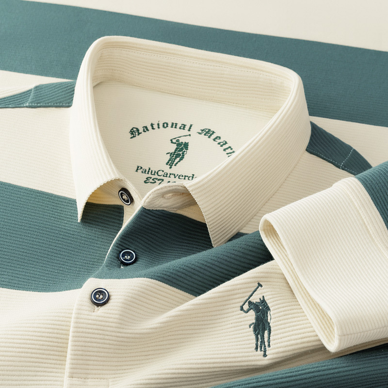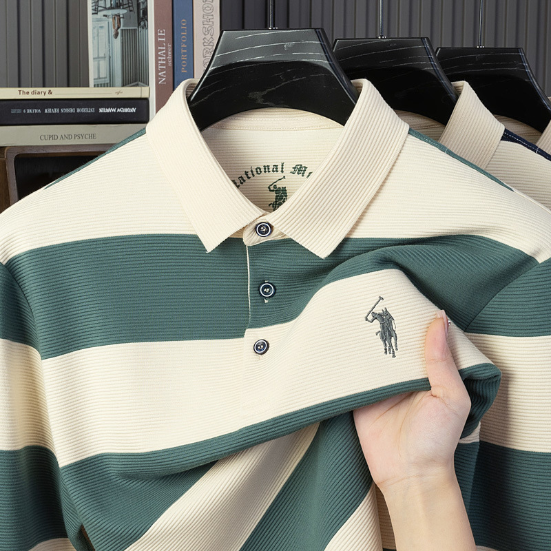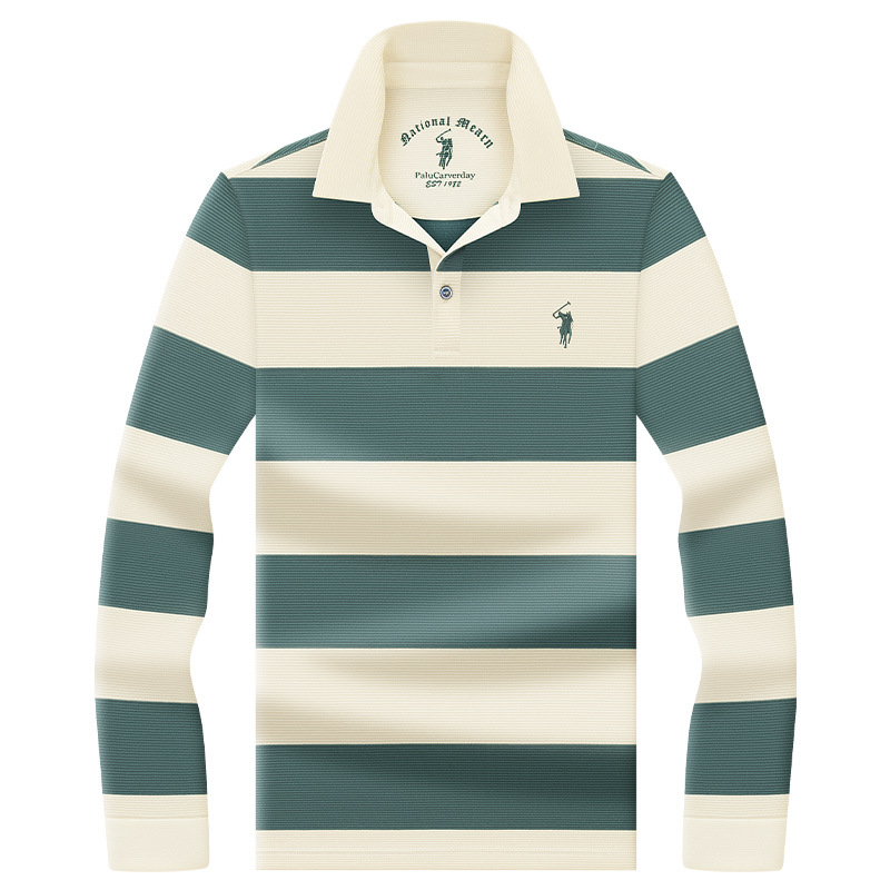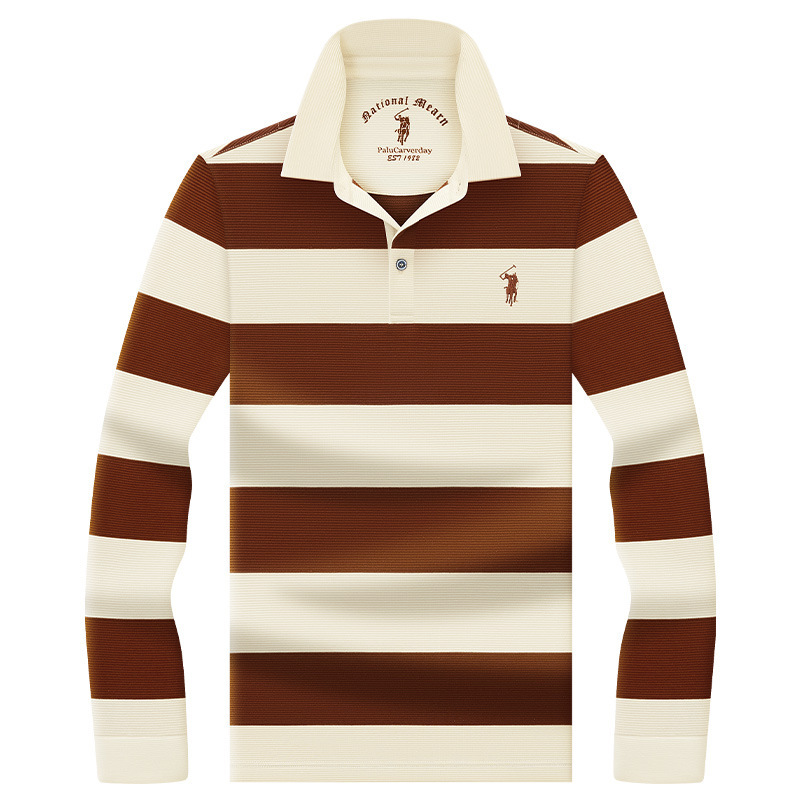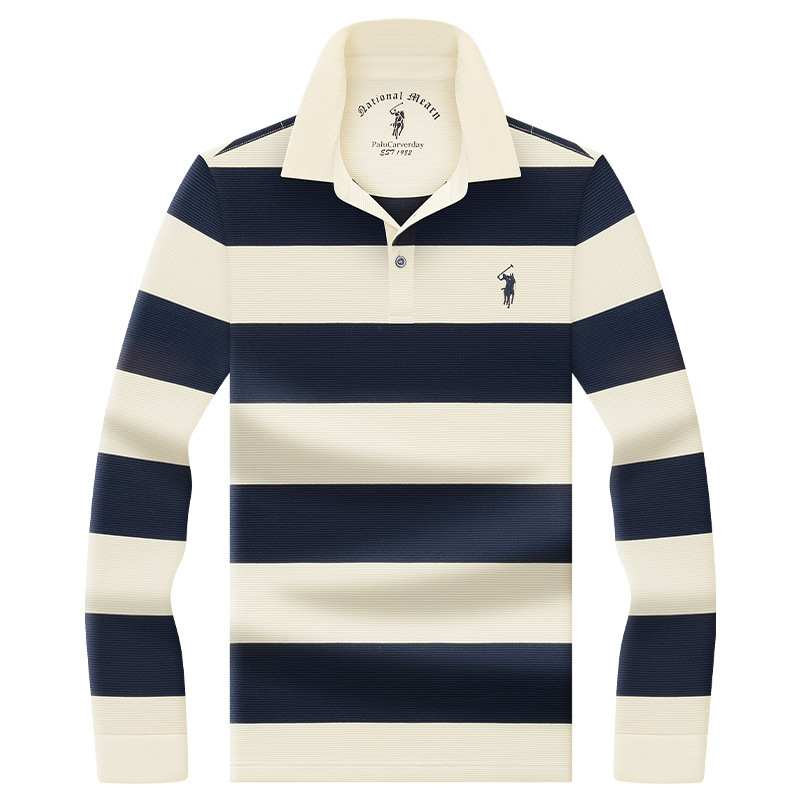 Cross border simple striped spring and autumn men's long sleeved T-shirt with striped lapel and polo shirt, middle-aged business T-shirt