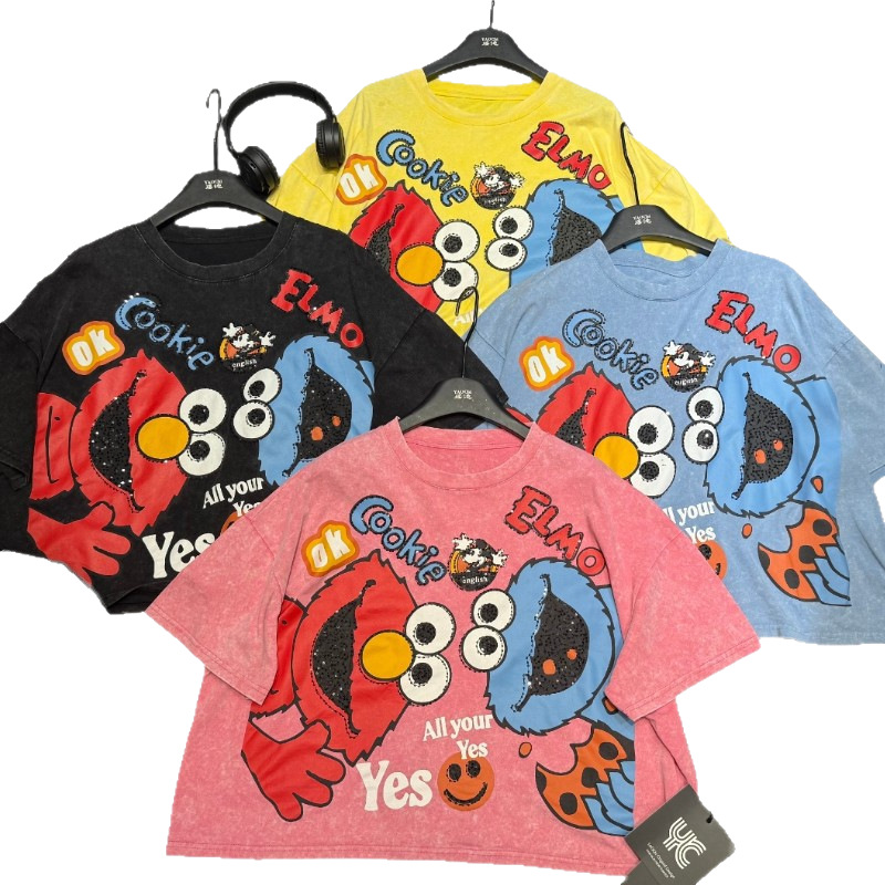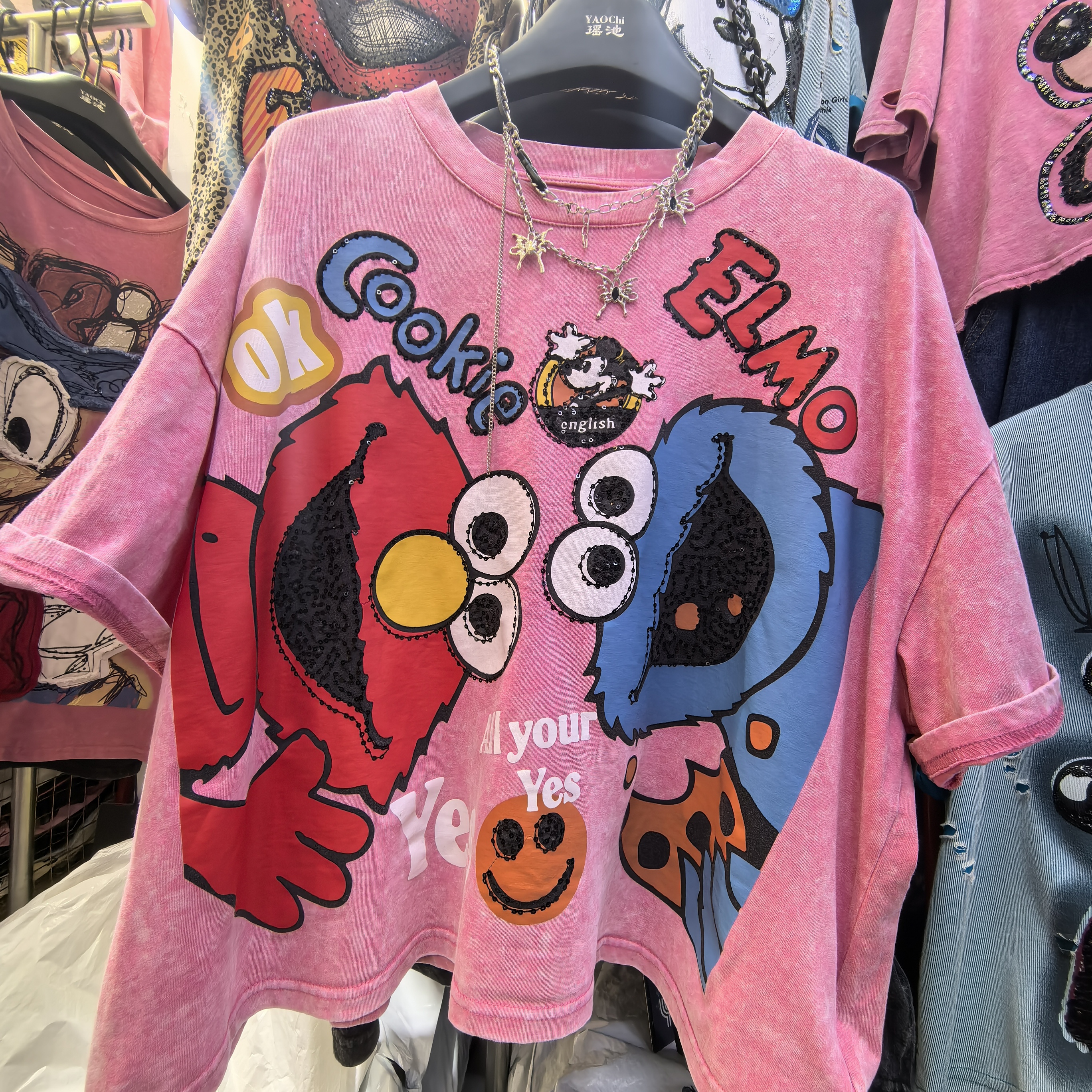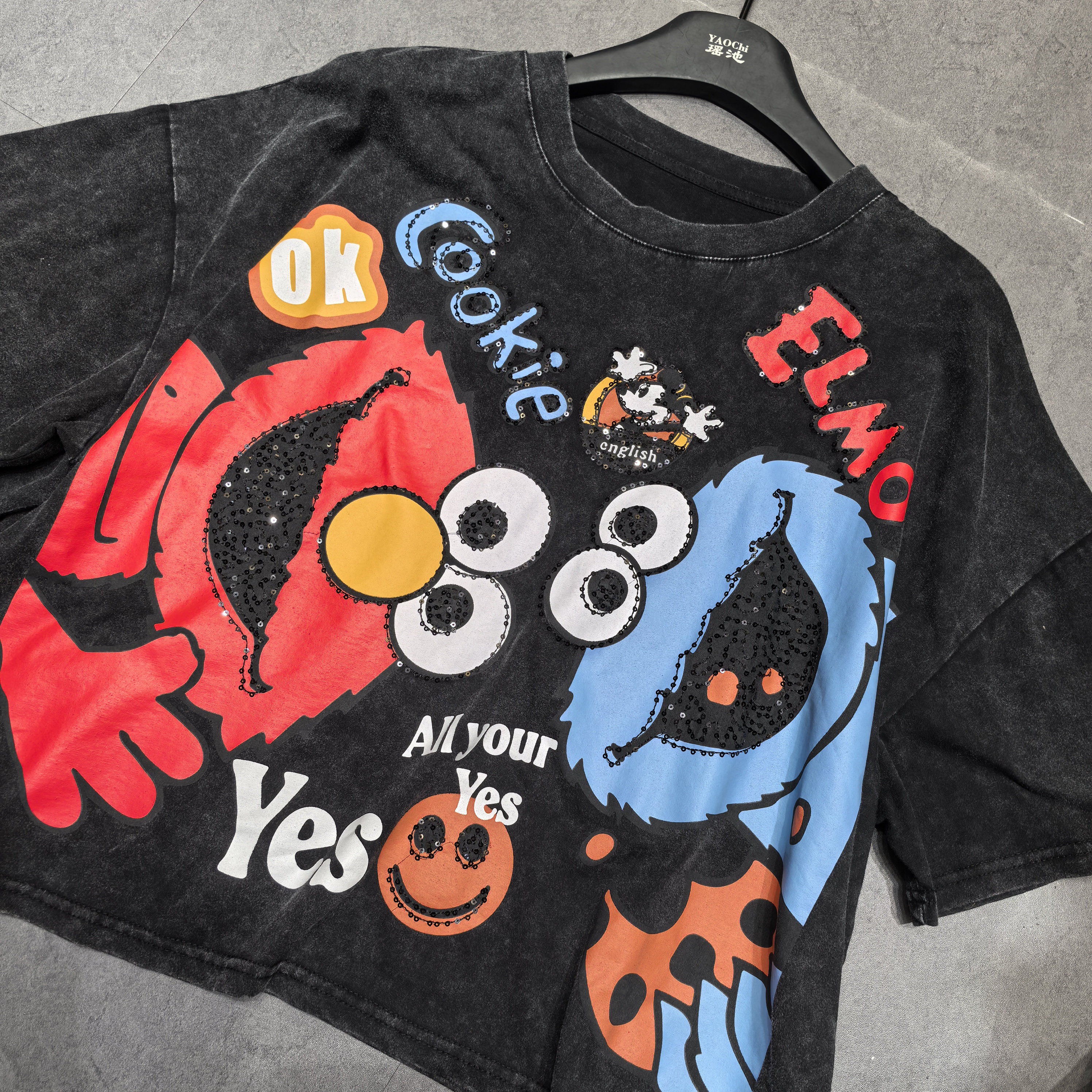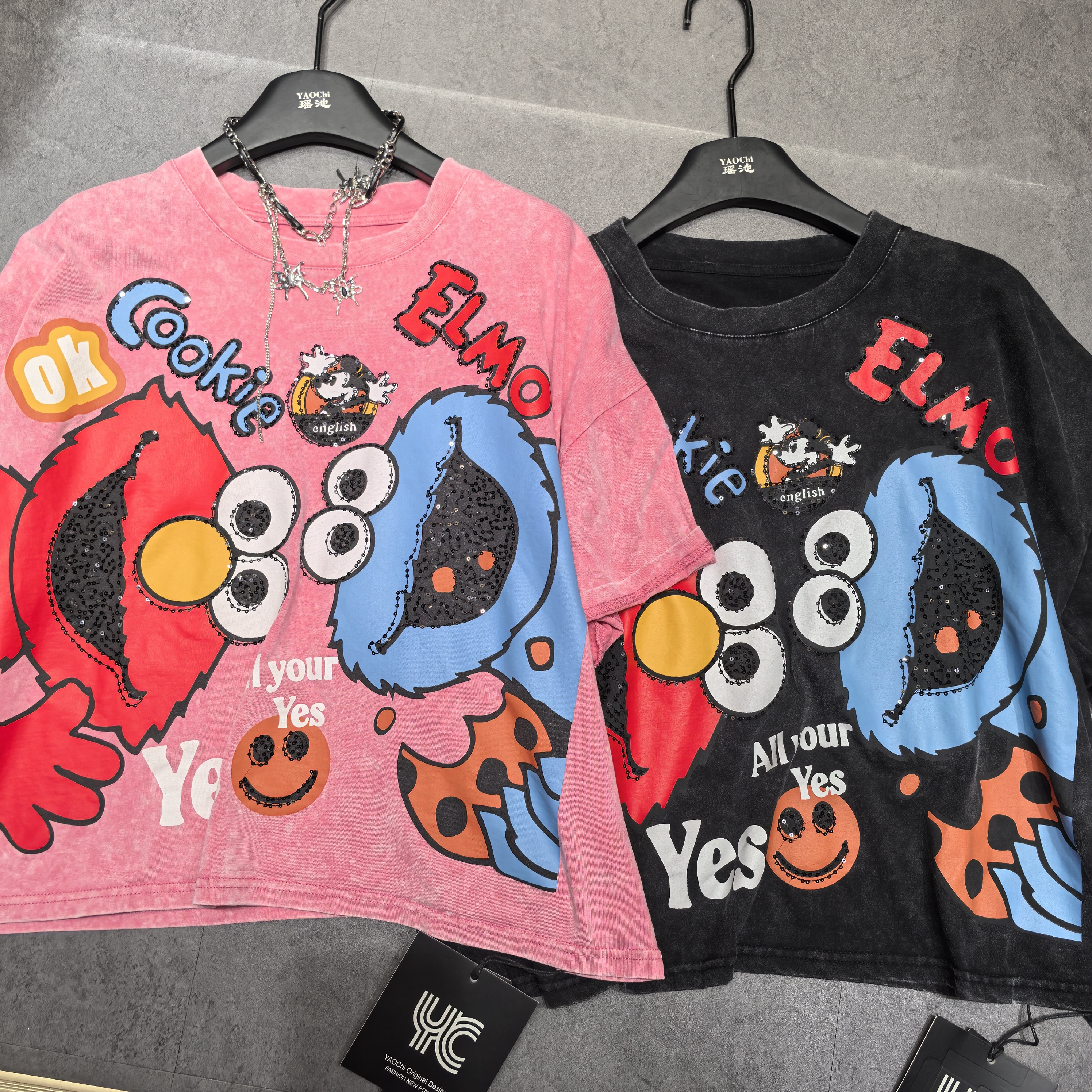 European plus size shirt 2025 summer fashion washed and worn out large print bead embroidery short sleeved trendy T-shirt for women