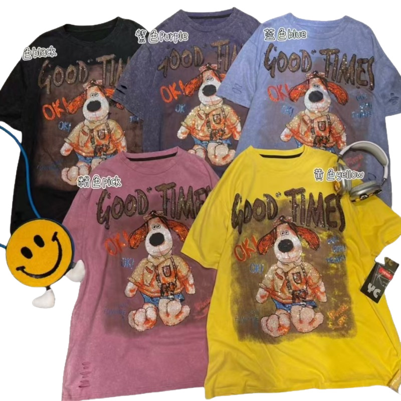 European fashion brand loose fitting European size top 25 summer cartoon pattern hot stamping diamond washed T-shirt colorful trendy versatile short sleeved shirt