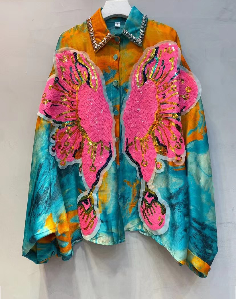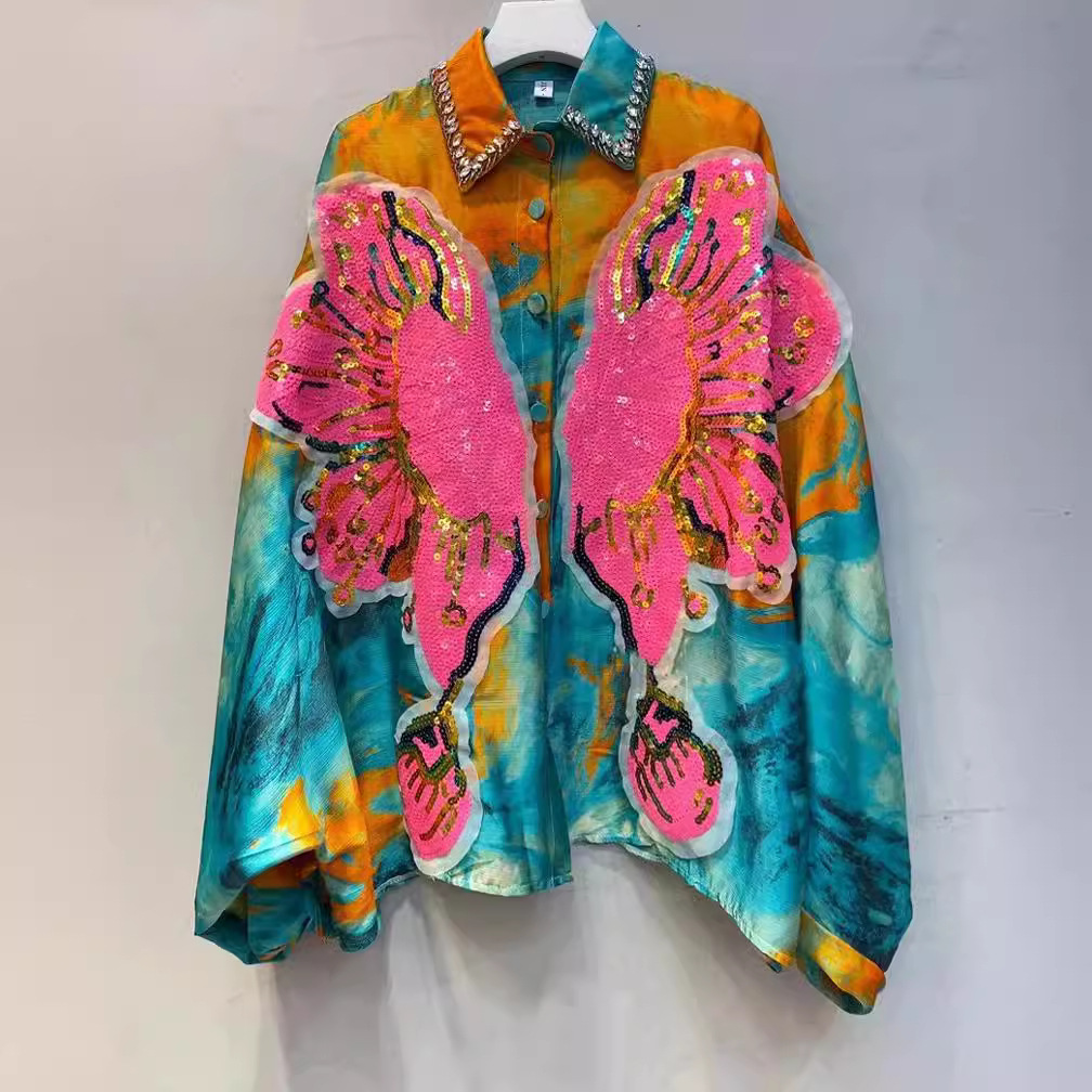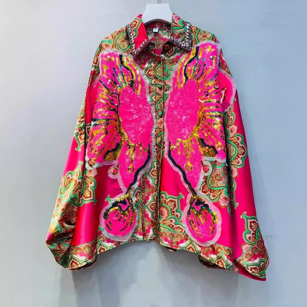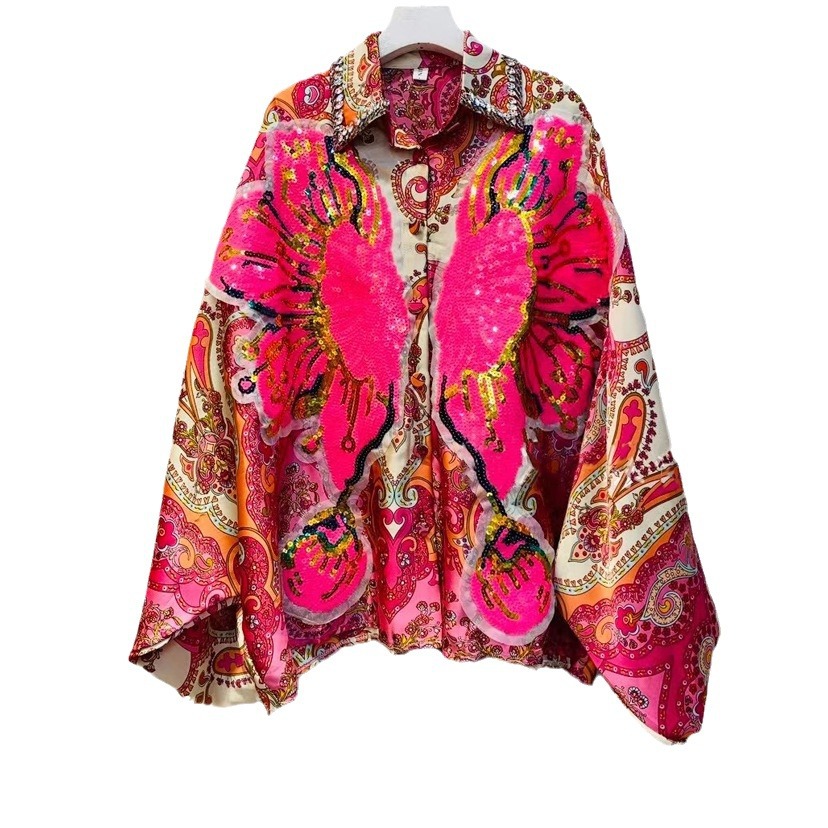 Thailand Chaopai 2024 Spring New Vintage Printed Shirts Women's Beaded Sequins Versatile Loose Shirts