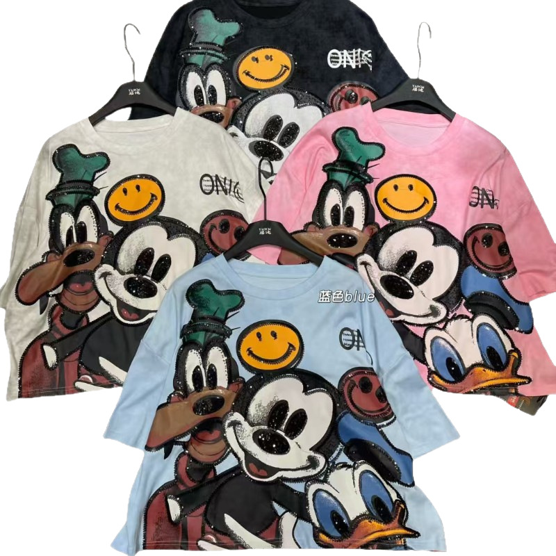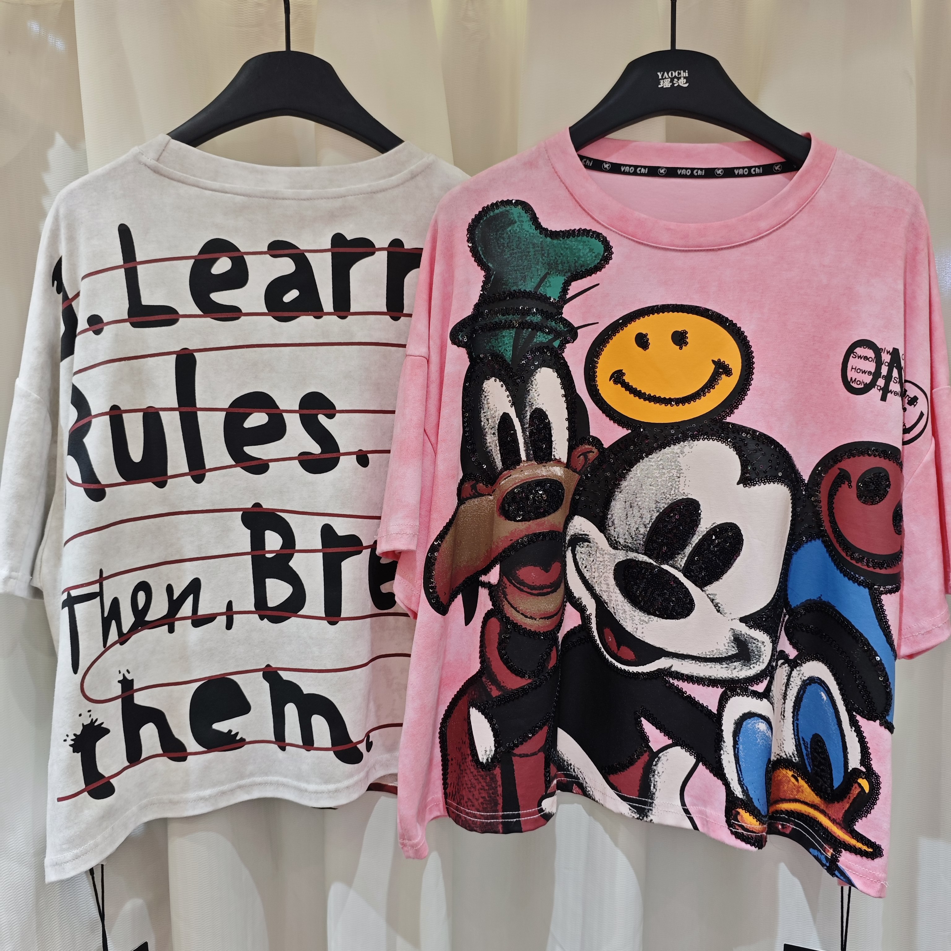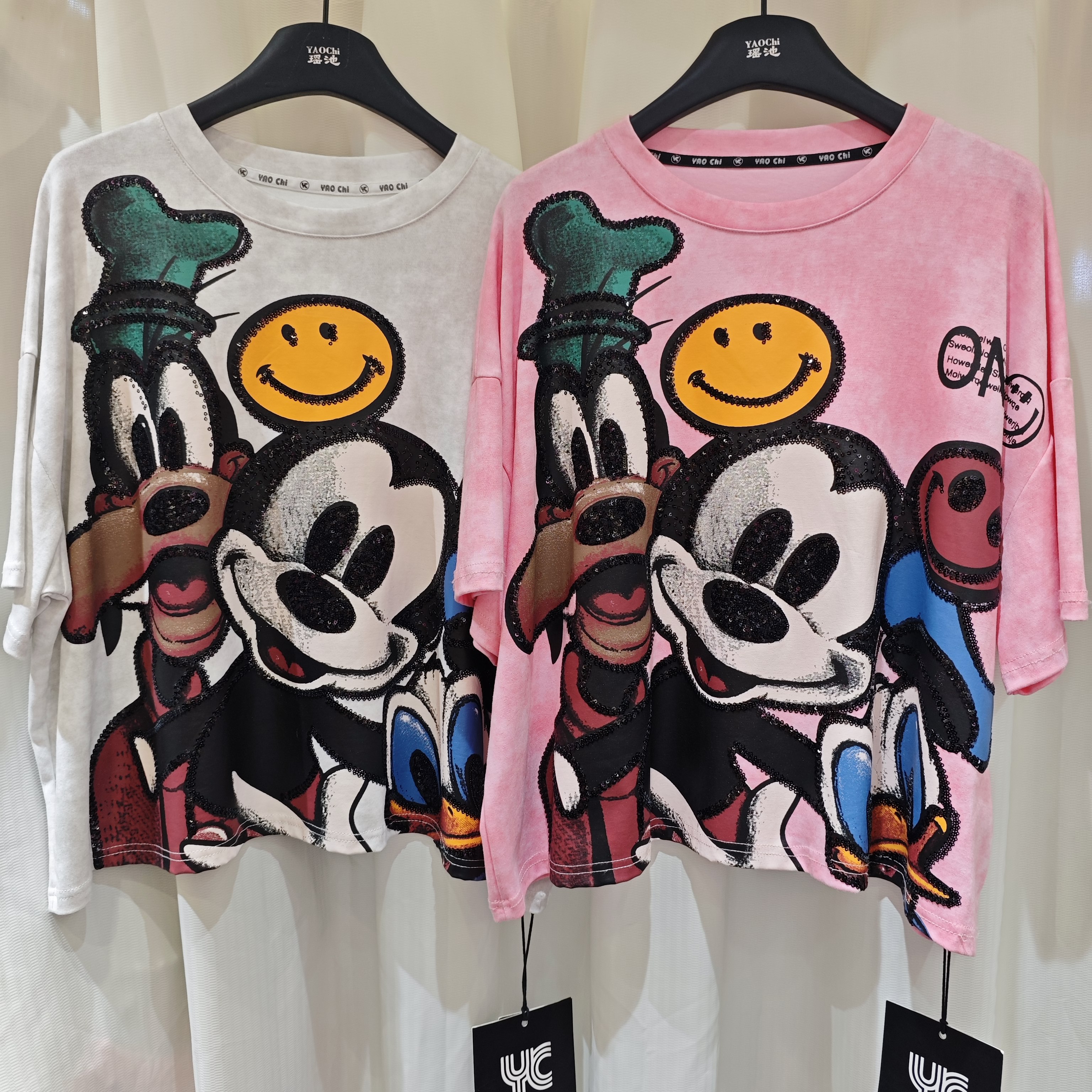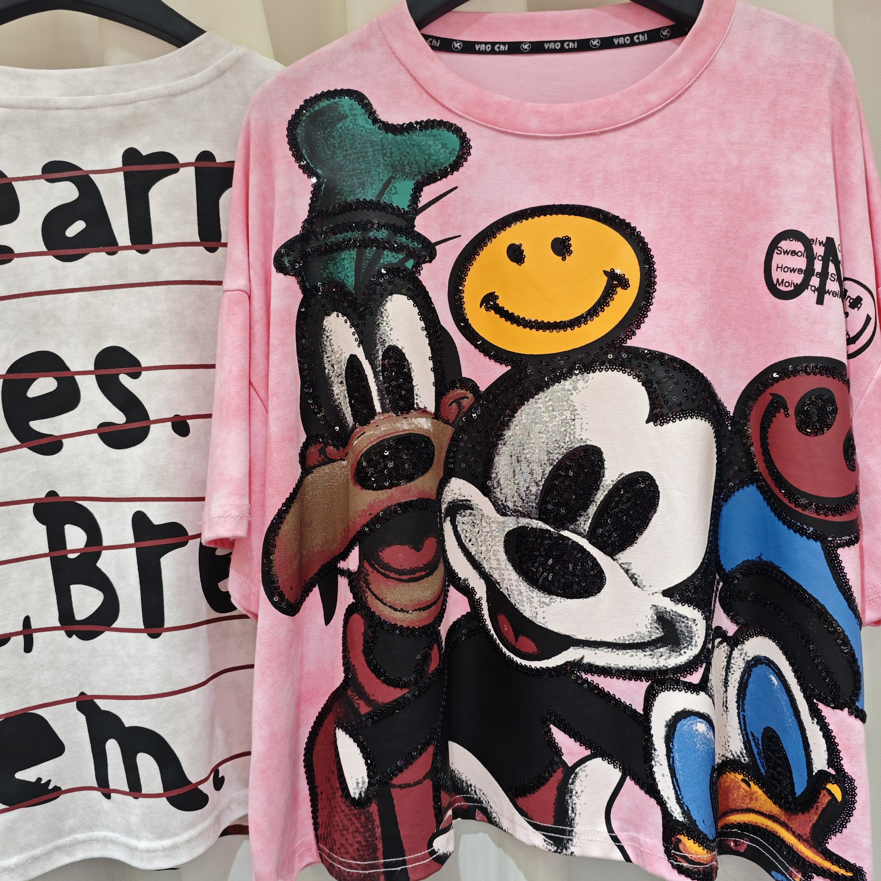 Summer Korean loose fit age reducing Mickey print round neck five quarter sleeve top T-shirt versatile casual top for women