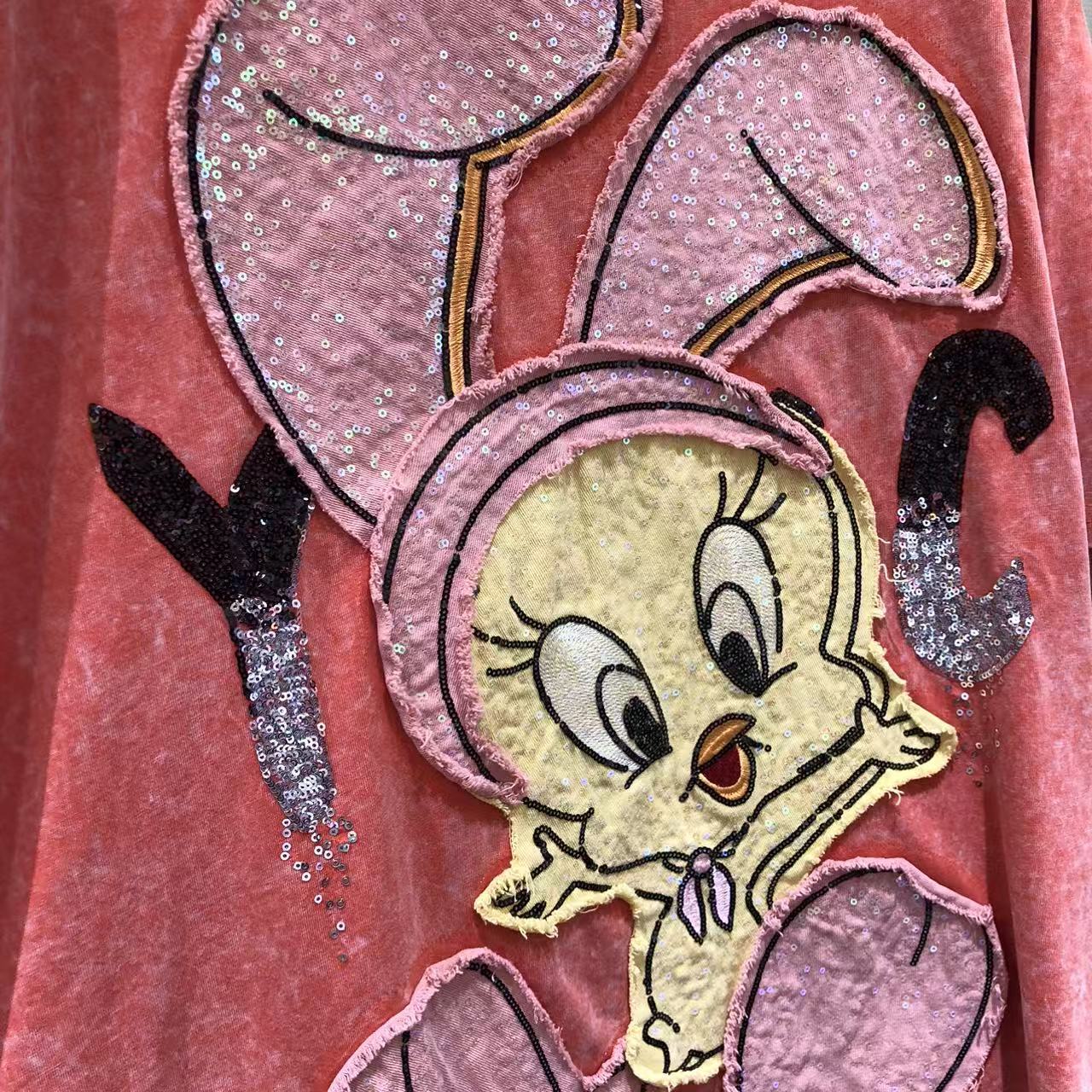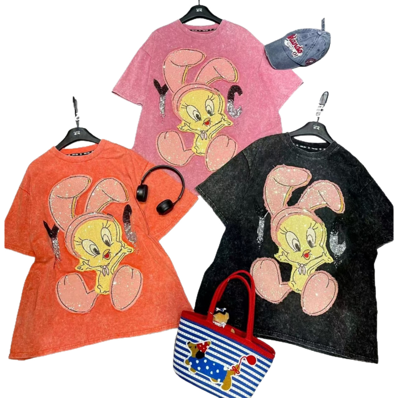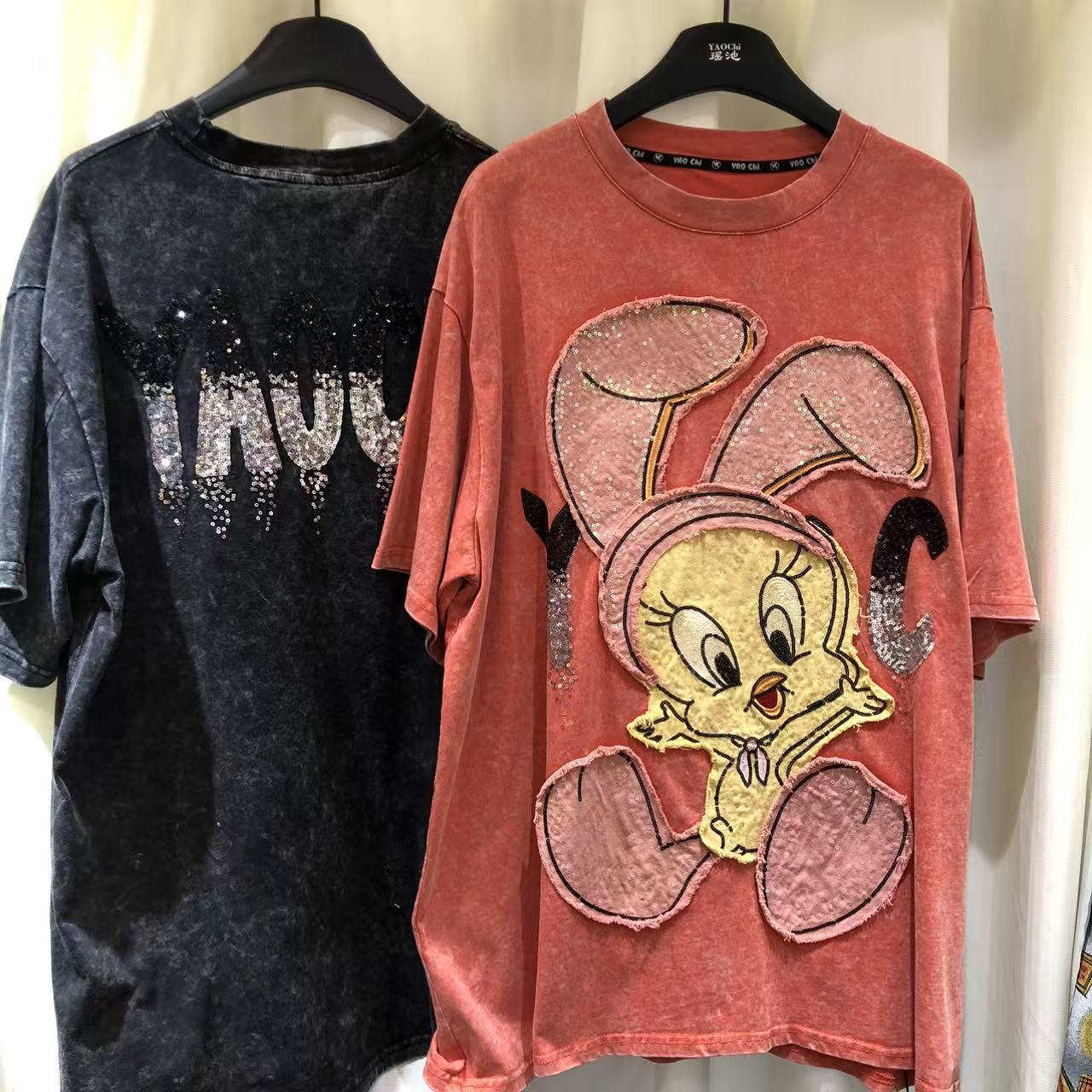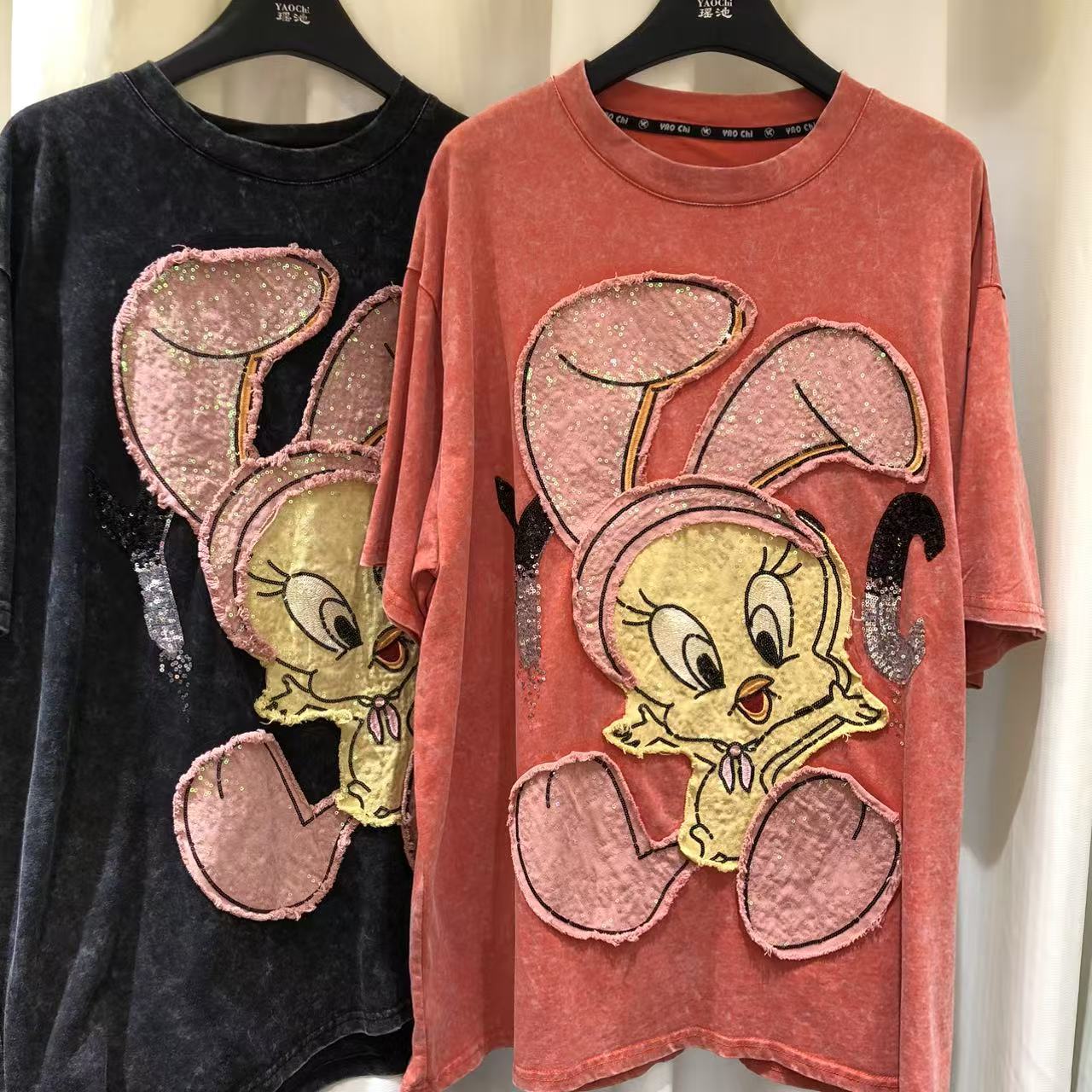 Sweet plus size T-shirt short sleeved women's autumn new style loose cartoon top trendy rabbit patch tie dye
