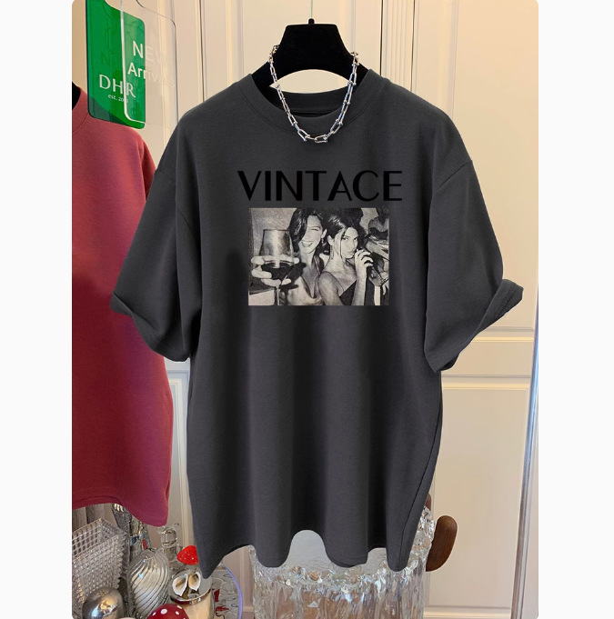 European American fashion brand short sleeved T-shirt for women's summer 2025 new mid to long round neck versatile casual anti-aging top
