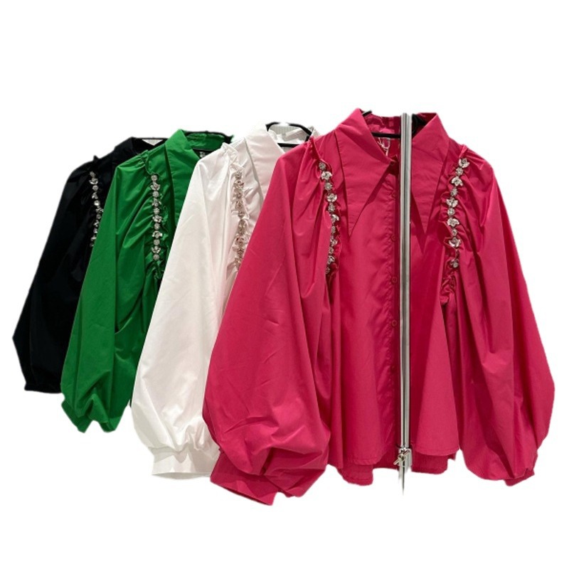 Autumn new niche lapel lantern sleeve long sleeved shirt with black fungus edge heavy industry diamond inlaid chain shirt A3 # 5150