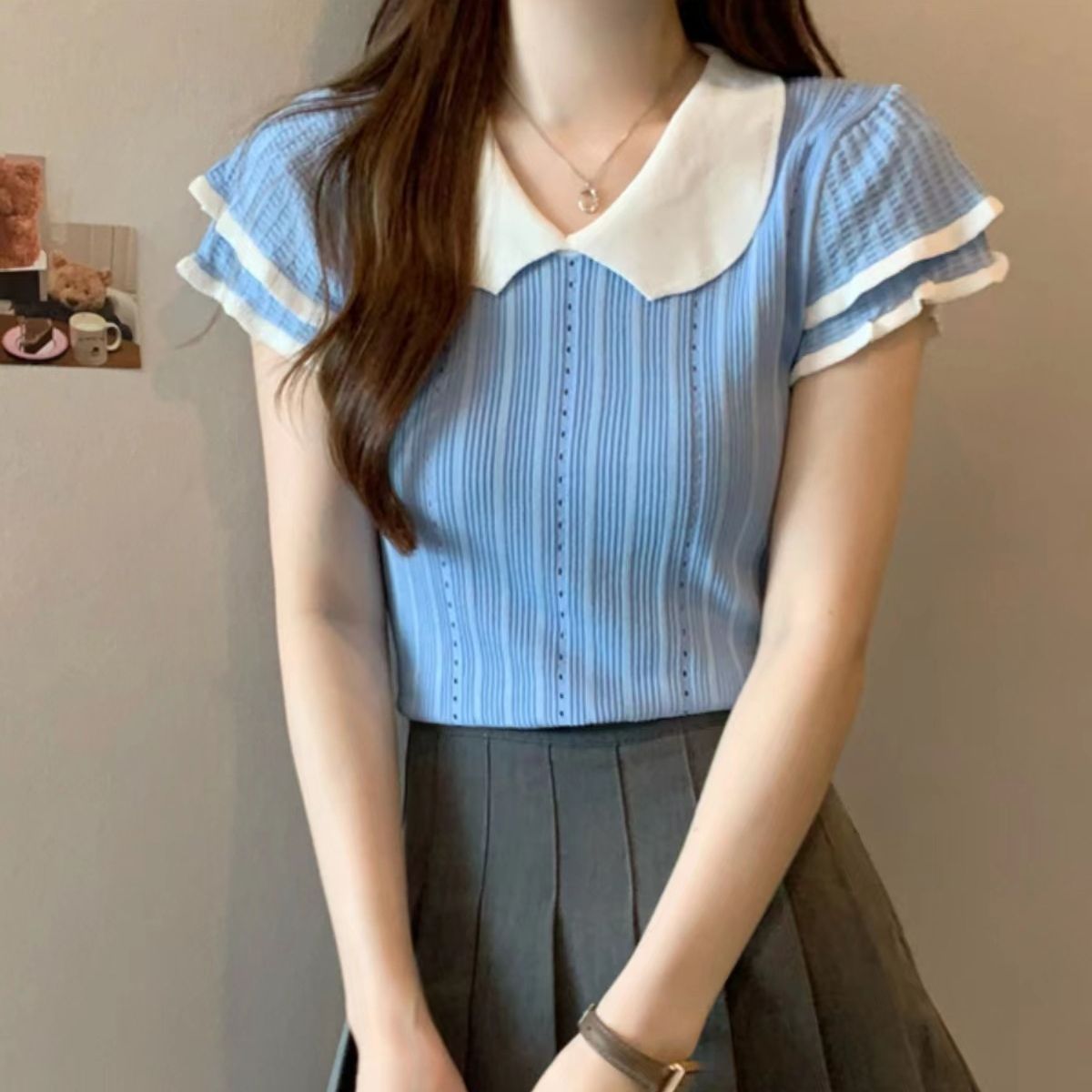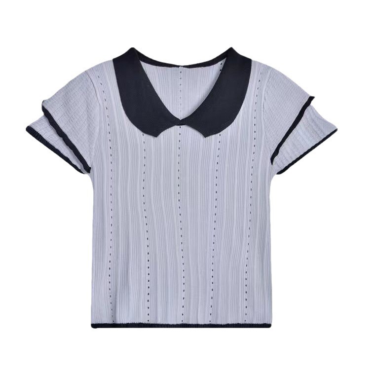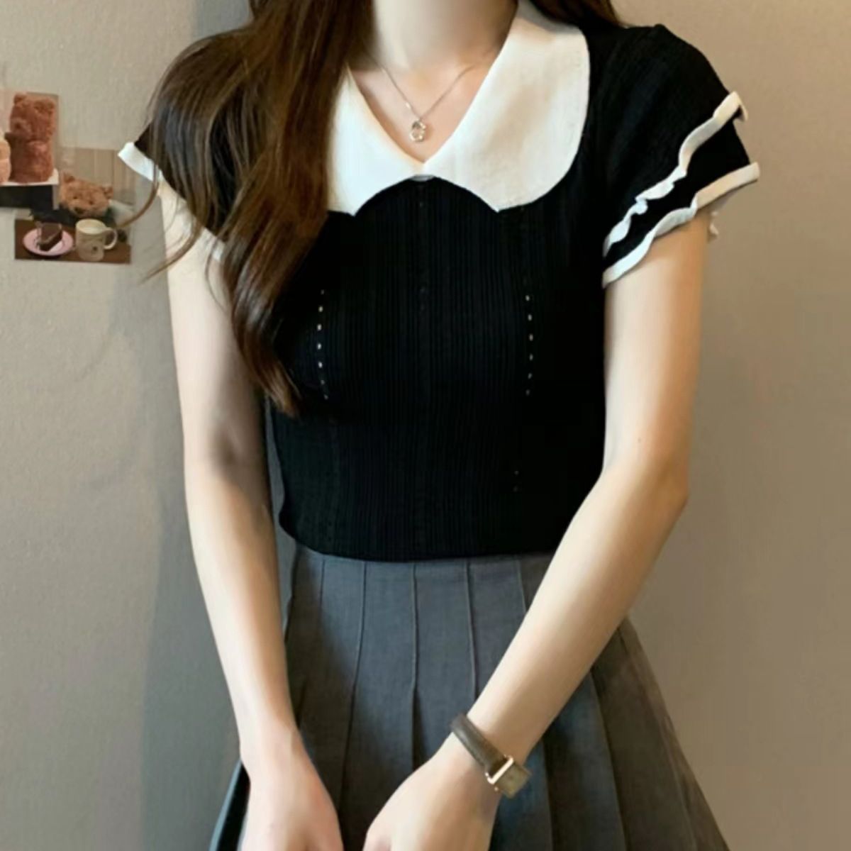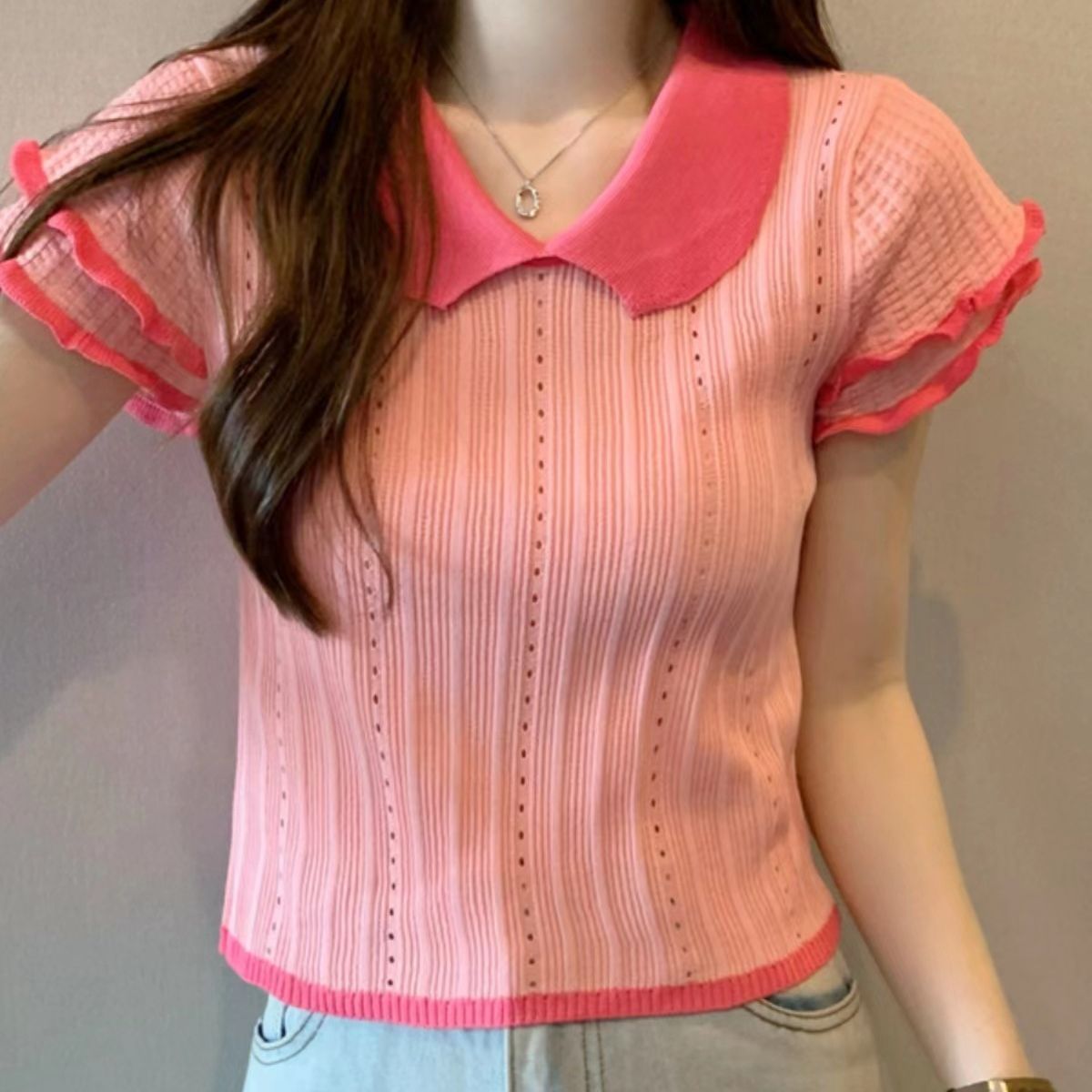 Design sense niche POLO collar contrasting short sleeved knitted sweater for women's summer new unique and chic casual versatile top