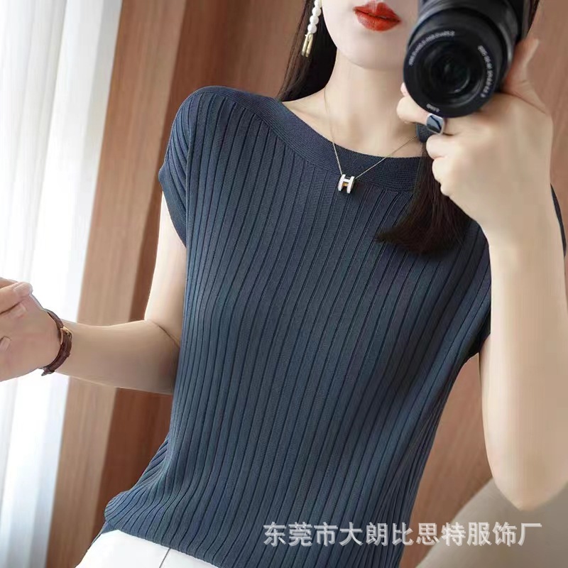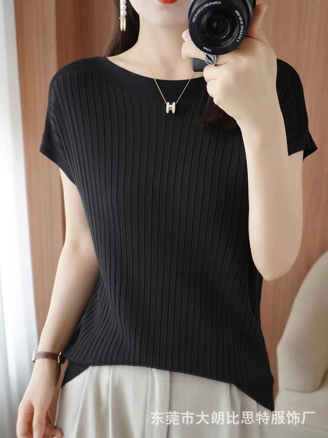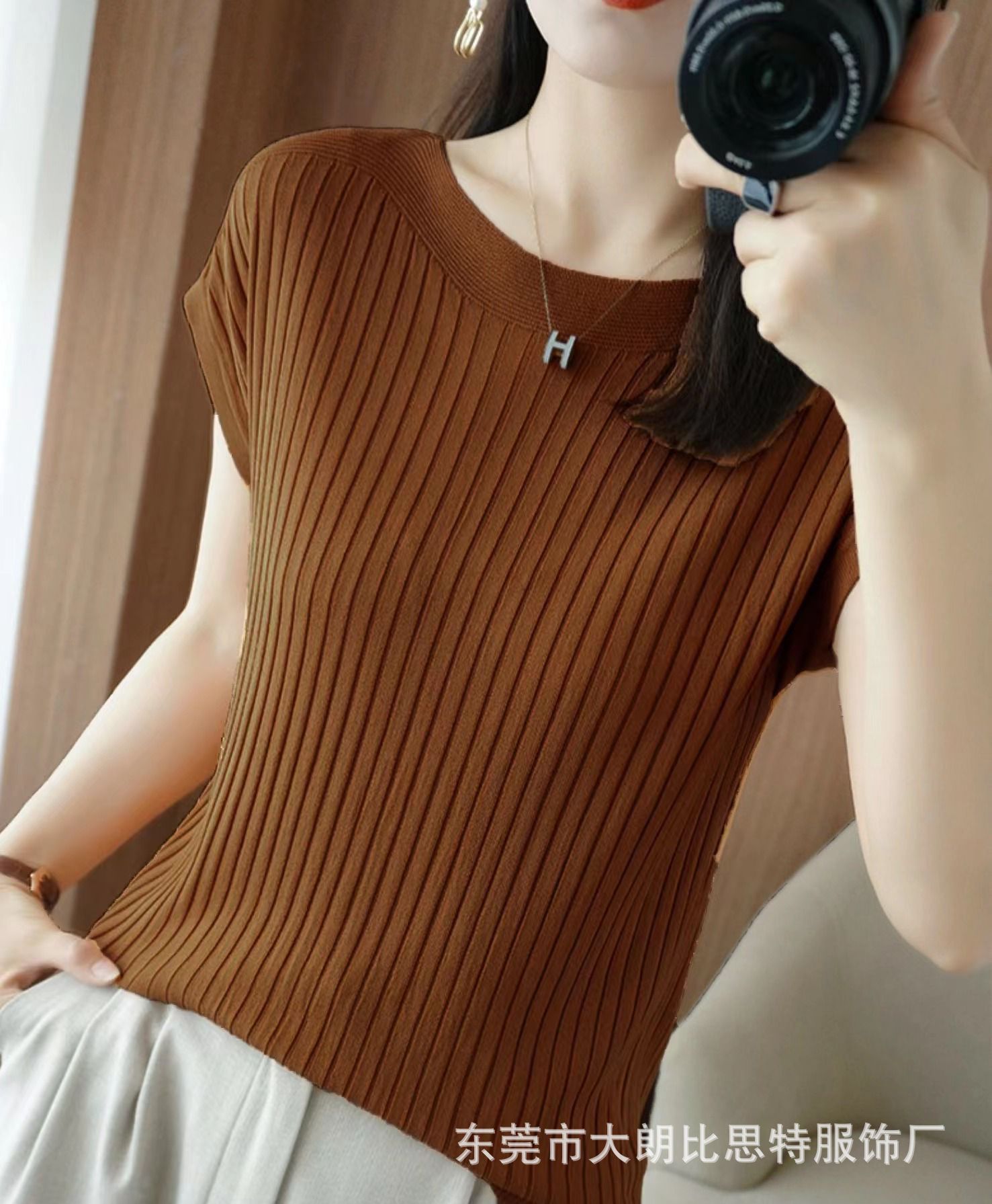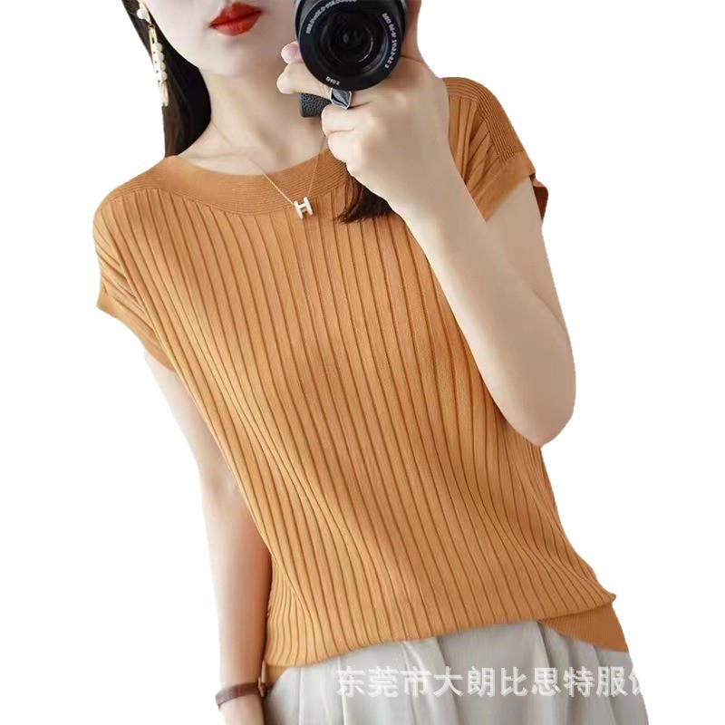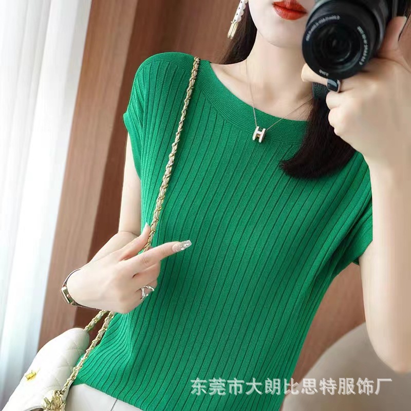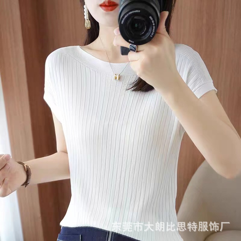 One neck ice silk knitted short sleeved women's summer thin style versatile T-shirt top 2023 new loose half sleeved