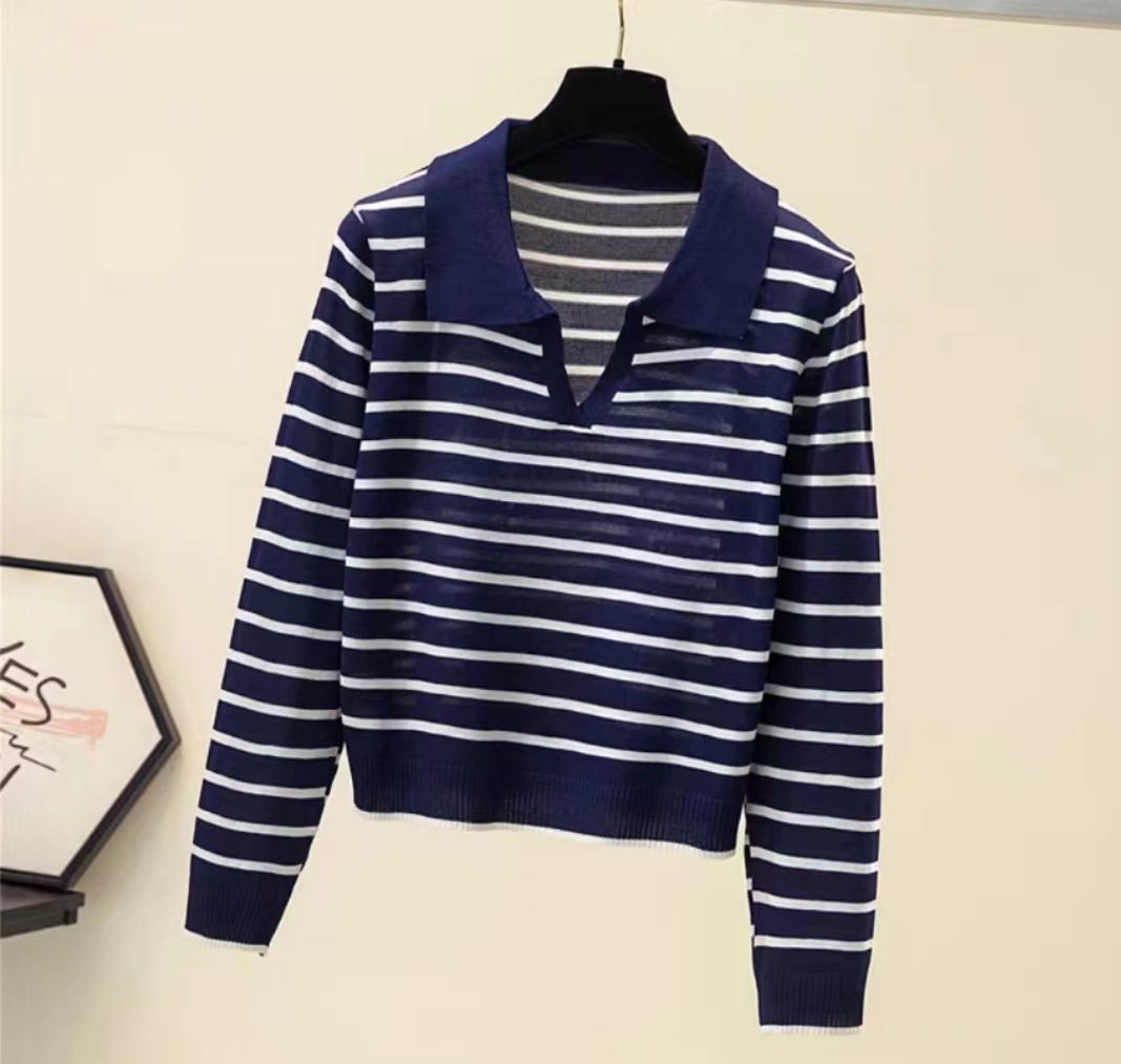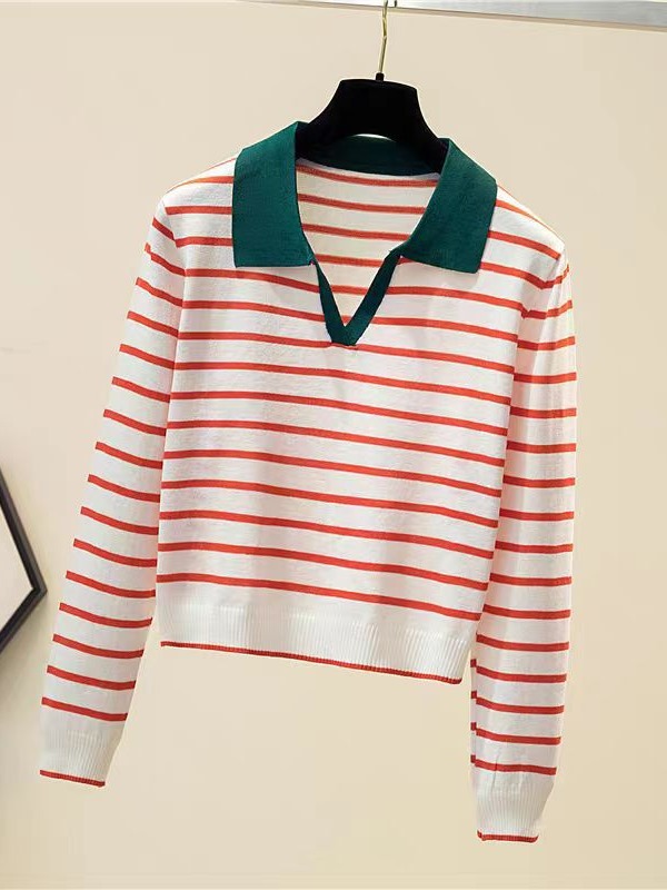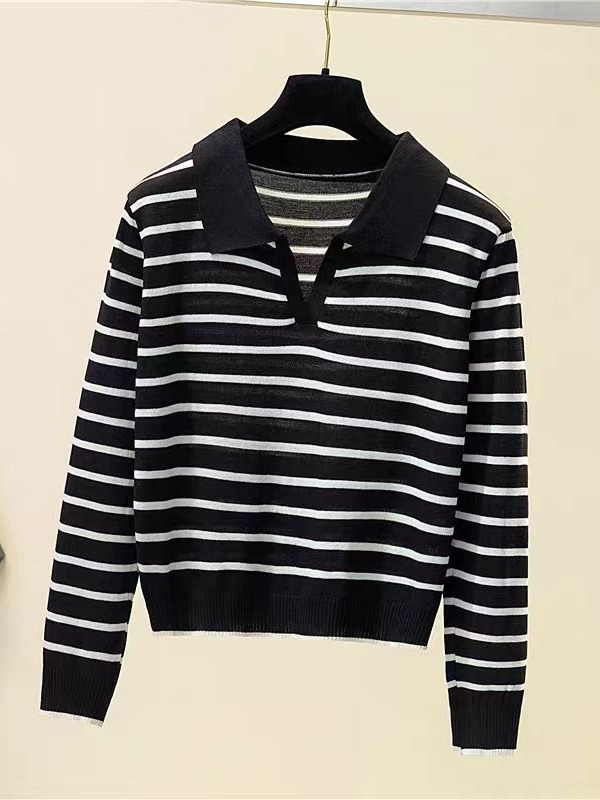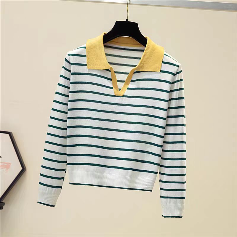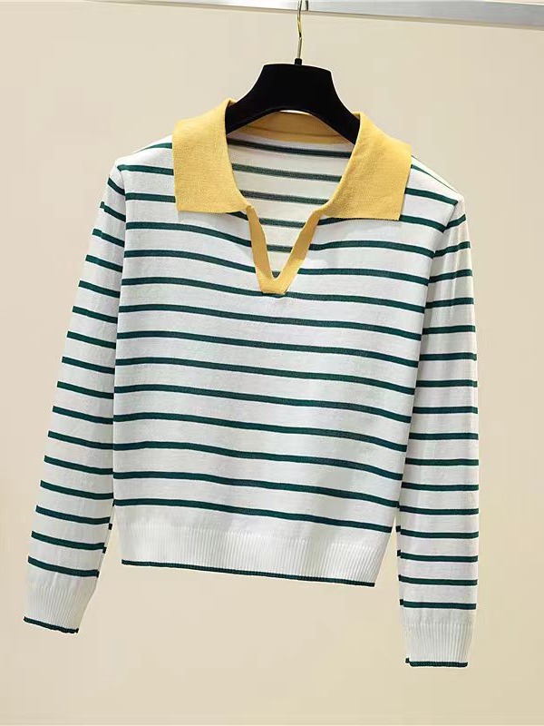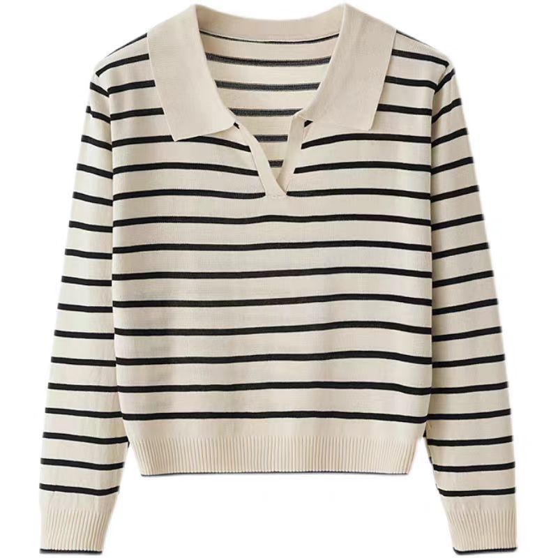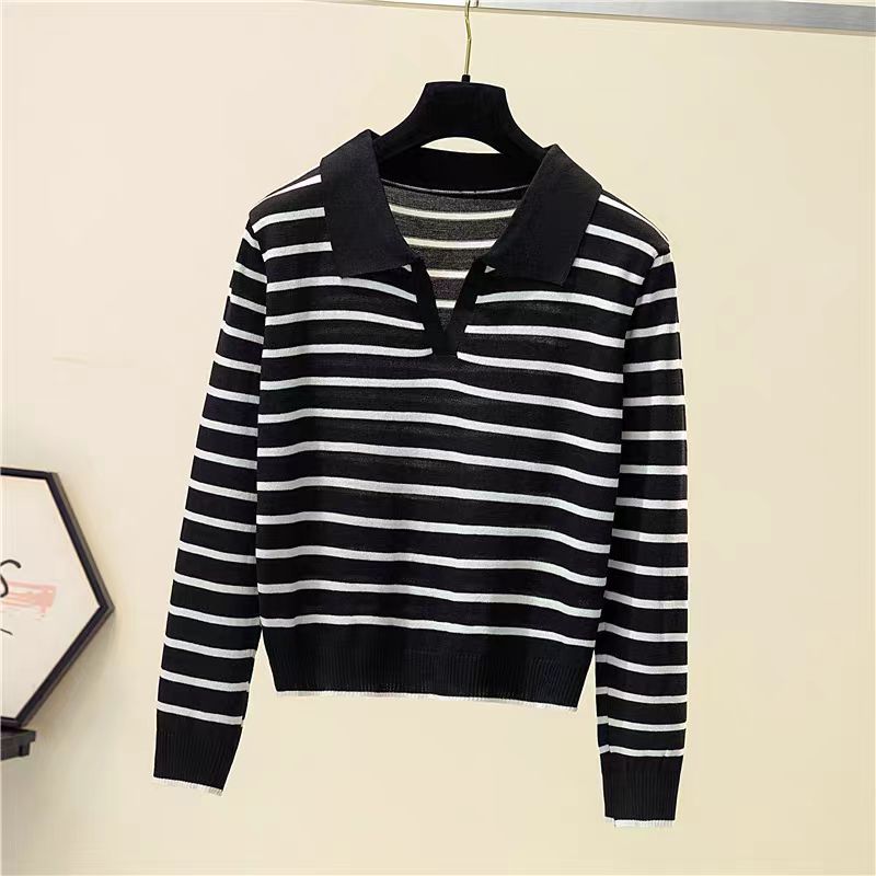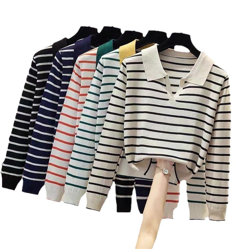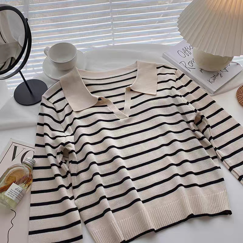 Polo collar striped sweater knitted sweater women's 2023 autumn and winter new item, lapel base shirt, V-neck short inner top