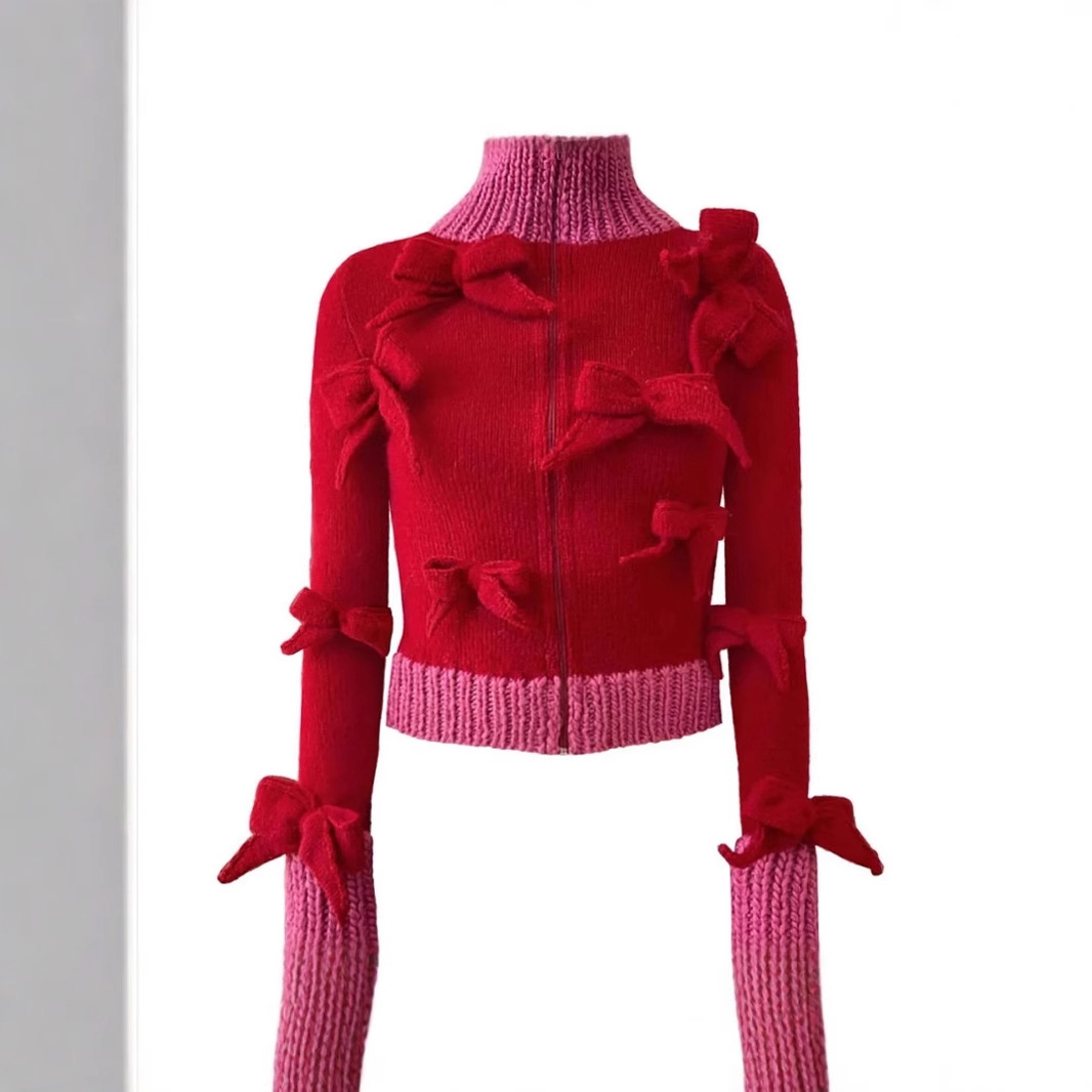 In stock 2025 European and American fashion hot selling women's long sleeved butterfly knot zipper autumn and winter warm cardigan high neck jacket