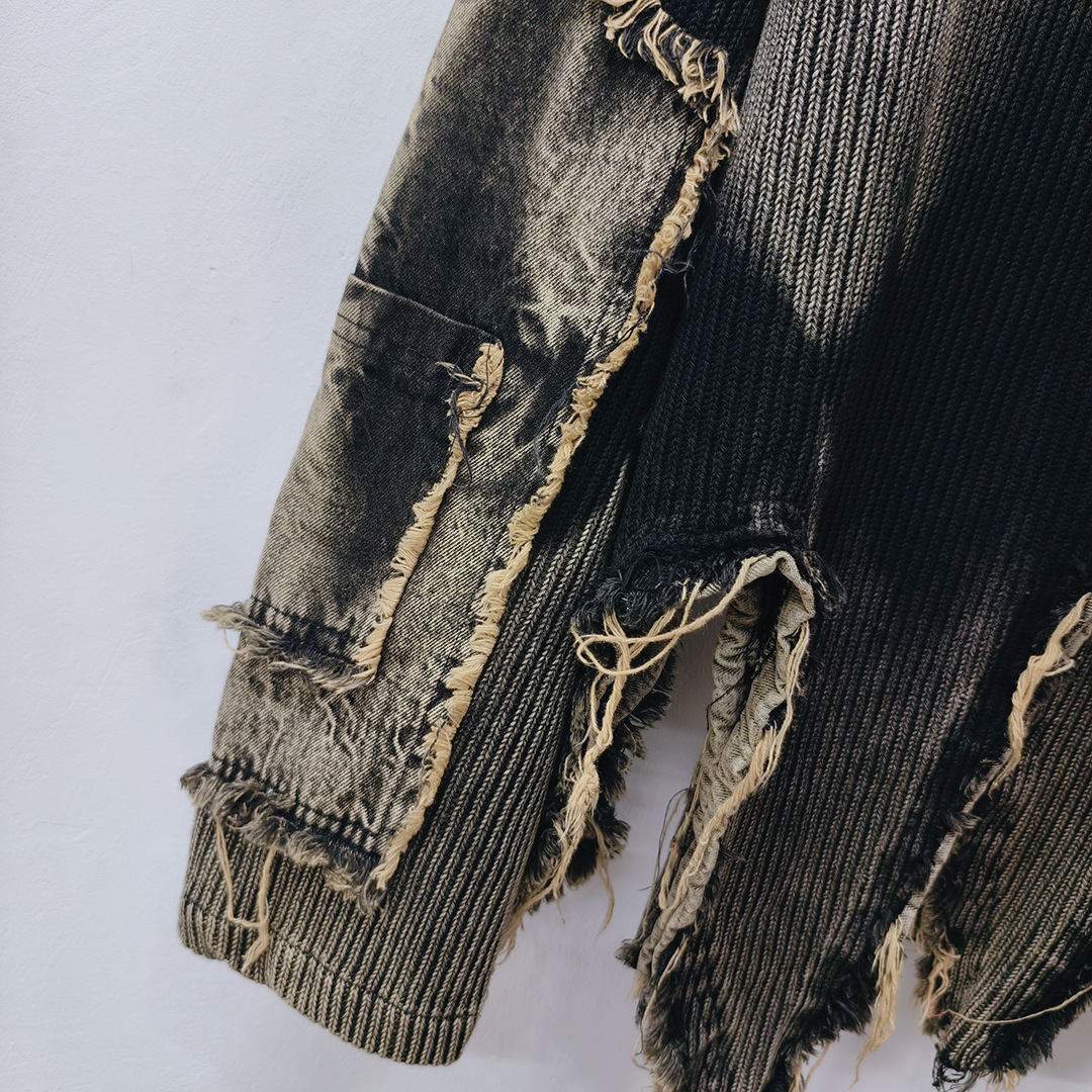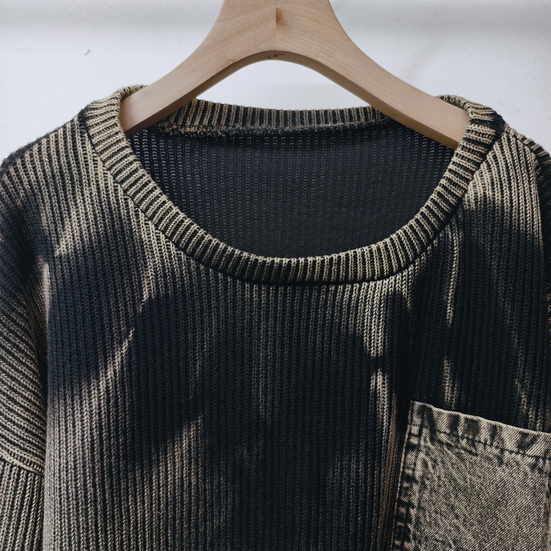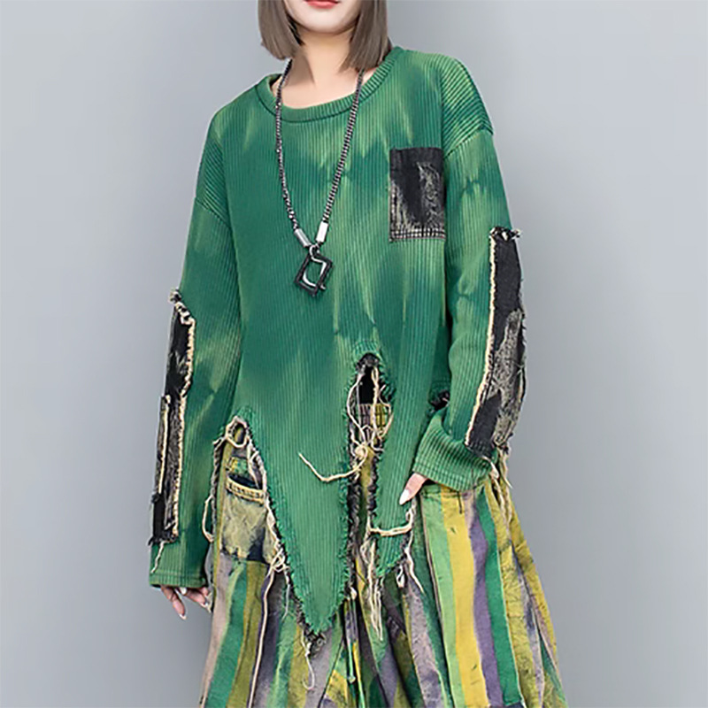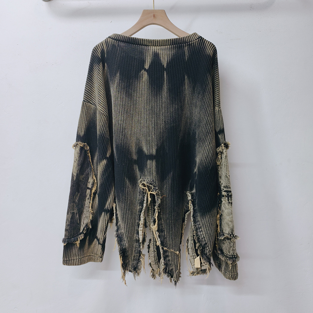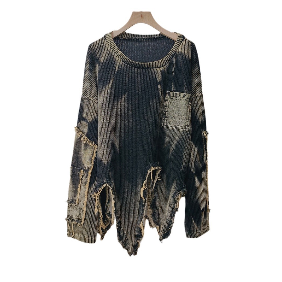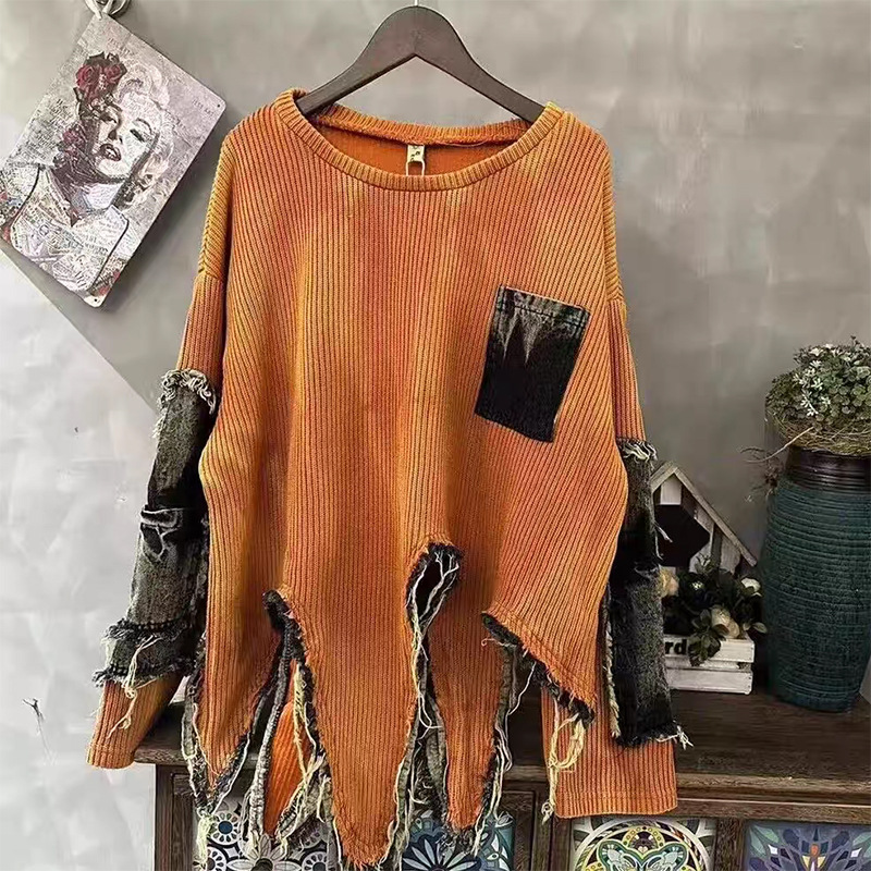 Personalized trendy vintage tie dye patchwork denim irregular hem round neck long sleeved knitted sweater for women in autumn and winter
