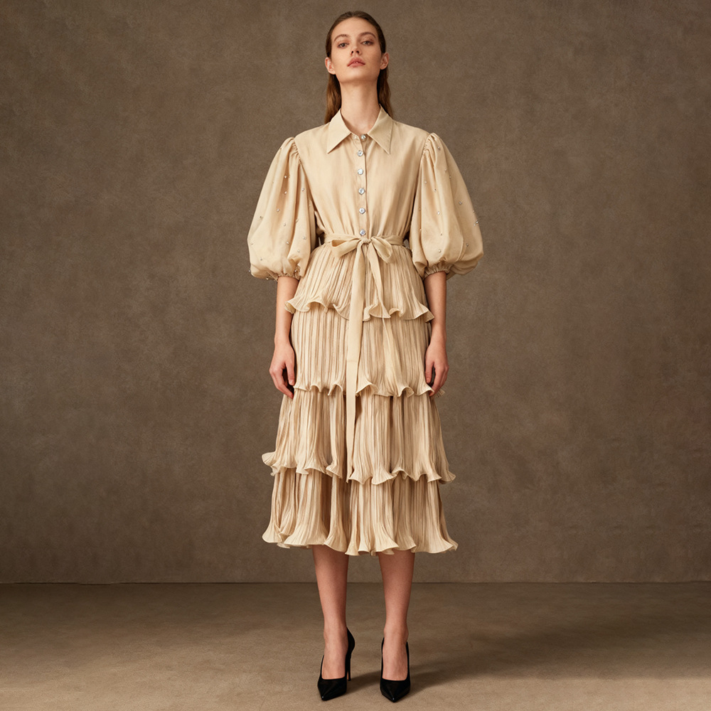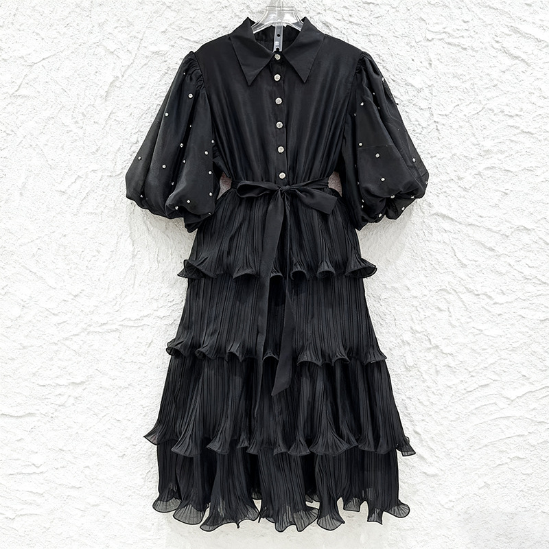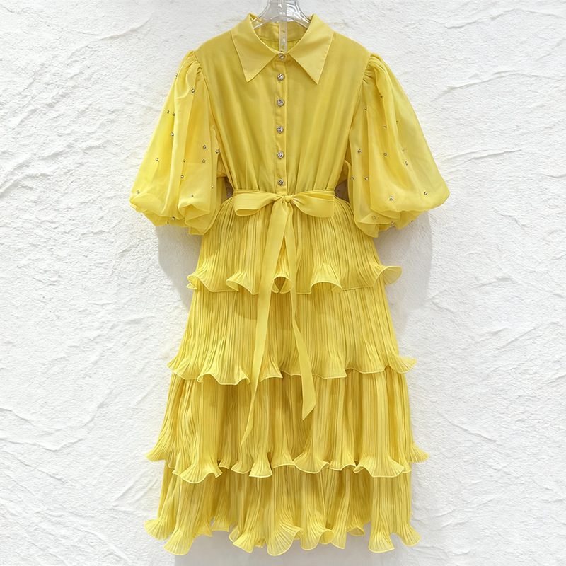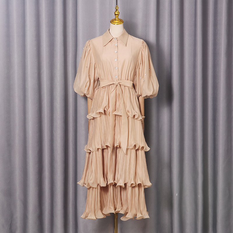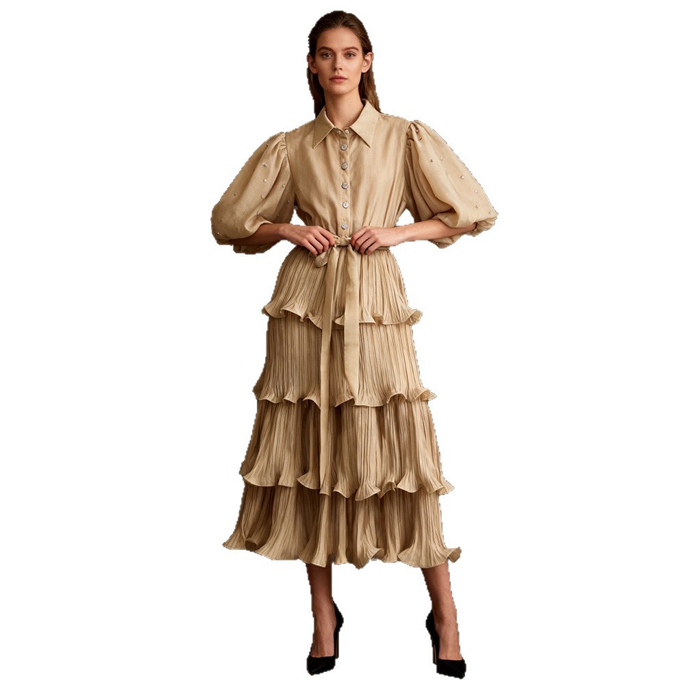 Retro palace style solid color dress 2025 new fashion lapel single breasted bubble sleeve mid length cake skirt