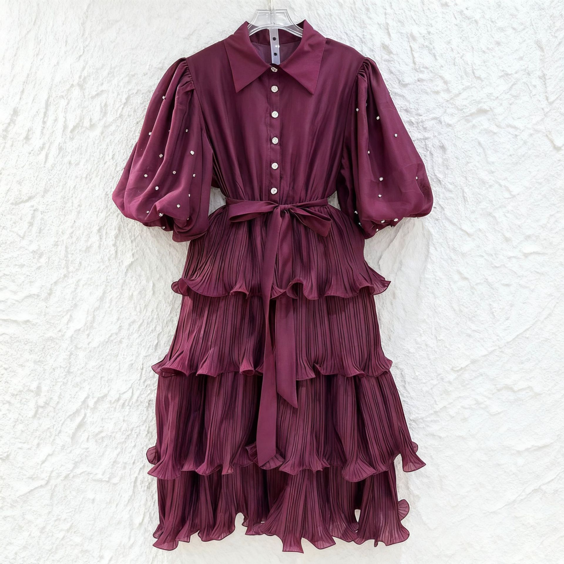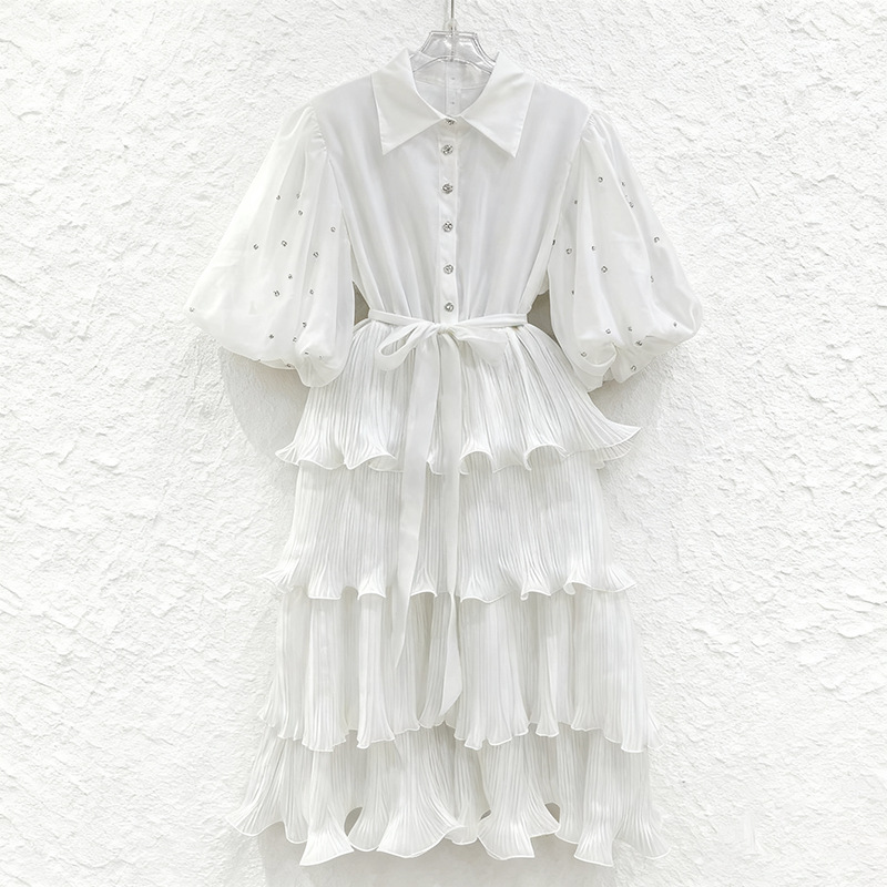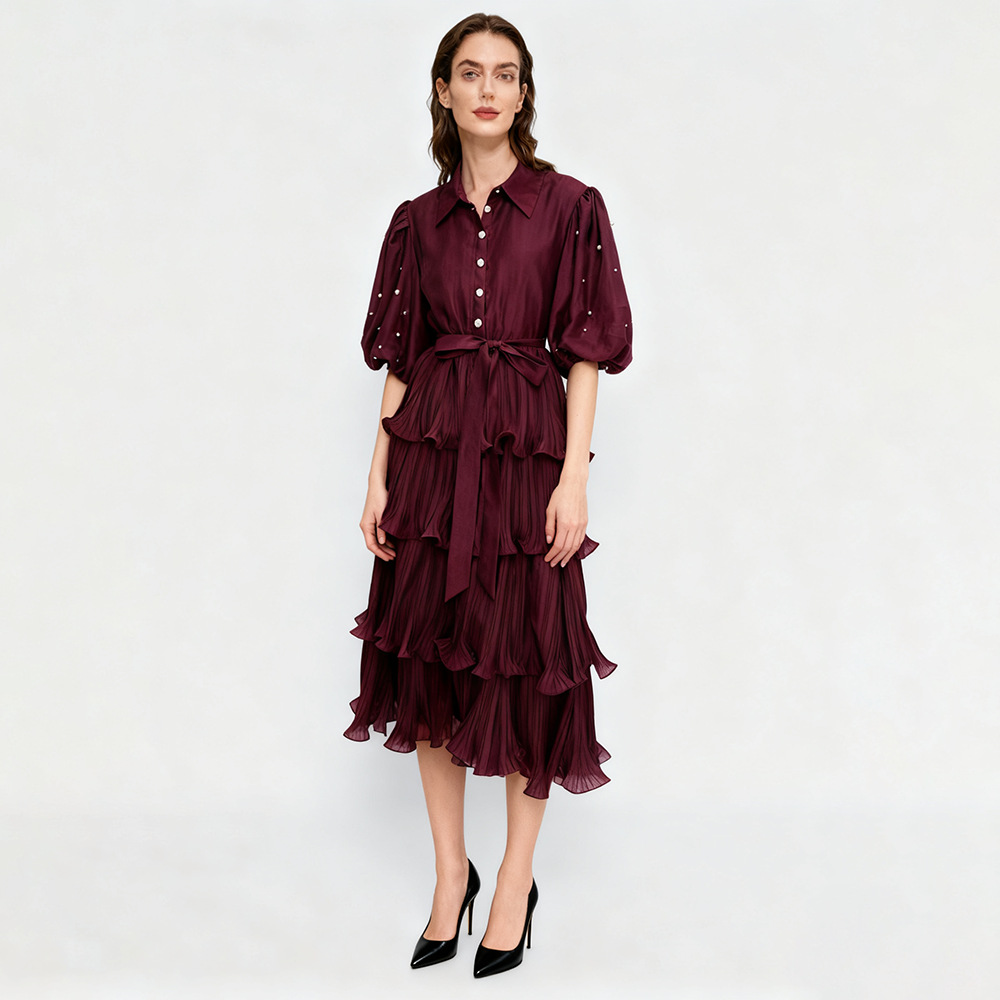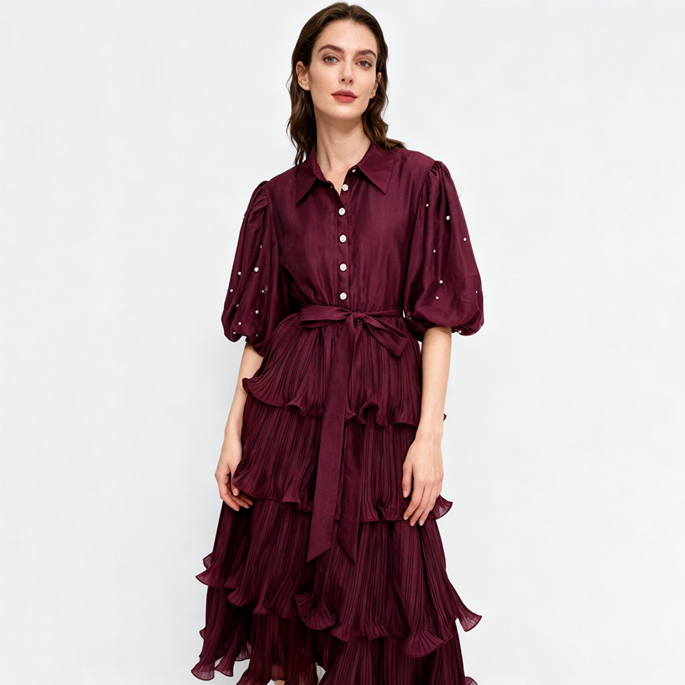 Retro palace style solid color dress 2025 new fashion lapel single breasted bubble sleeve mid length cake skirt