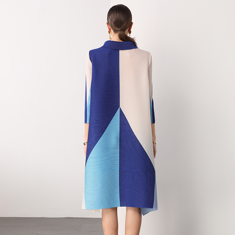 Sanzhai Spring and Autumn Mid length Loose Printed Slimming and Age Reducing Large Size MM Dress with Collar Fold and Nine Cent Sleeve