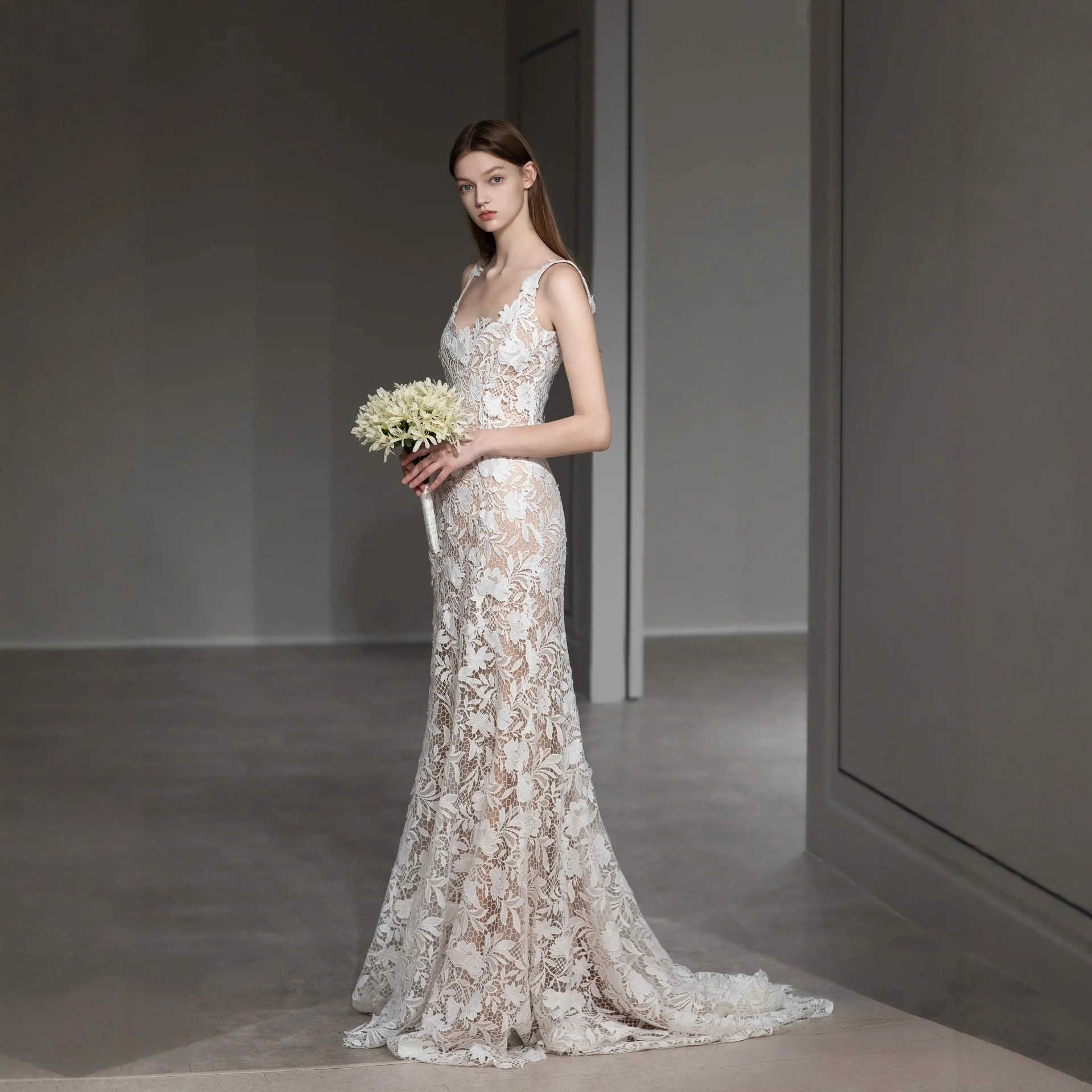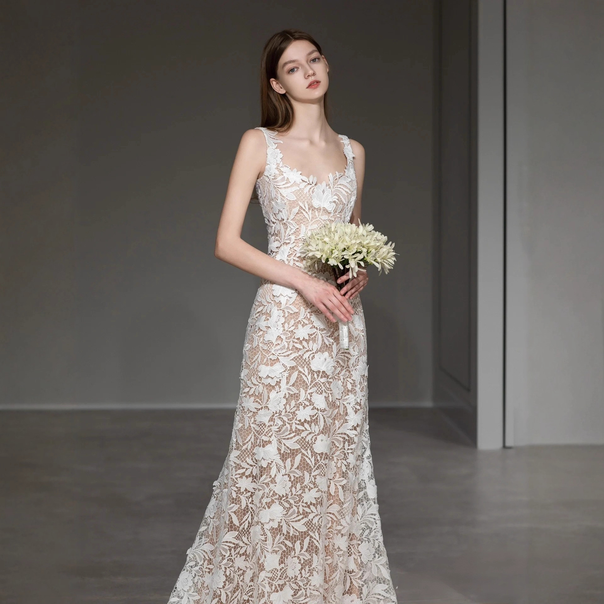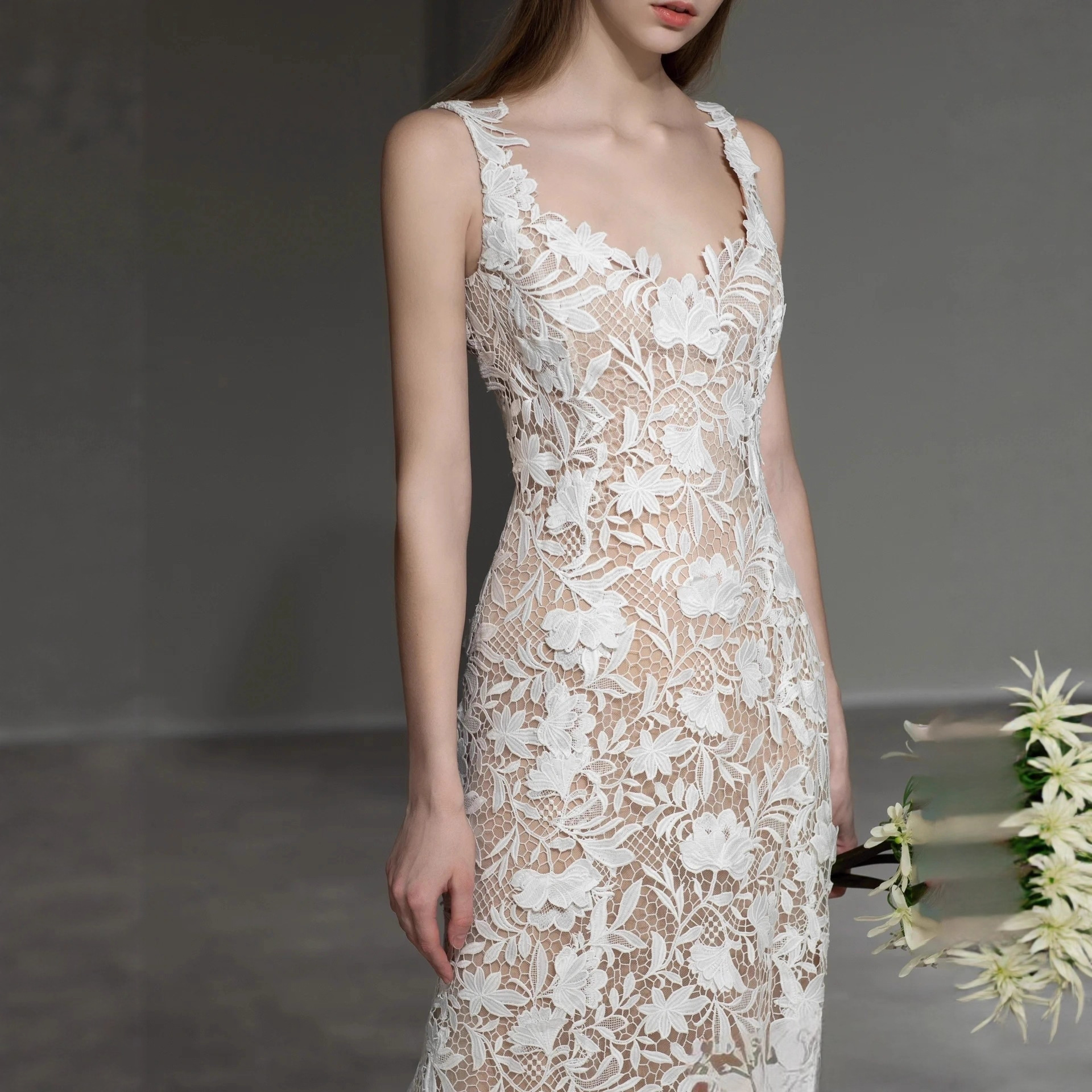 New cross-border foreign trade suspender, light gauze, lace, fish tail, slim fitting wedding dress, slimming effect, forest style outdoor photography, toasting, travel photography
