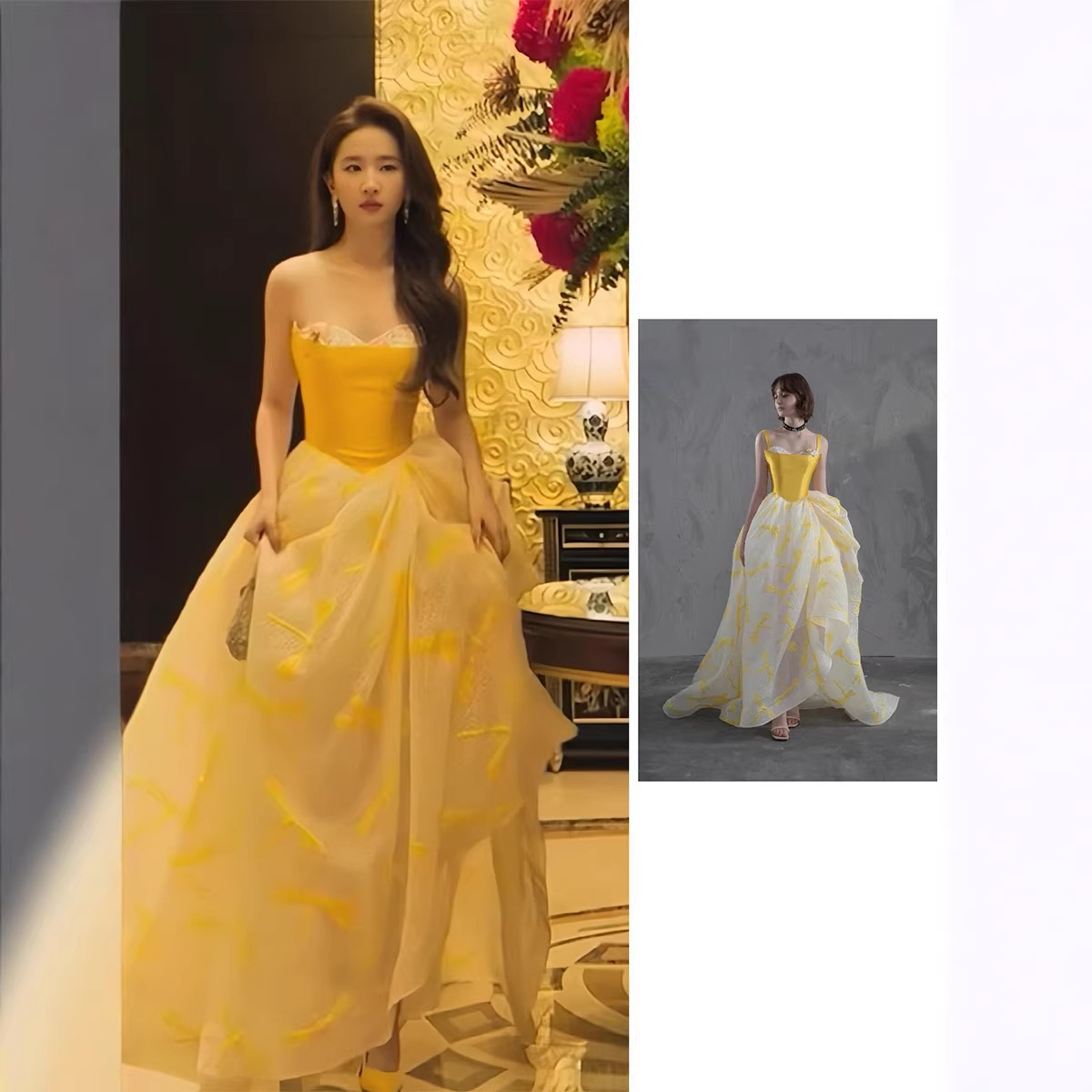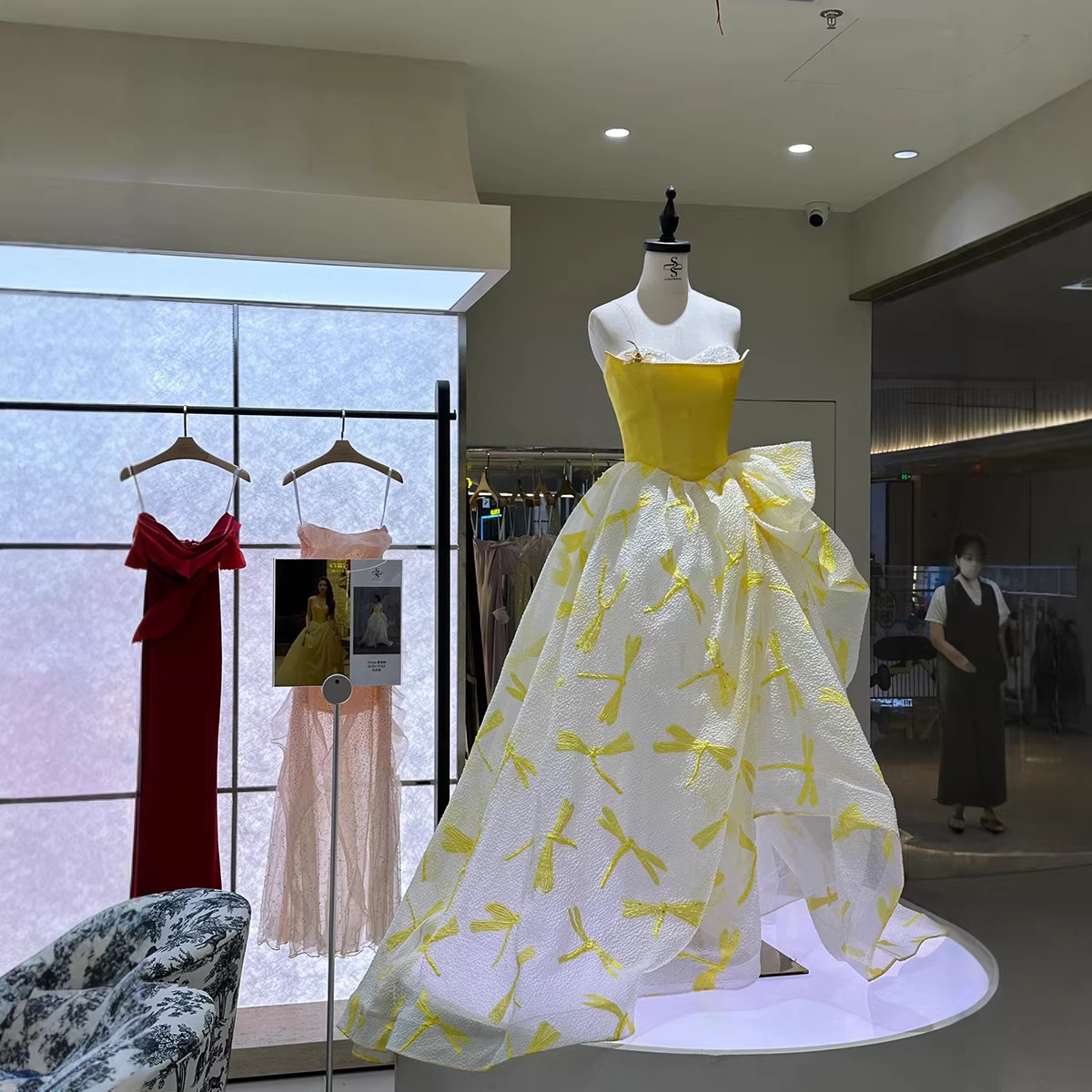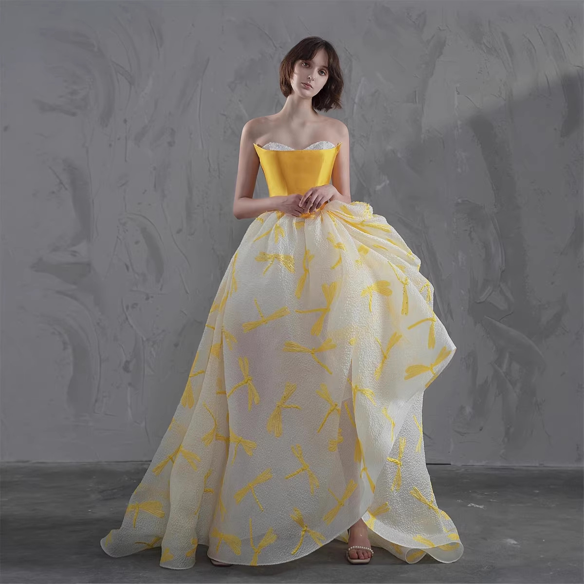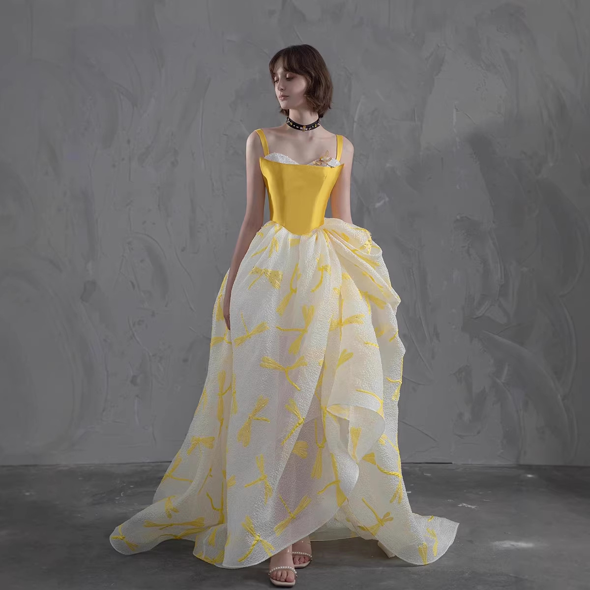 Cross border foreign trade yellow bride wedding toast dress, European and American stage runway show, solo performance, wedding dress, evening dress supply