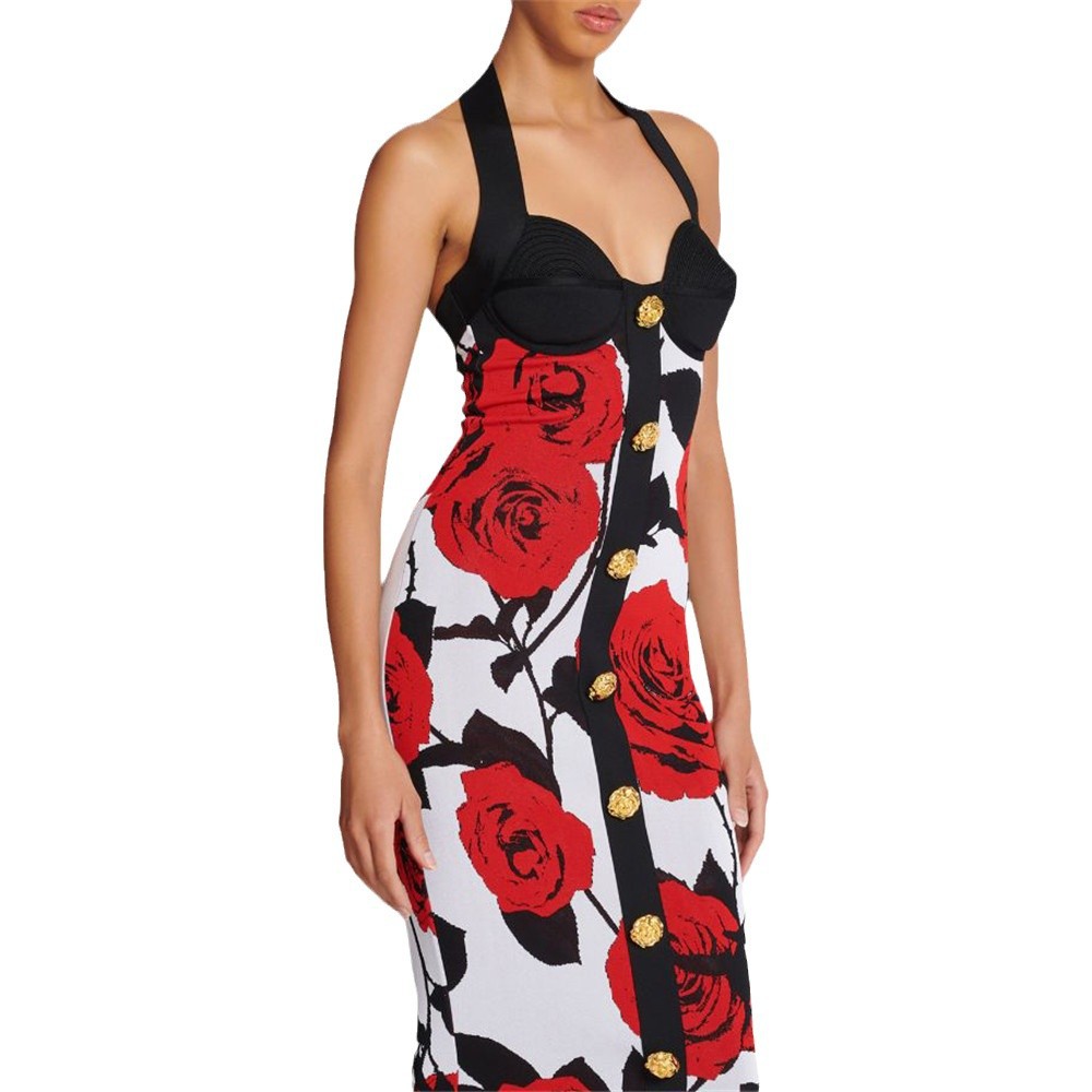 2024 European and American New Small Fragrant Rose Jacquard Knitted Bandage Skirt Sexy Hanging Neck Gold Buckle Elastic Dress