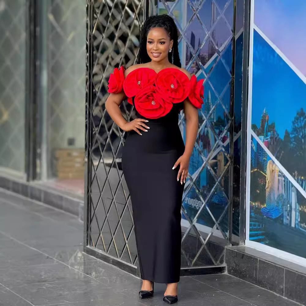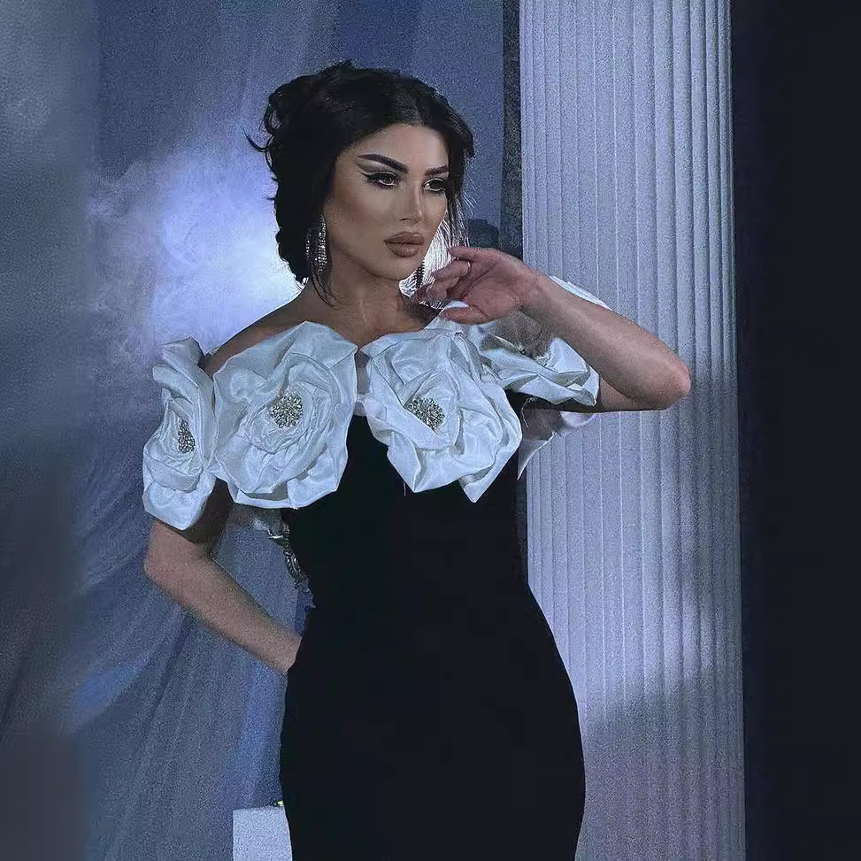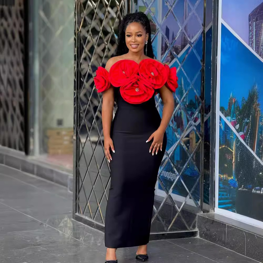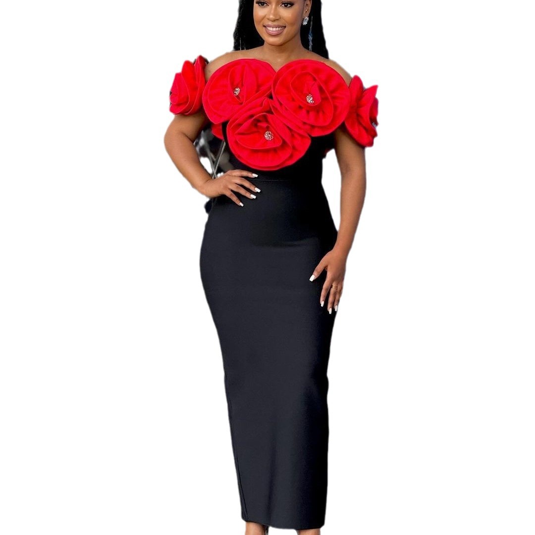European and American dress with one collar and off shoulder, slim fit and slimming bandage skirt, large flower high-end women's clothing, foreign trade, cross-border Amazon