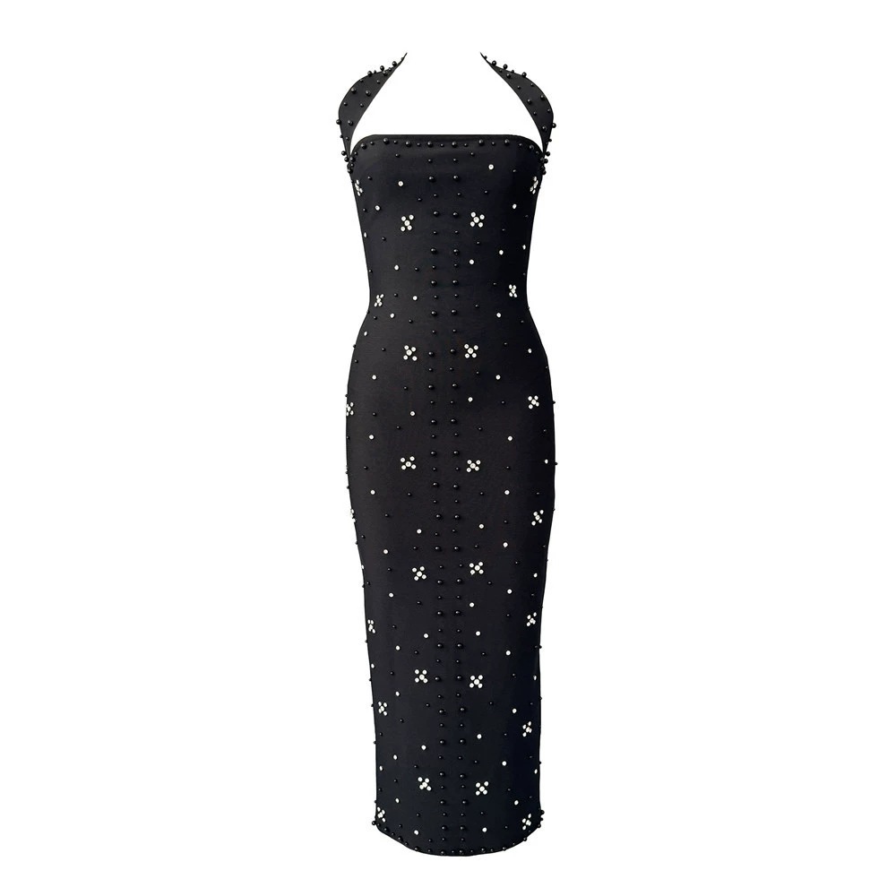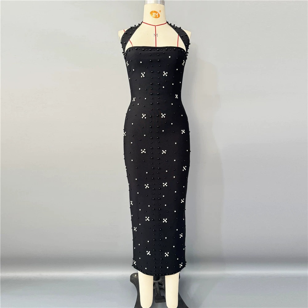 New sexy bandage dress with neck hanging, hot stamping, diamond studded beads, high-end feeling, socialite dinner dress, European and American women's cross-border dress