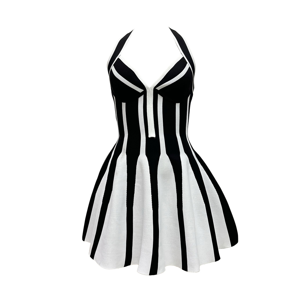 Cross border Europe and America 2025 new women's sexy black and white contrasting striped backless hanging neck knitted bandage dress