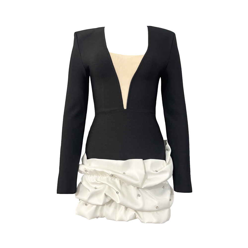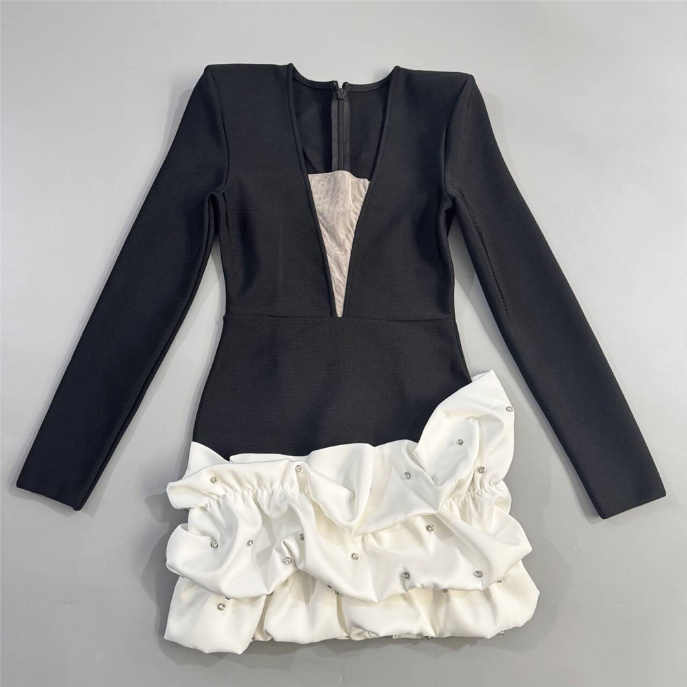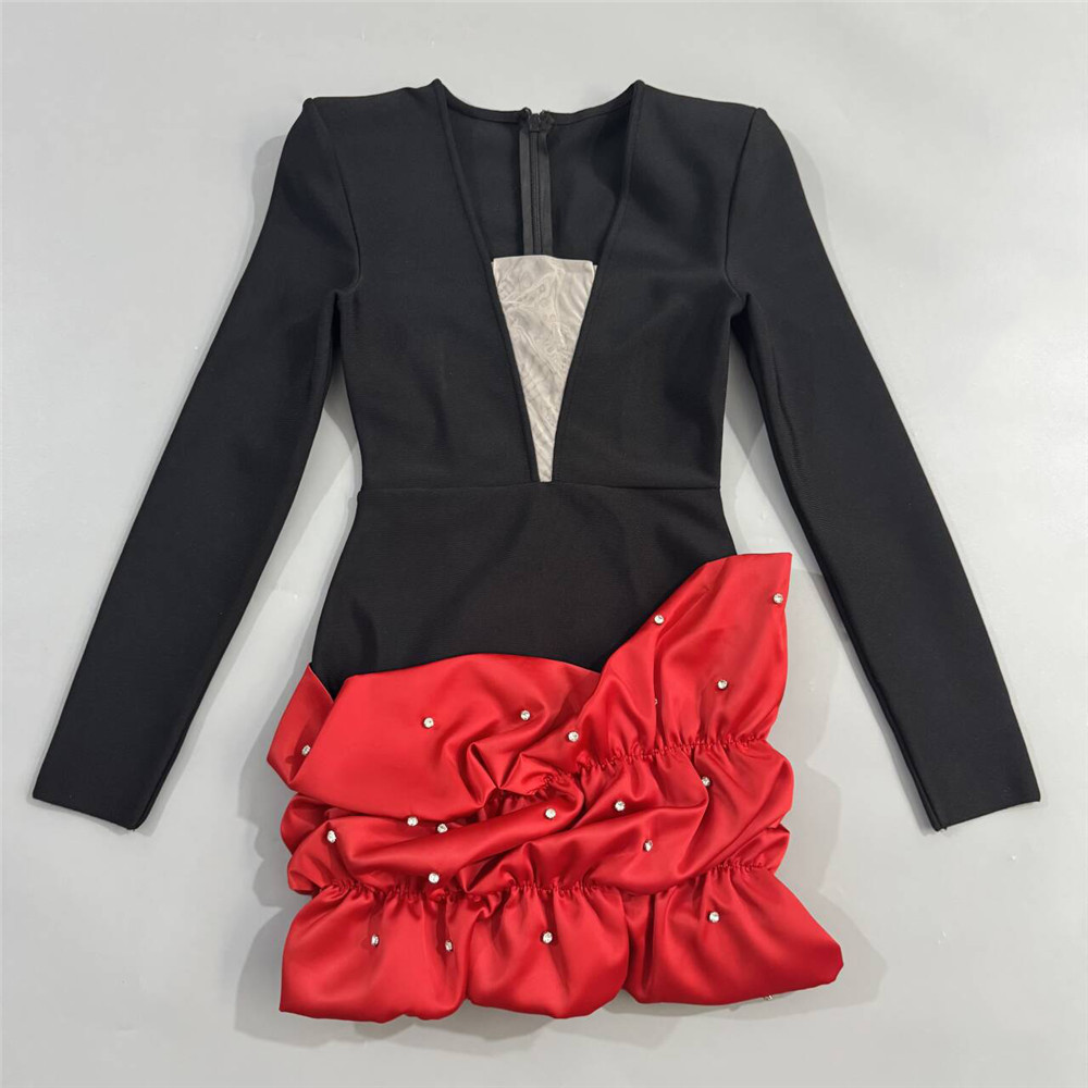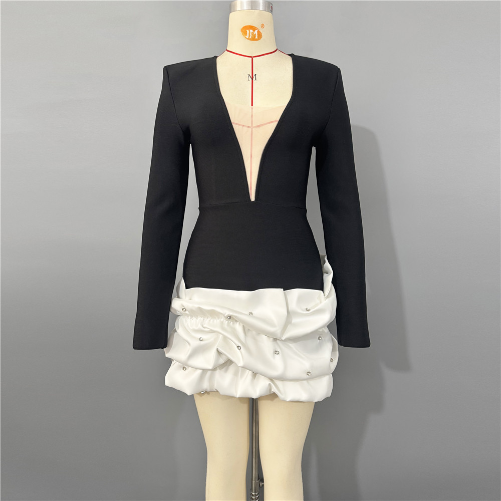 Cross border European and American fashion irregular layered lotus leaf splicing diamond inlaid bandage dress, deep V temperament cake skirt