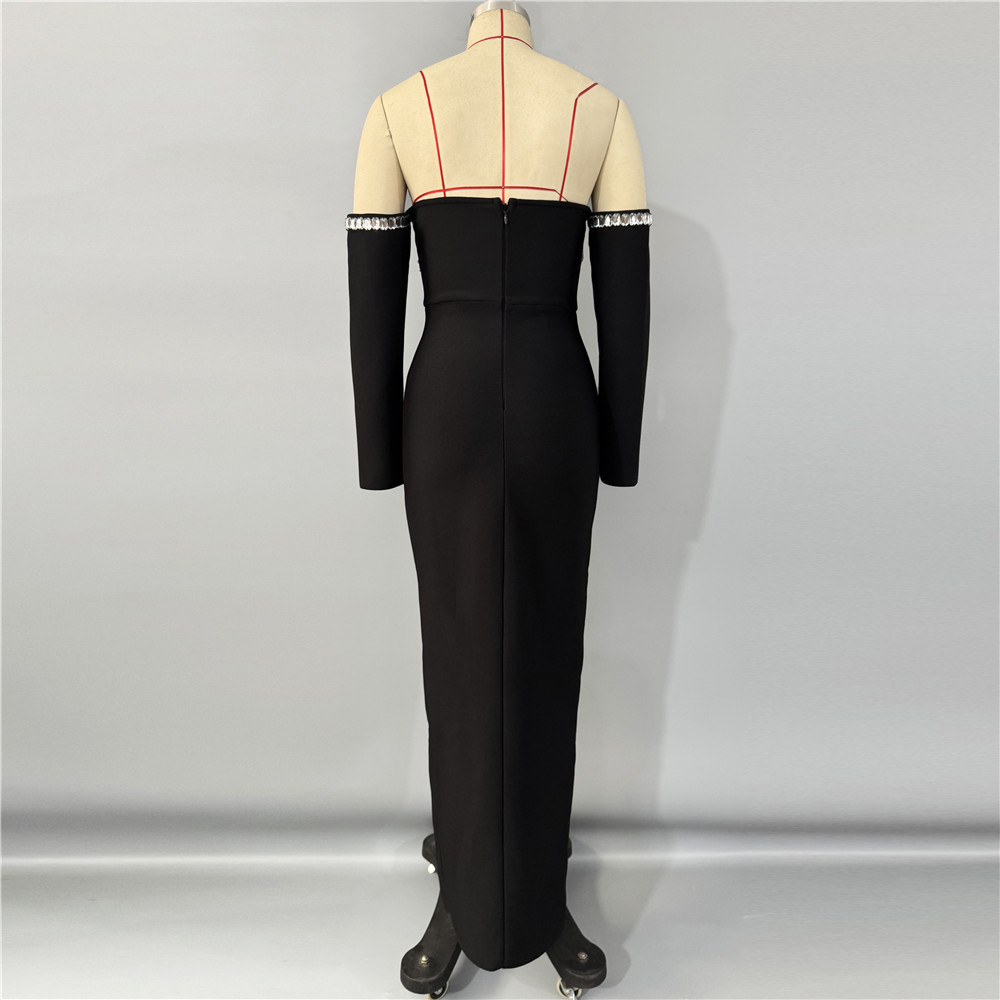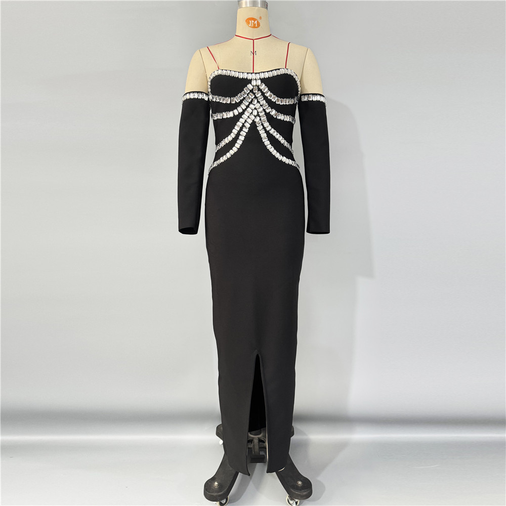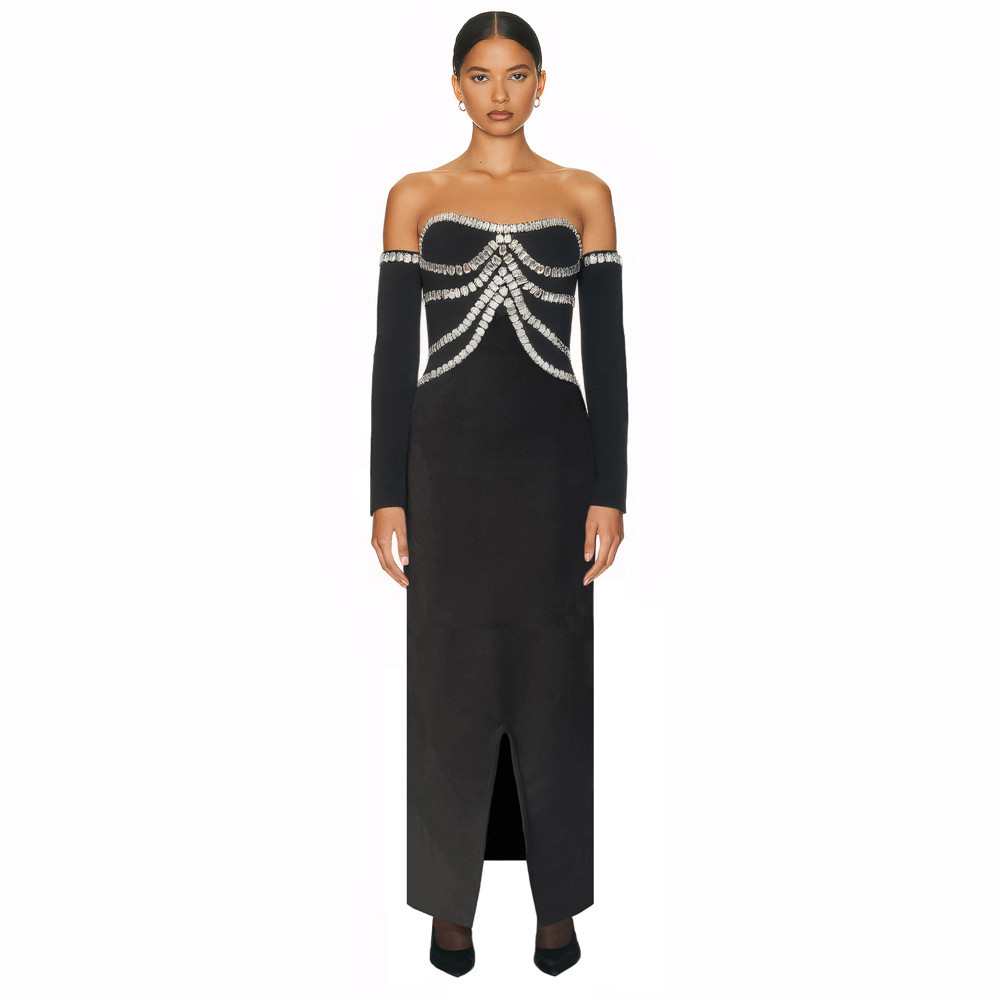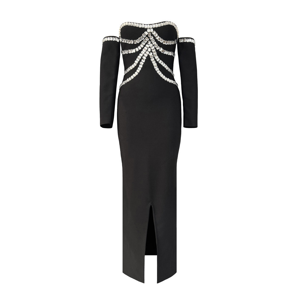 Cross border European and American heavy industry nail bead rhinestone shoulder bandage dress party dinner strapless slit dress