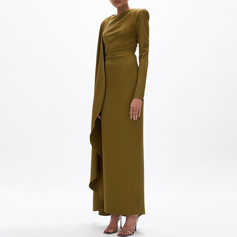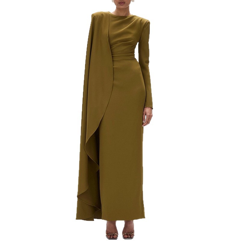 European and American Cross border Long Dress for Women 2025 New Solid Color Round Neck Irregular Shawl Back Fork Slimming Dress
