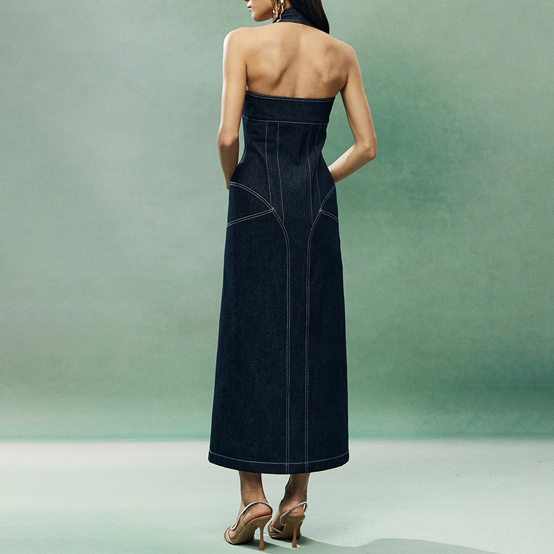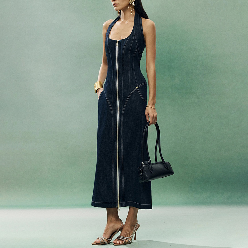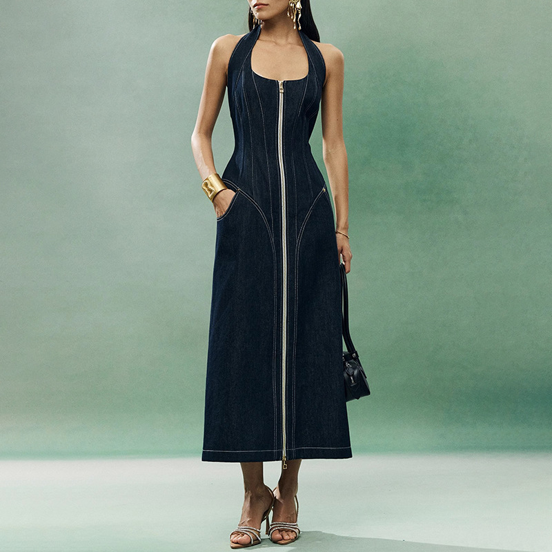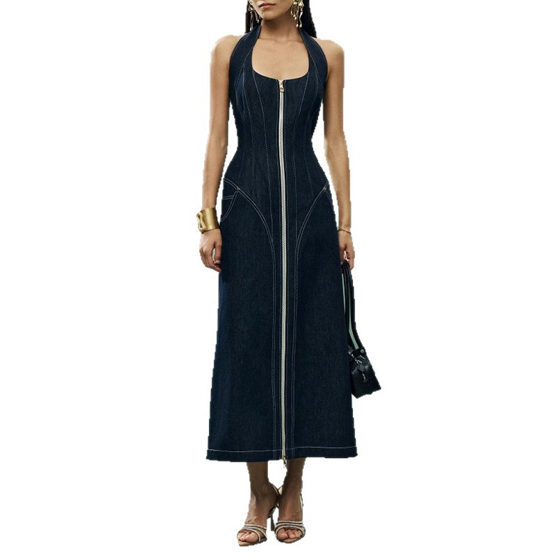 Celebrity style high-end dress for women in 2025, fashionable slim fit and slimming, with a hanging neck zipper design and denim skirt