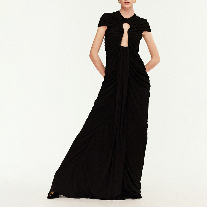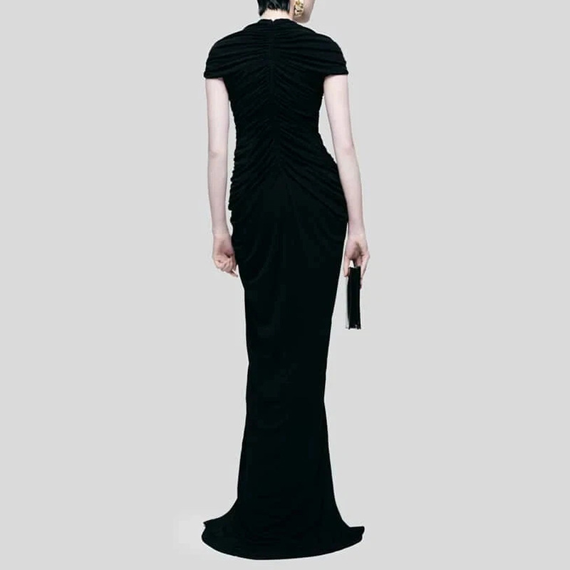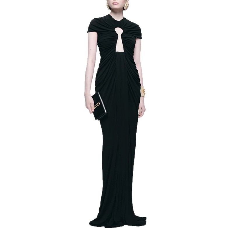 Elegant temperament and high-end feeling hollow out dress dress 2025 new solid color round neck pleated short sleeved long dress for women