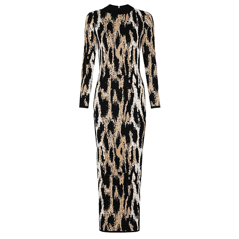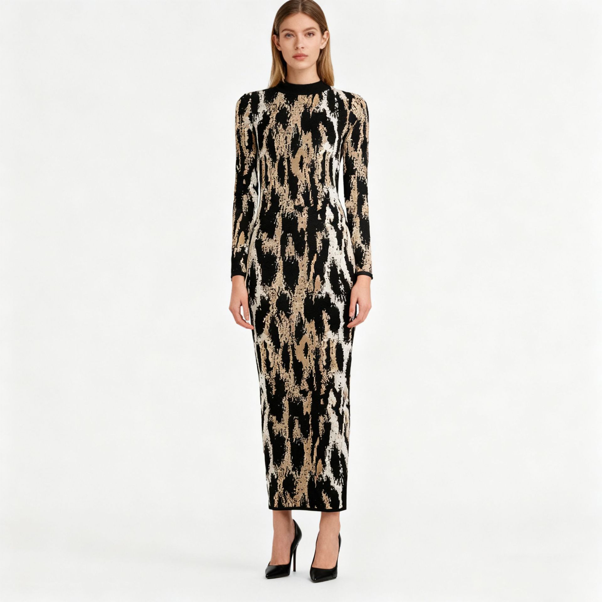 European and American cross-border temperament long dress 2025 autumn and winter new retro leopard print round neck long sleeved slim fit long skirt