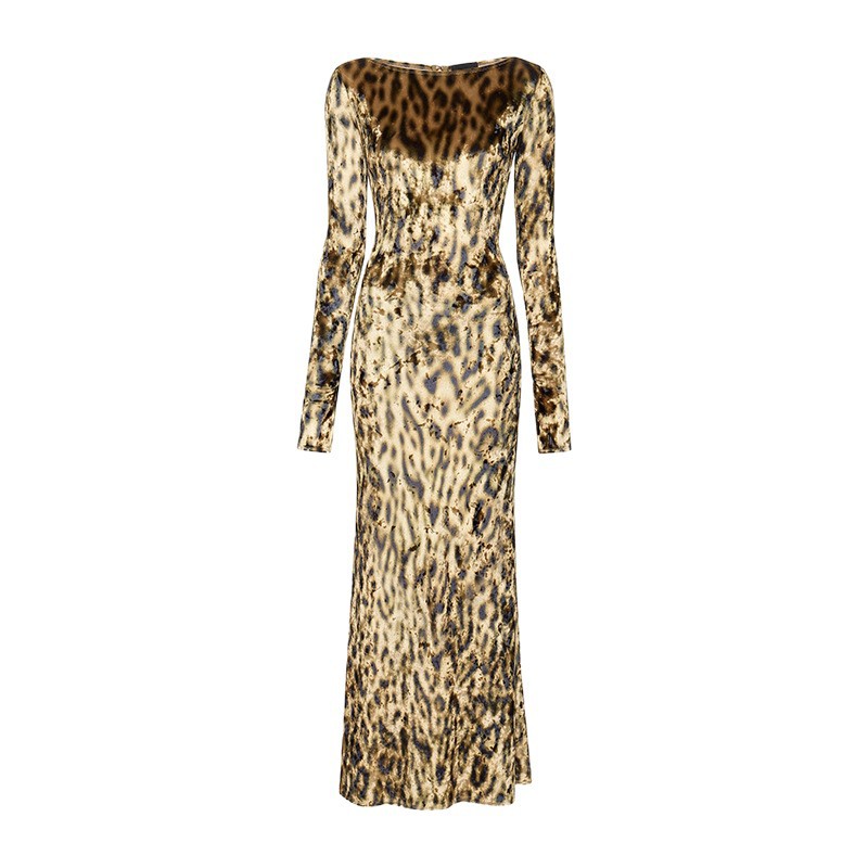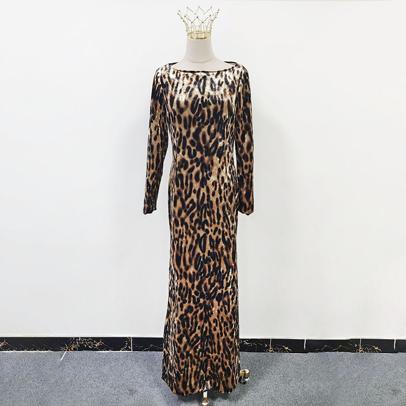 European and American spicy style long skirt 2025 autumn new item retro leopard print round neck long sleeved high waisted slim fit dress for women