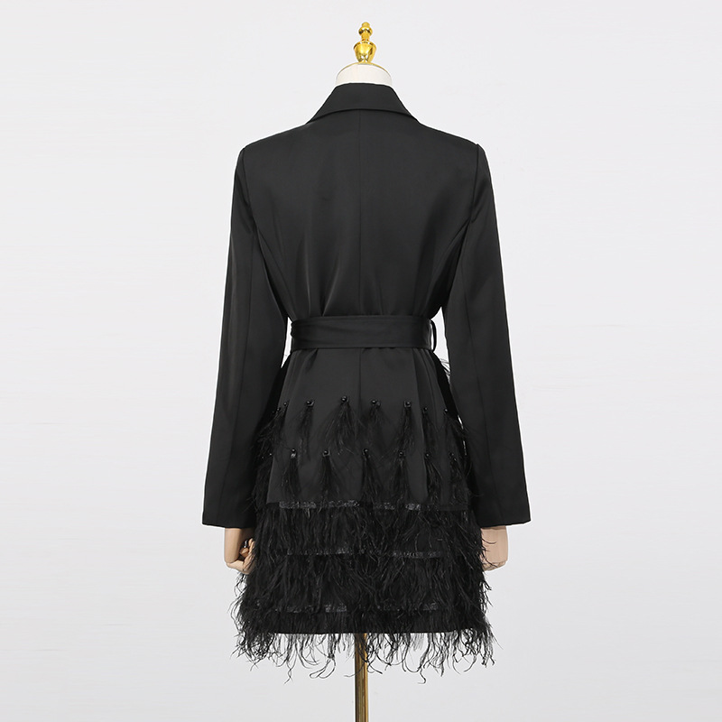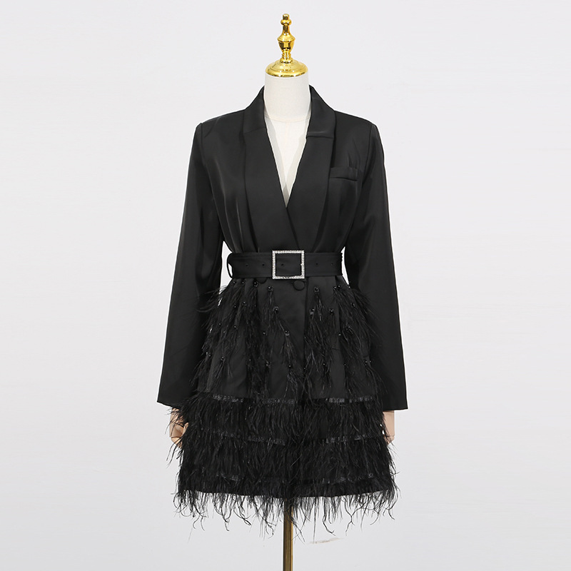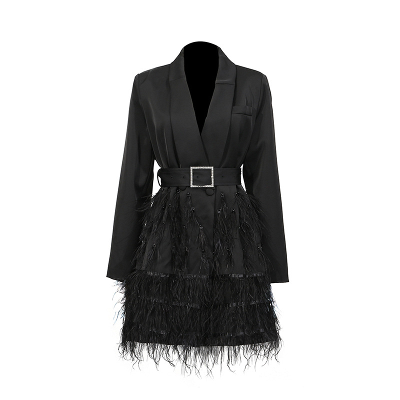 European and American cross-border sexy dress dress 2025 new fashionable V-neck belt with feather splicing design at the hem suit skirt