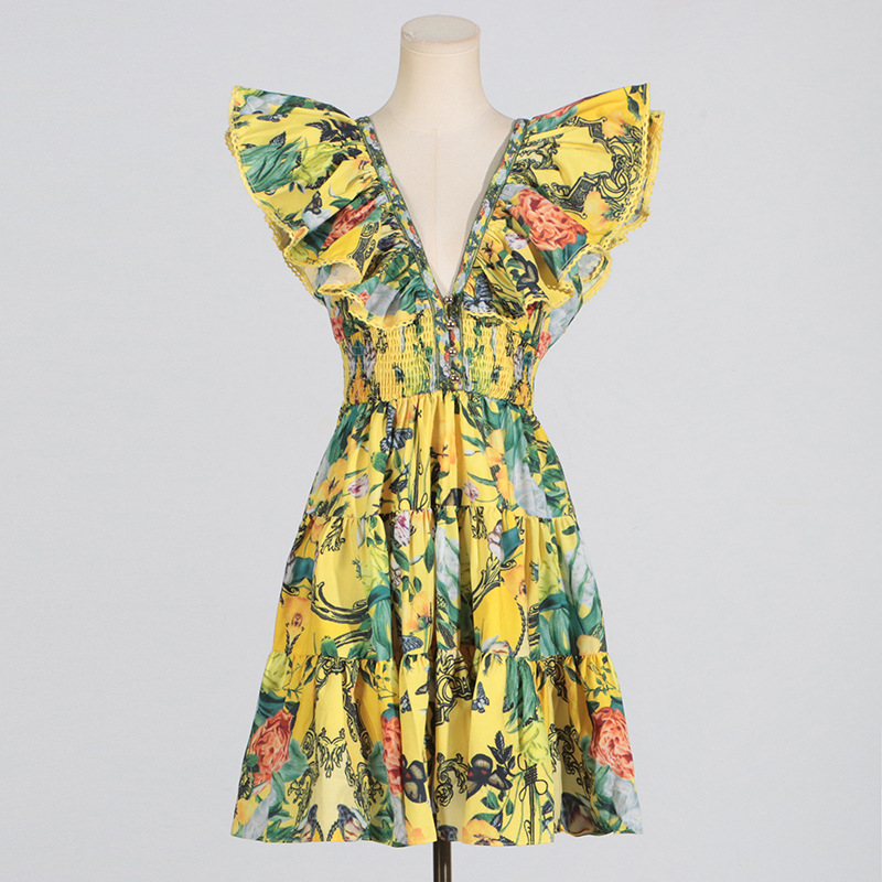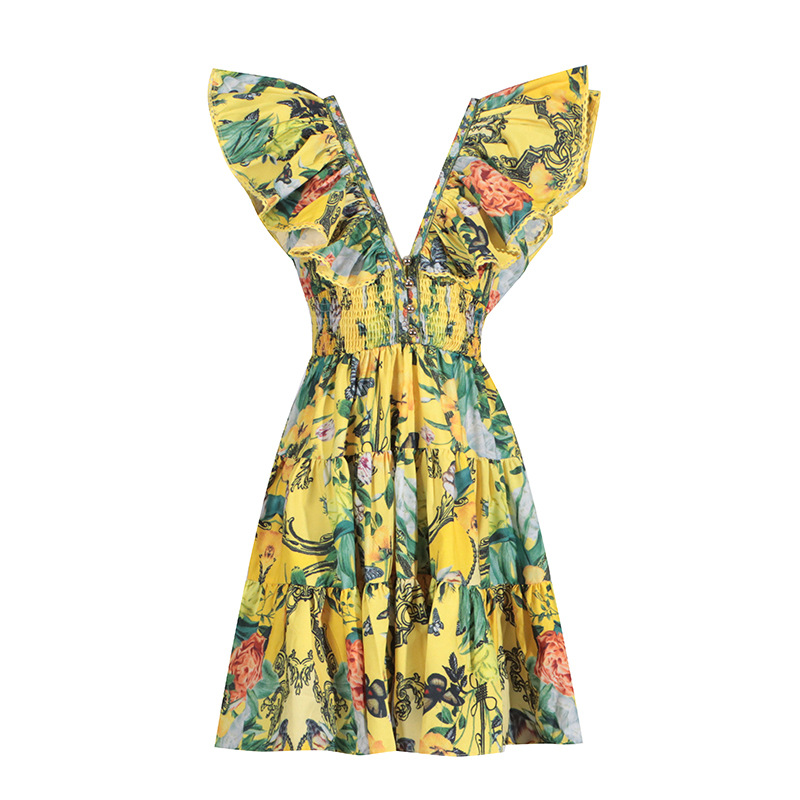 Australian Trendy Brand Design Dress 2025 New Fashionable Flying Sleeve Printed Ruffle A-line Short Skirt for Women