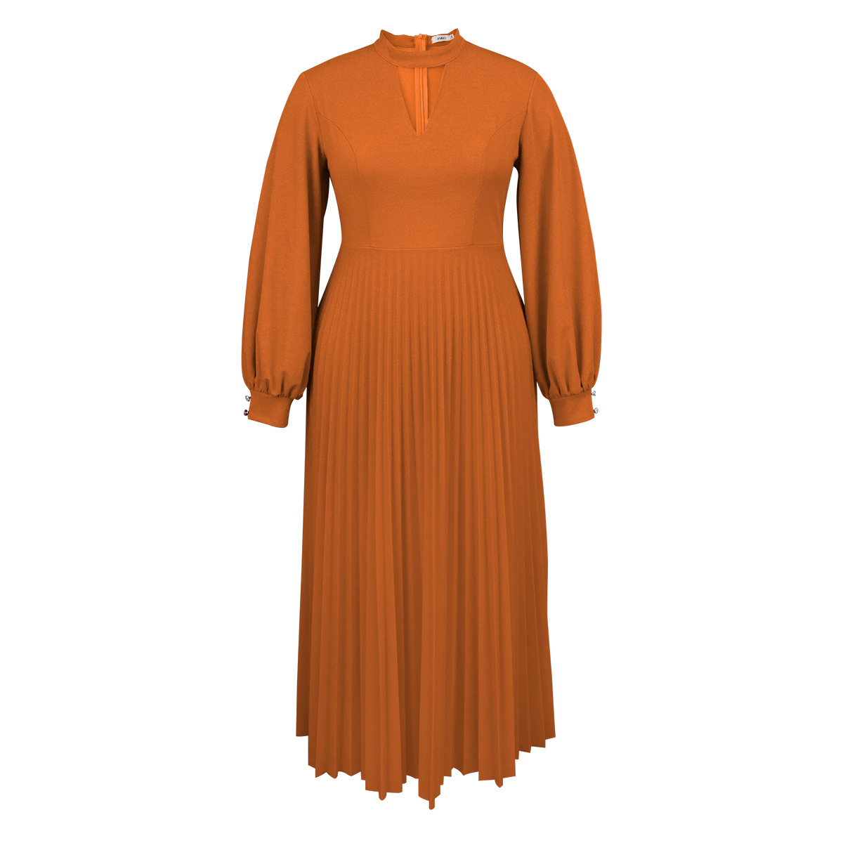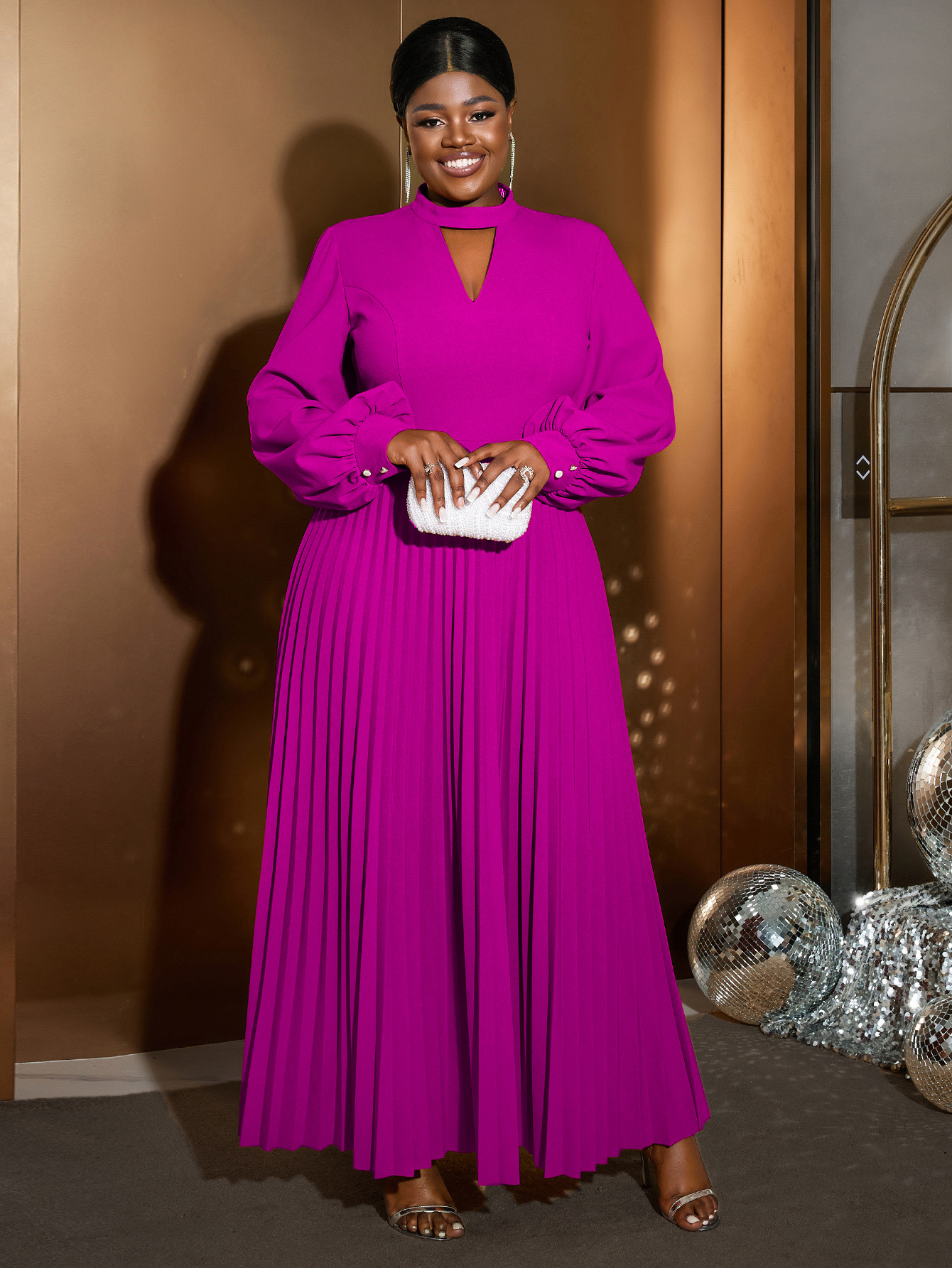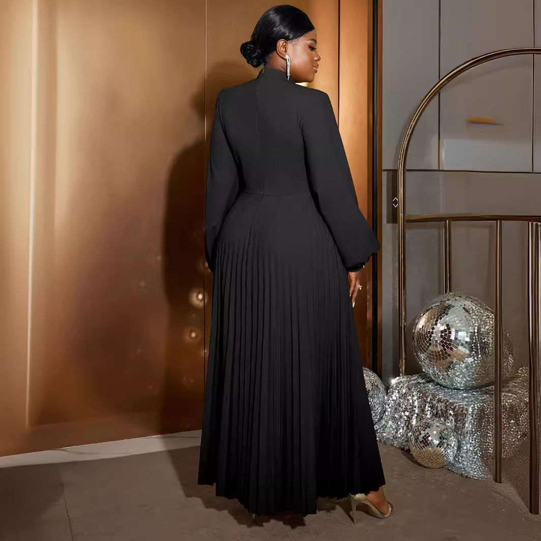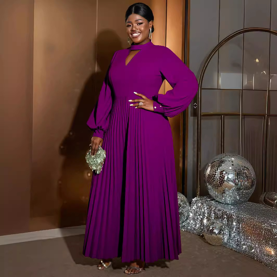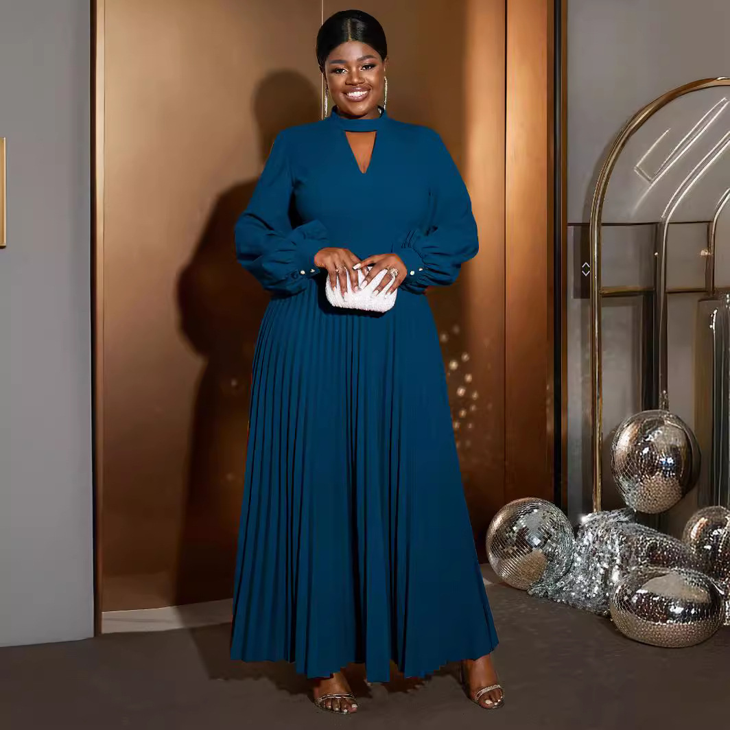 European and American plus light mature style hollow out small stand up collar dress, comfortable and loose lantern sleeves pleated skirt, dress