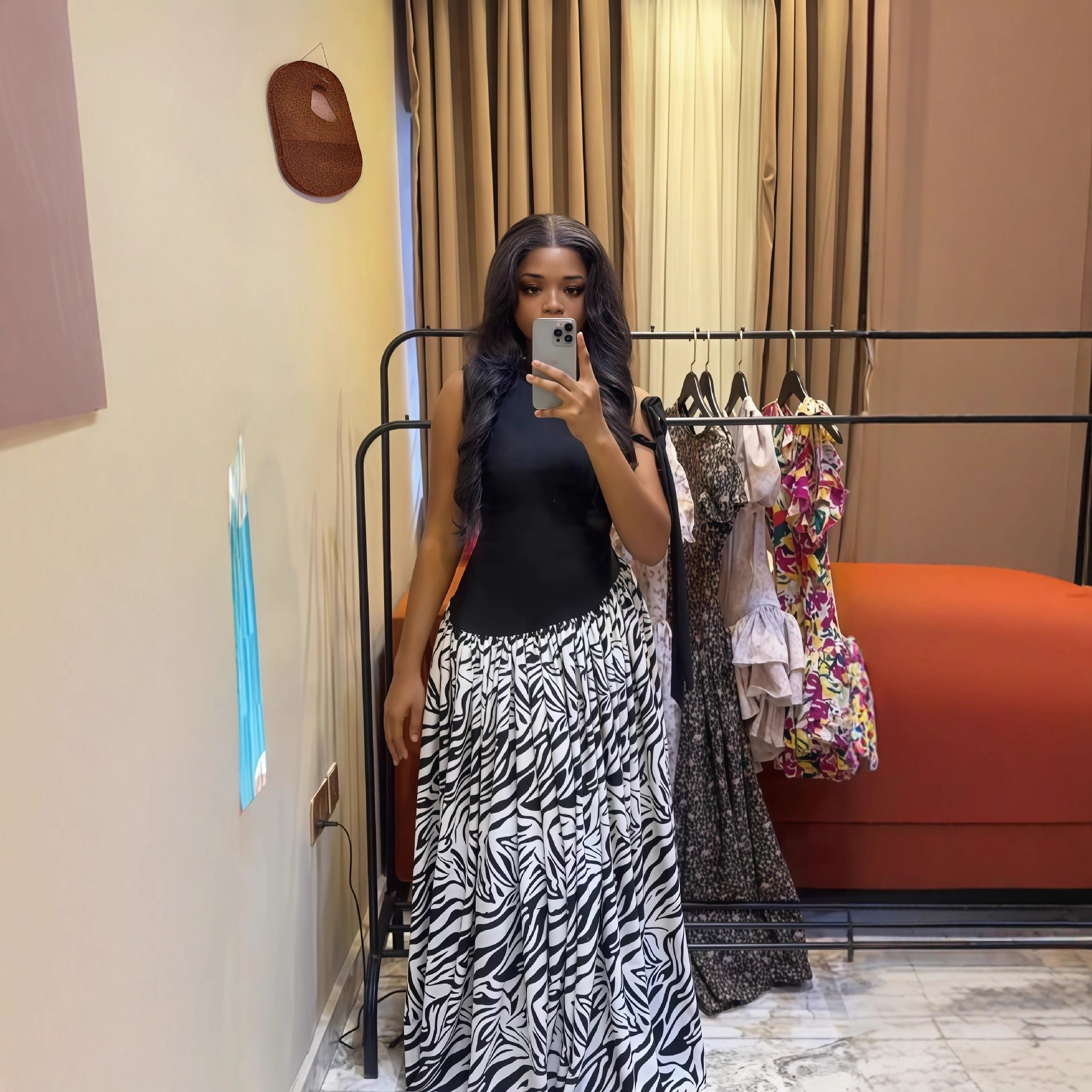 European and American Cross border Women's Wear 2025 Autumn New Sleeveless Slant Neck Slim Fit Printed Wrinkle Style Long Dress
