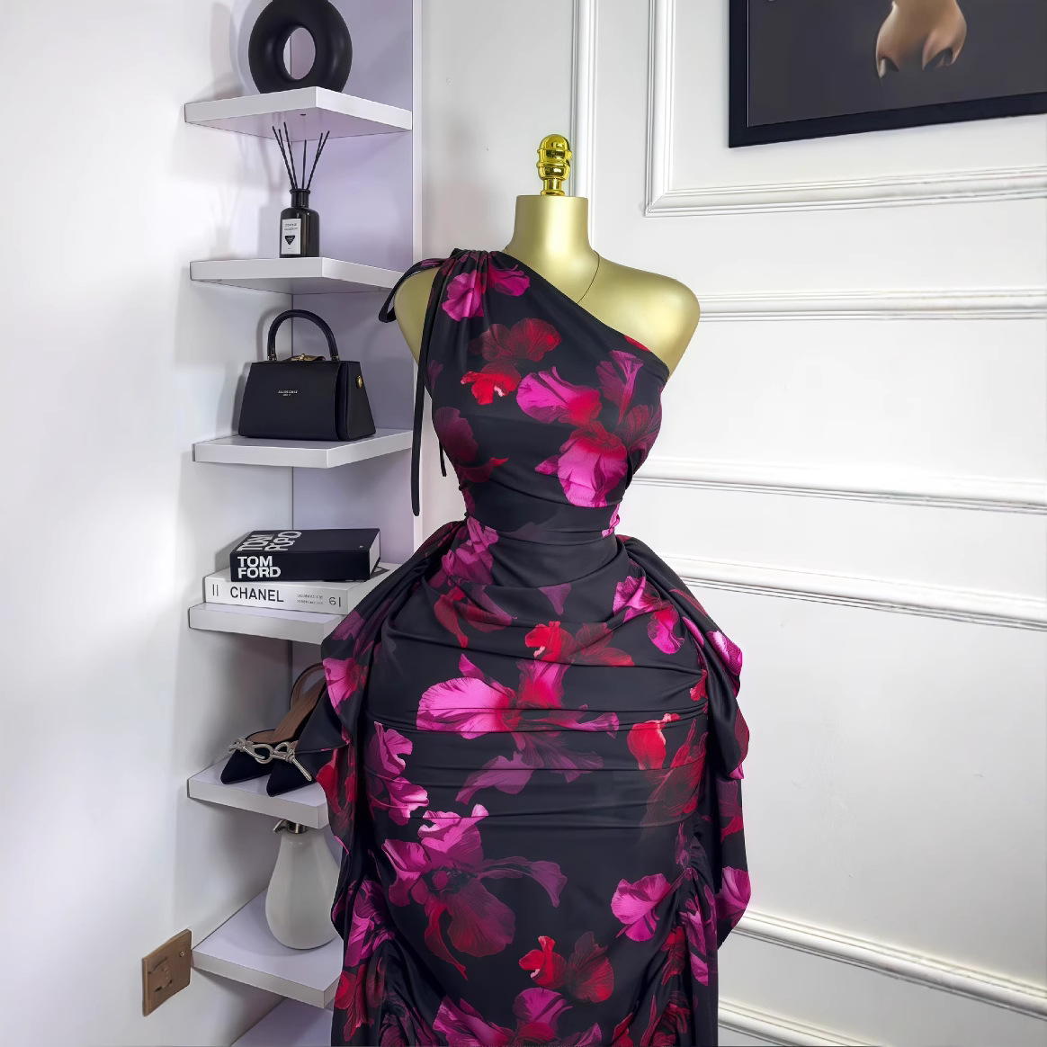 European and American Cross border Women's 2025 Summer New Sleeveless Single Shoulder Slant Neck Printed Lace up Lotus Leaf Edge Tight Dress