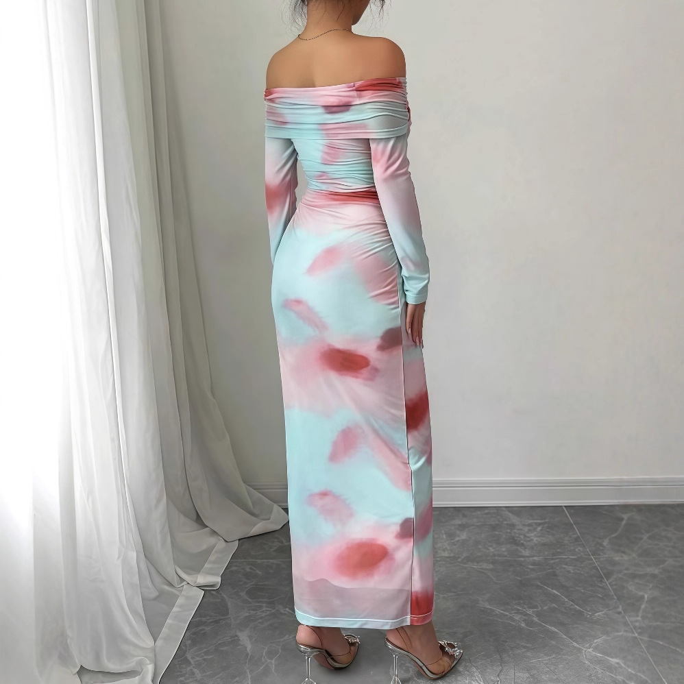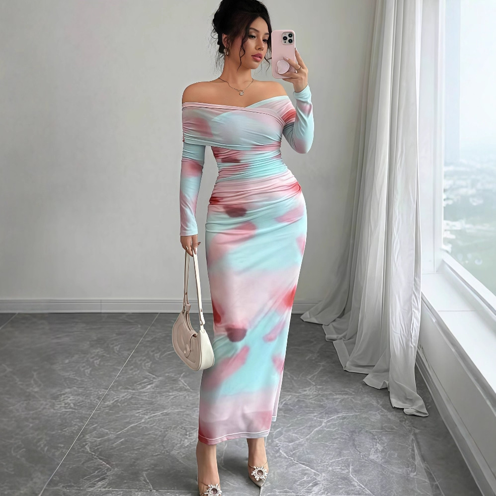 European and American cross-border women's clothing 2025 early autumn new long sleeved printed strapless off shoulder slim fit temperament long dress