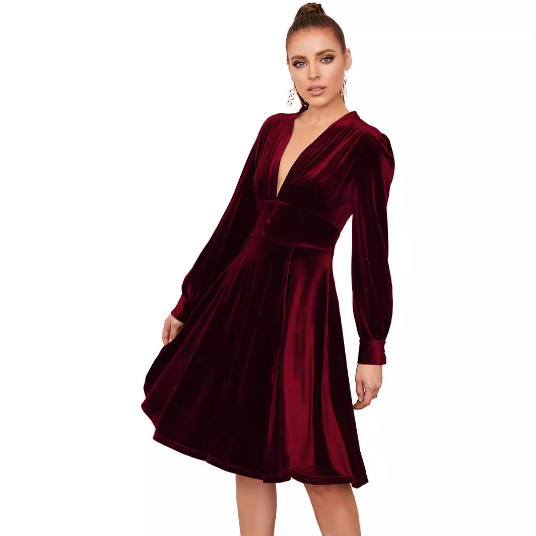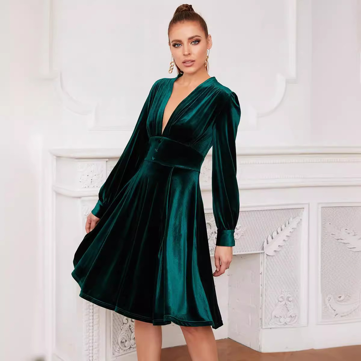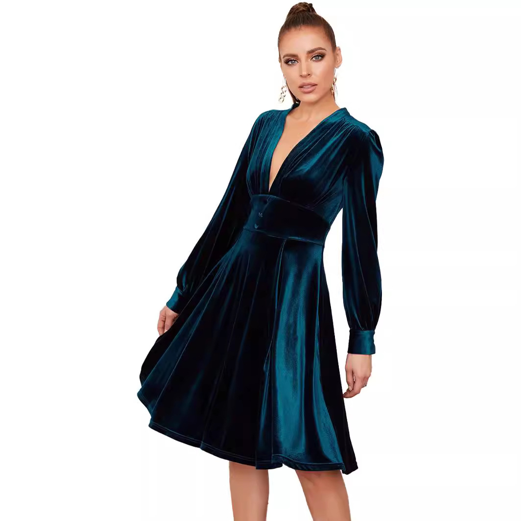 Amazon Women's European and American Style Gold Velvet V-neck Medium Long Dress 2024 Spring New Solid Color Bubble Sleeve Dress