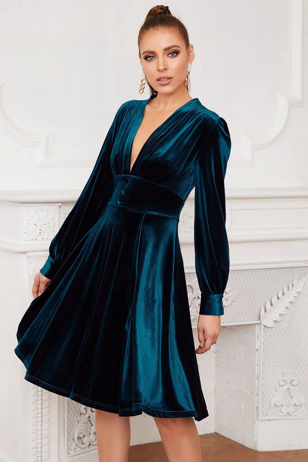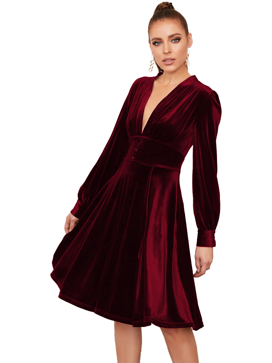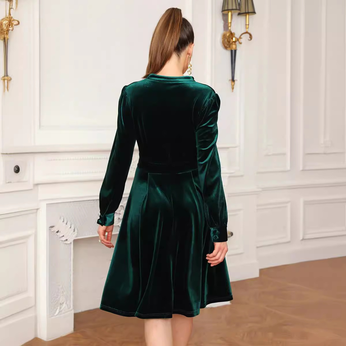 Amazon Women's European and American Style Gold Velvet V-neck Medium Long Dress 2024 Spring New Solid Color Bubble Sleeve Dress