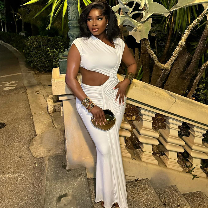 European and American style ins foreign trade women's fashionable solid color dress with slanted collar, sleeveless ribbon, fishtail temperament dress