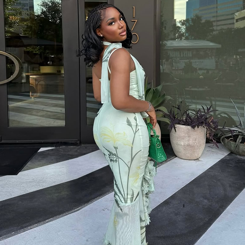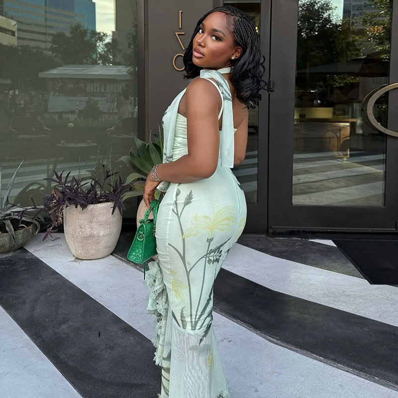European and American style cross-border temperament printed women's clothing elegant slim fit ruffle edge wrapped hip skirt with suspender and sleeveless long dress