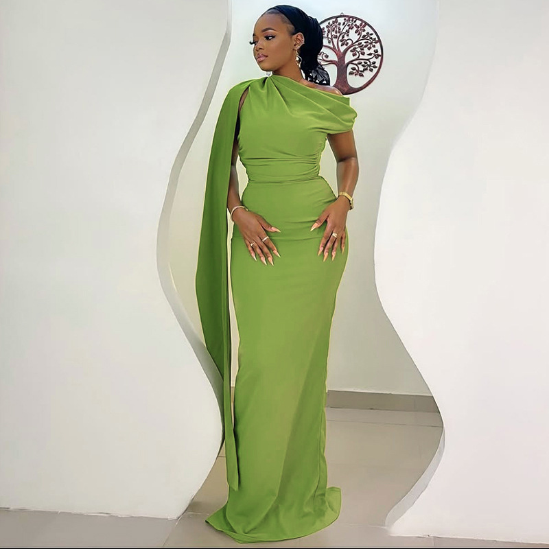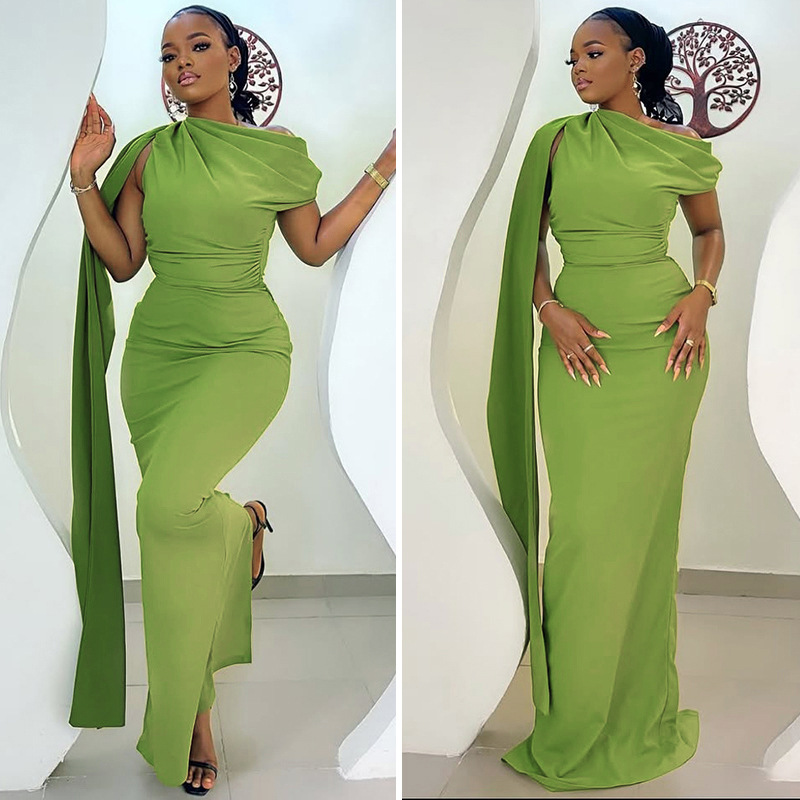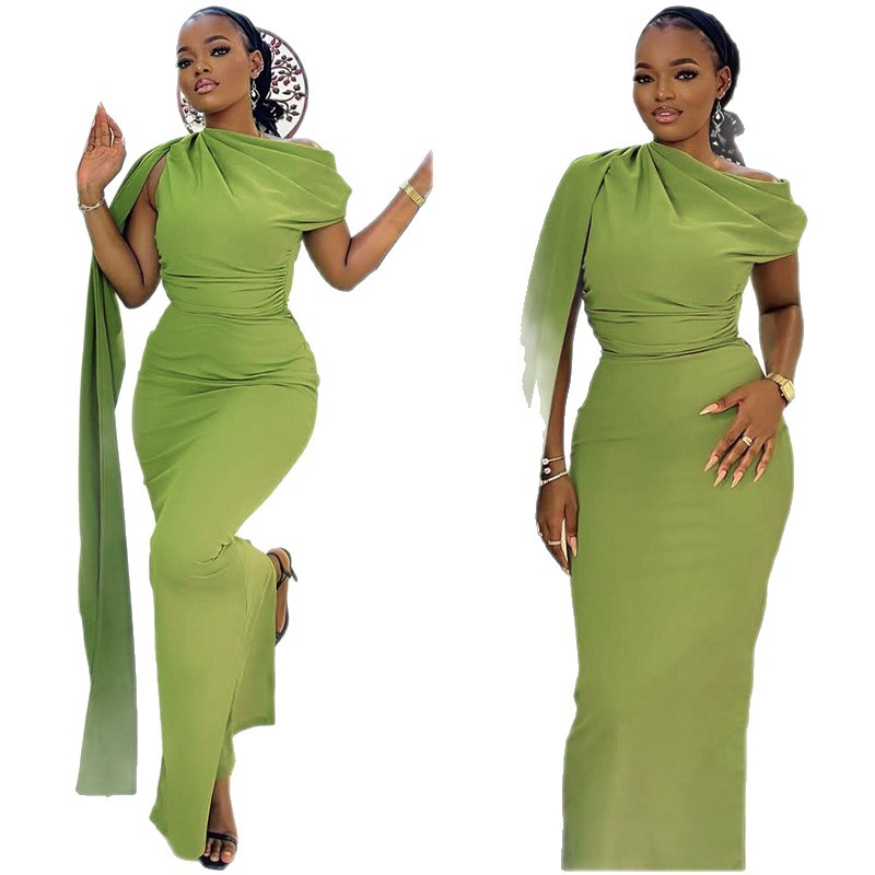 European and American style foreign trade cross-border temperament fashionable women's clothing slim fit elegant one step skirt diagonal collar solid color single shoulder long dress