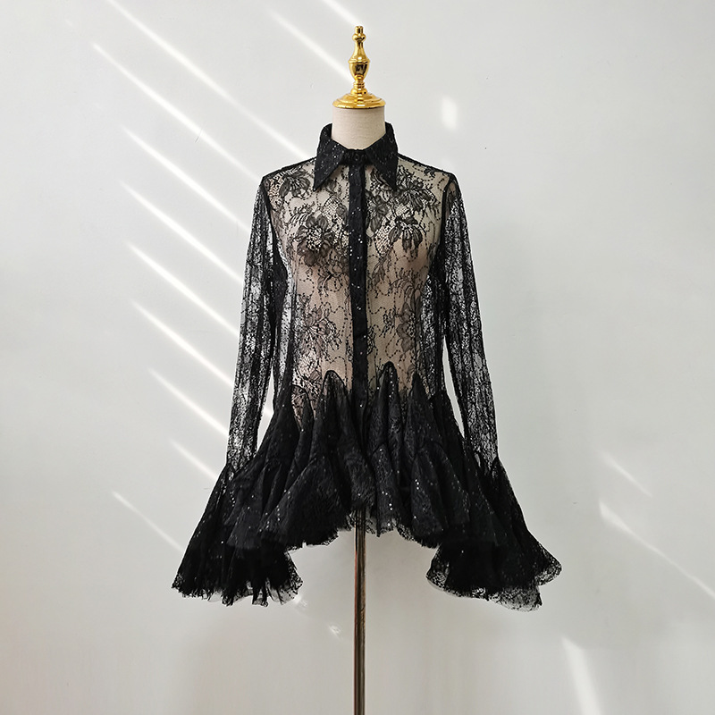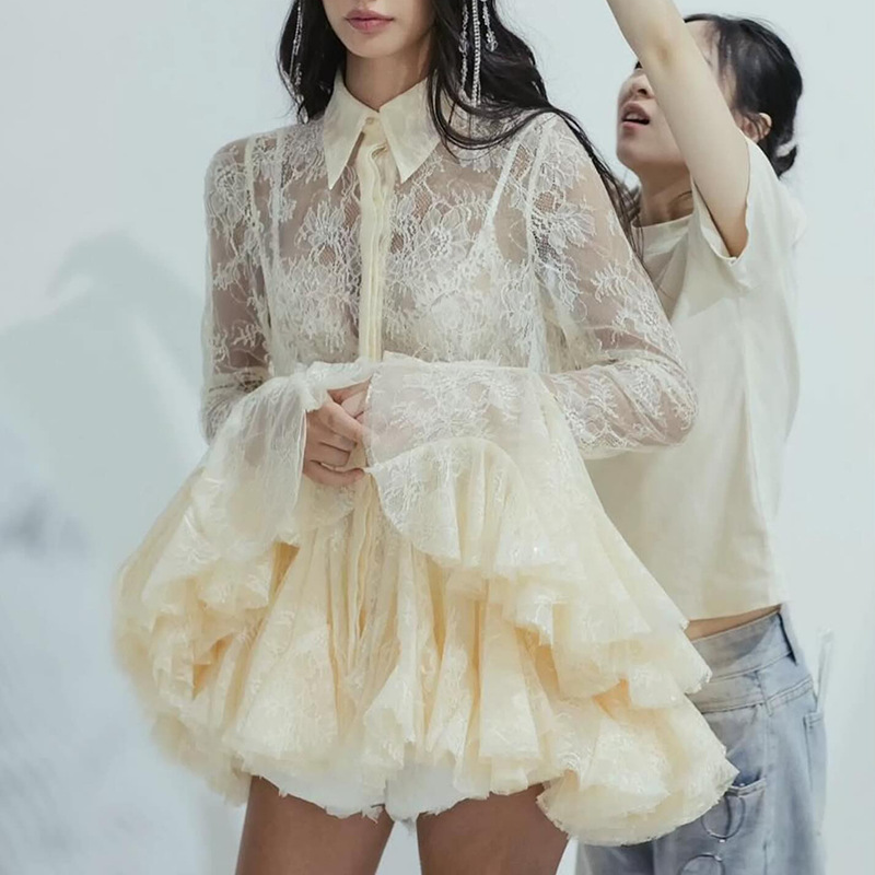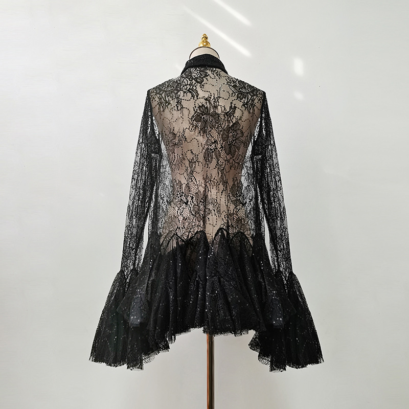 European and American sexy spicy girl style dress 2025 autumn new item lace lapel single breasted flared sleeve short skirt