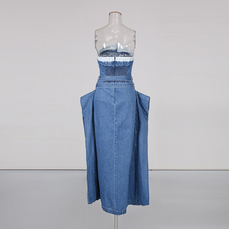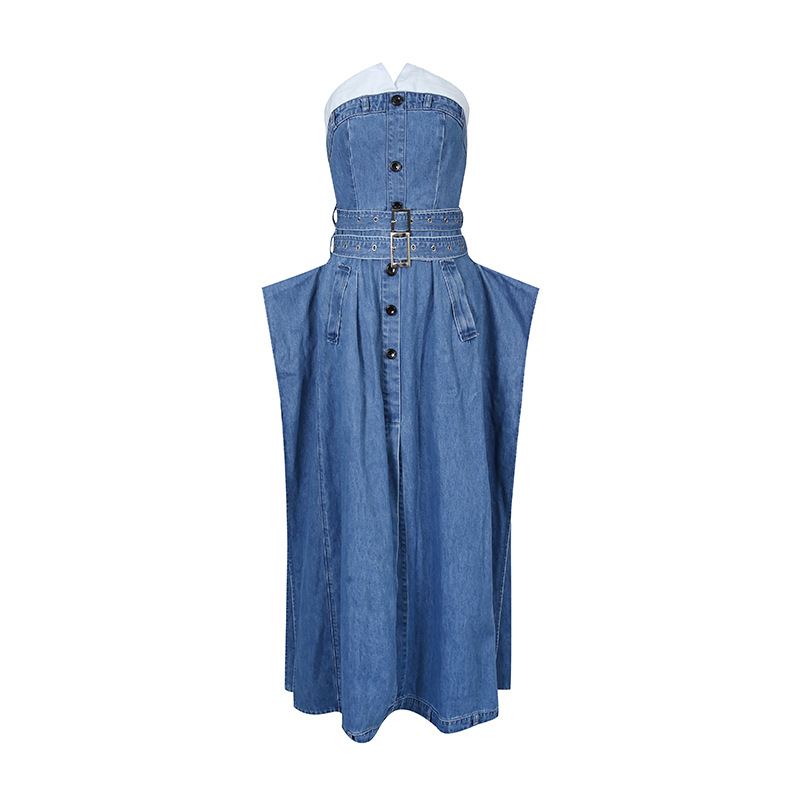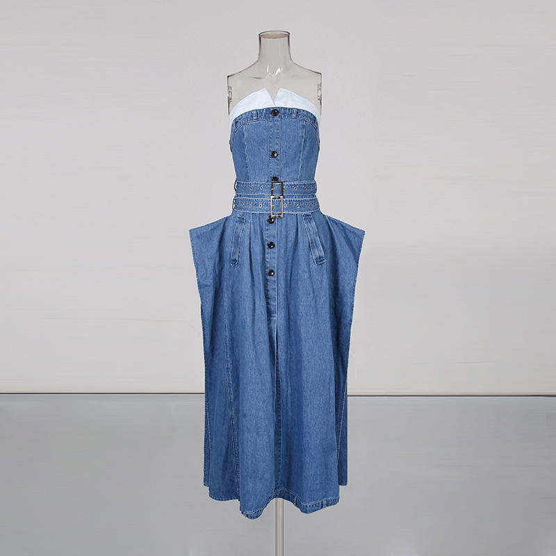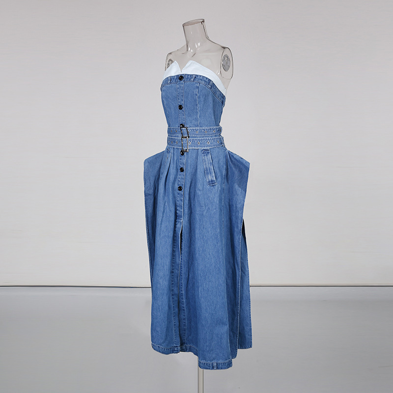 European and American style sexy denim skirt 2025 new patchwork contrasting sleeveless design single breasted strapless dress for women's fashion