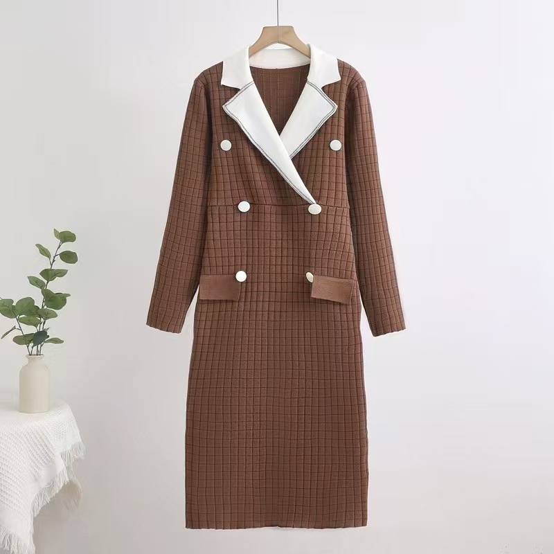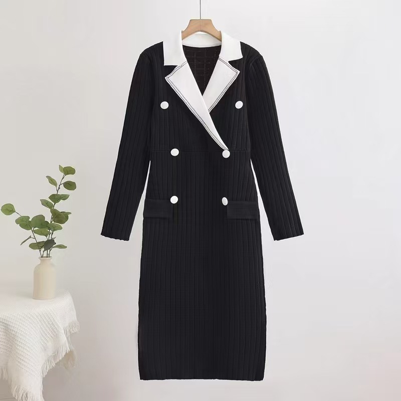 Cross border 2025 high-end small fragrance fashionable contrasting color suit collar long sleeved double breasted knitted dress