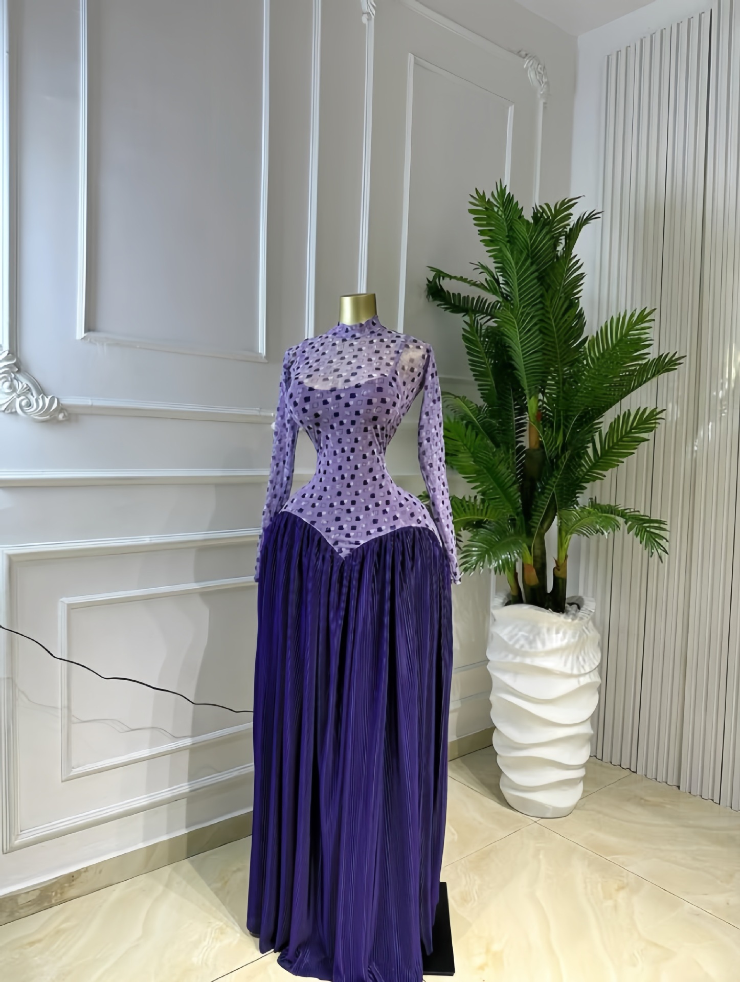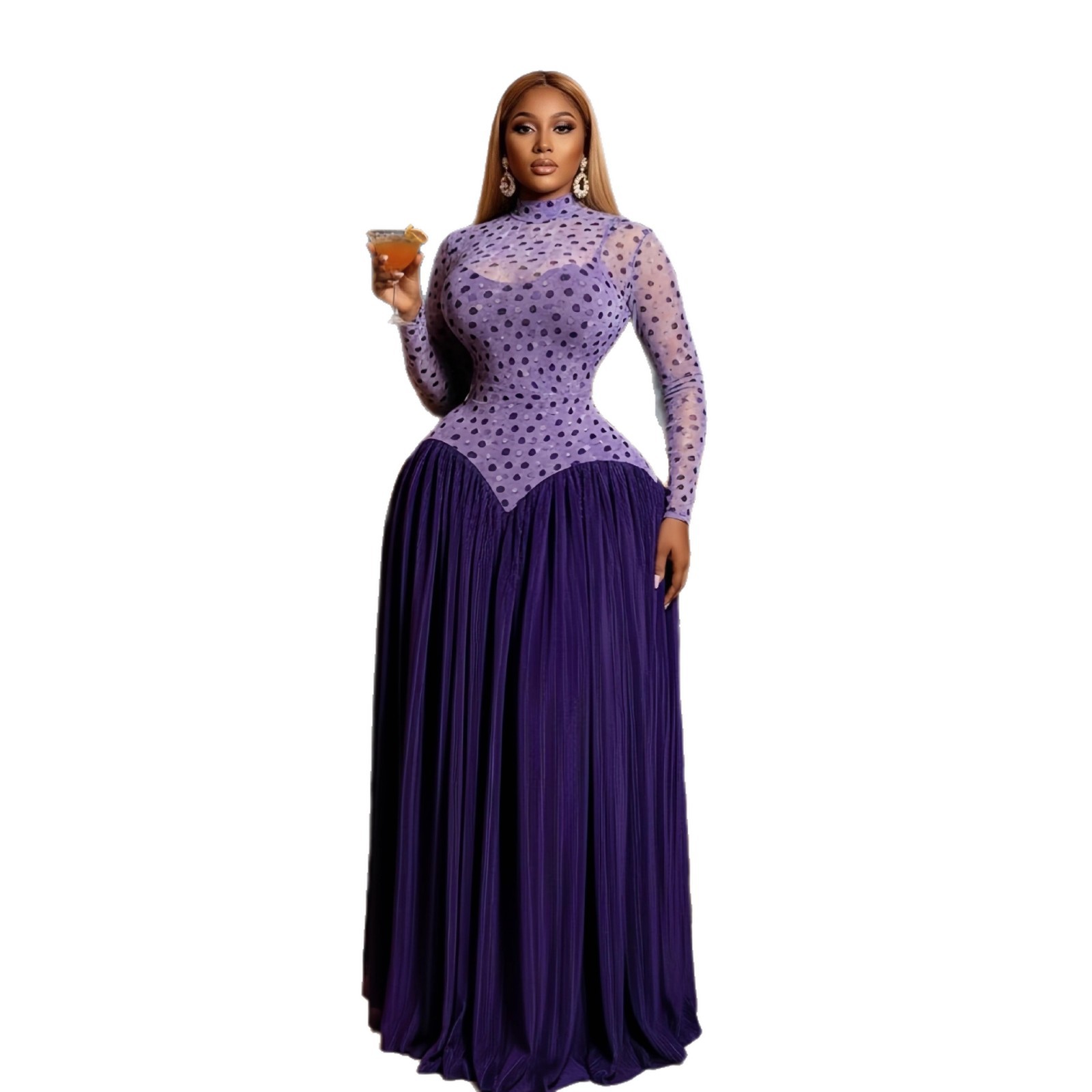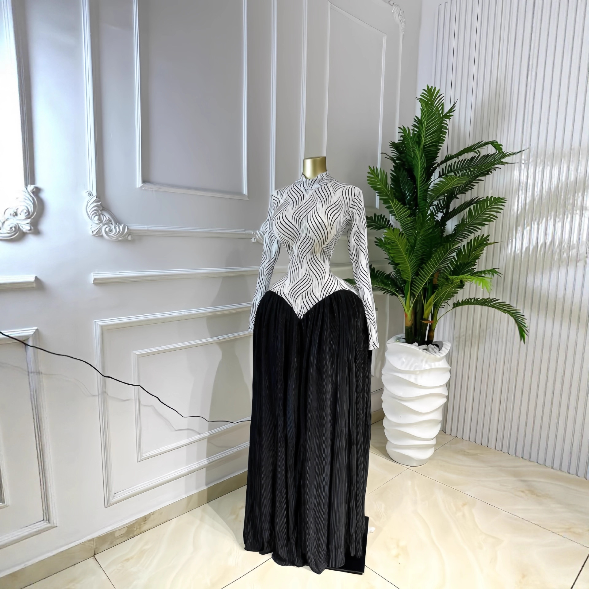 European and American cross-border women's clothing 2025 winter new long sleeved stand up collar slim fit patchwork pleated long style dress with temperament