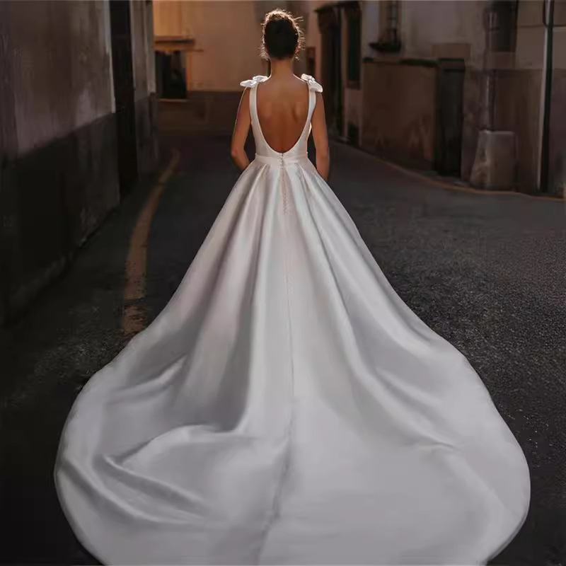 Foreign trade wedding dress elegant A-line wedding dress bow sleeveless bride sexy V-neck backless new wedding dress lace