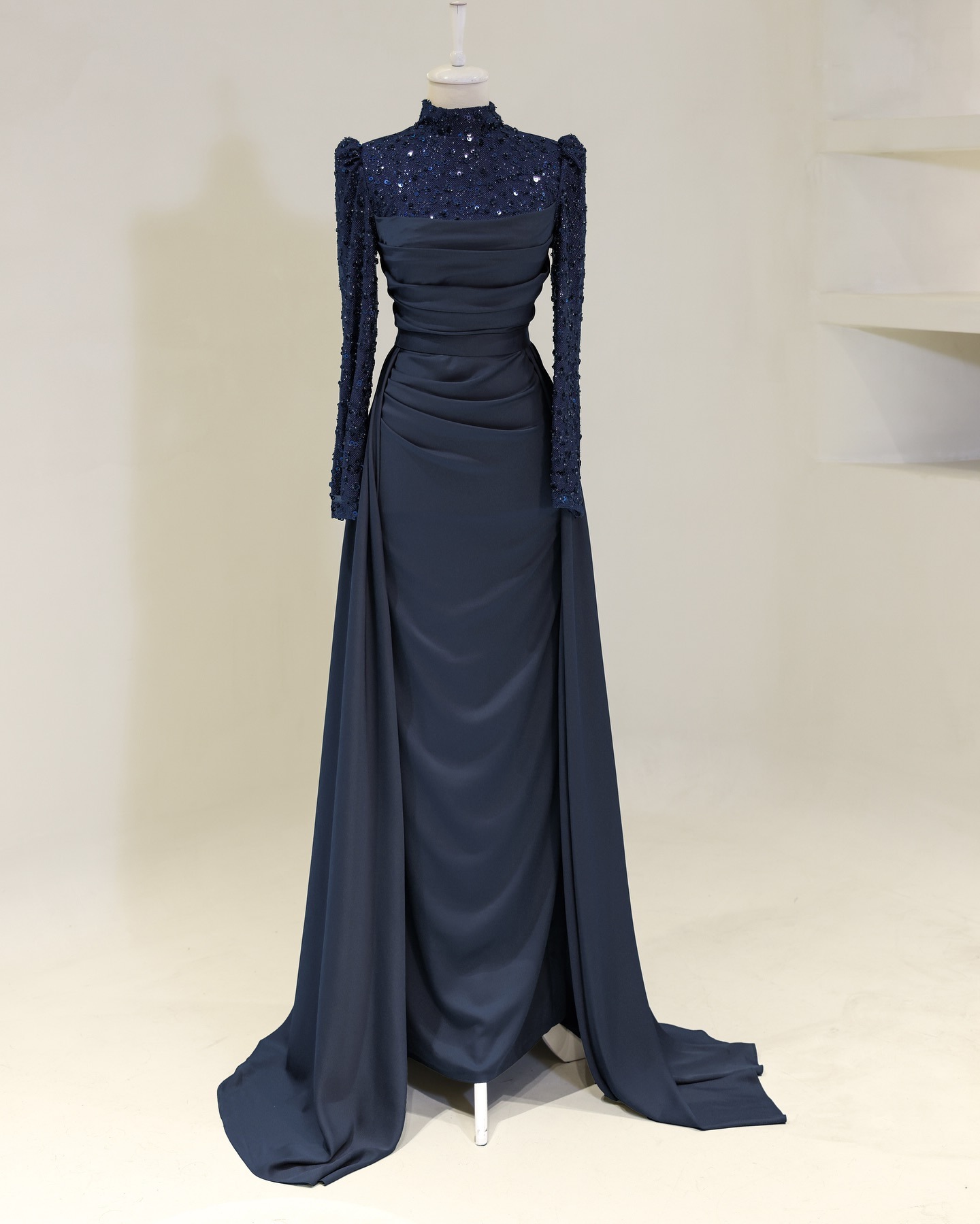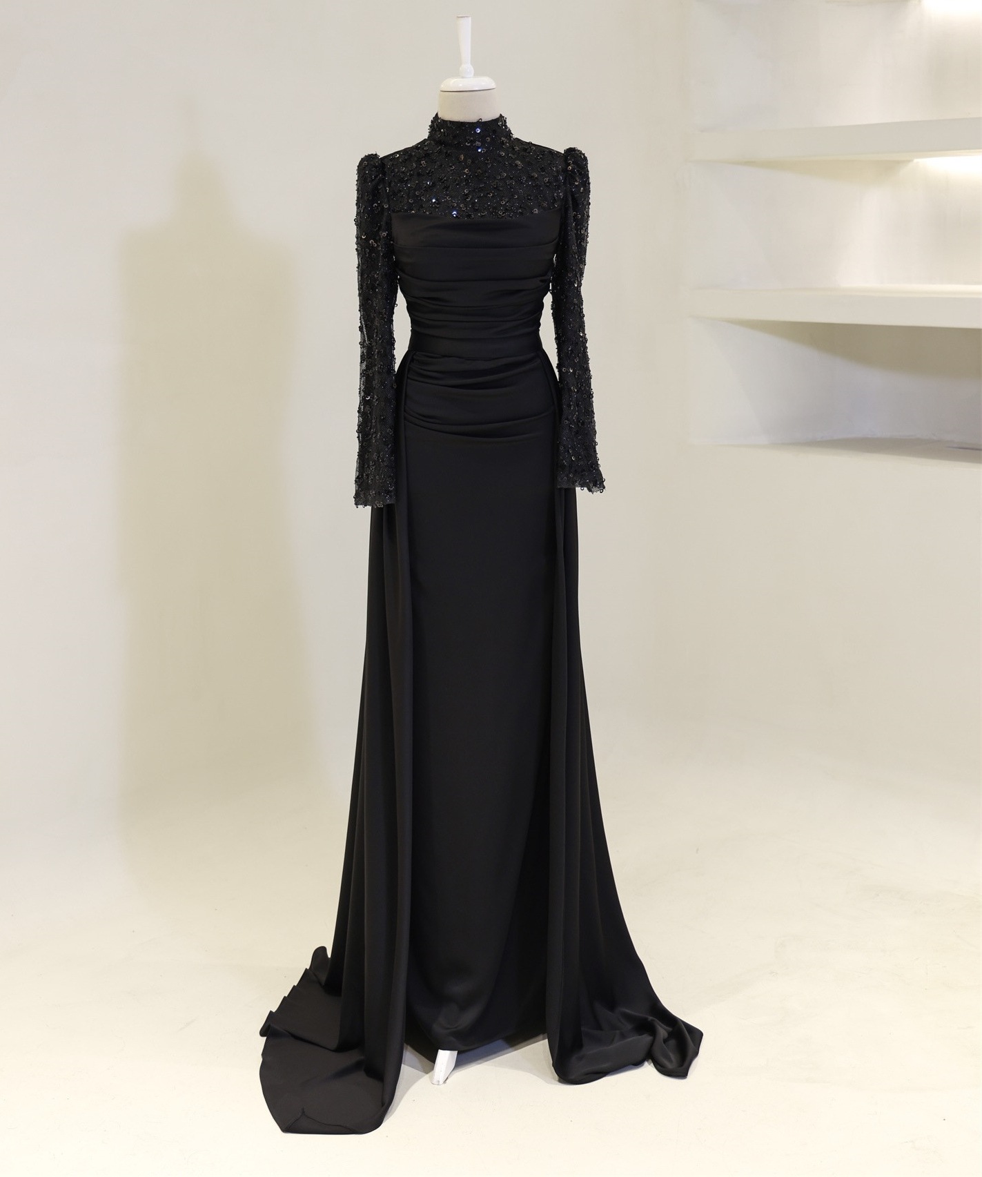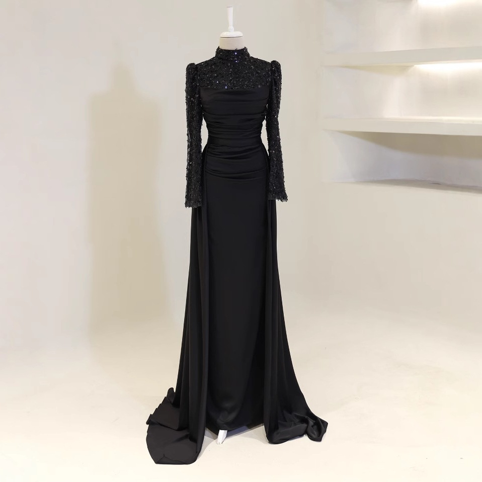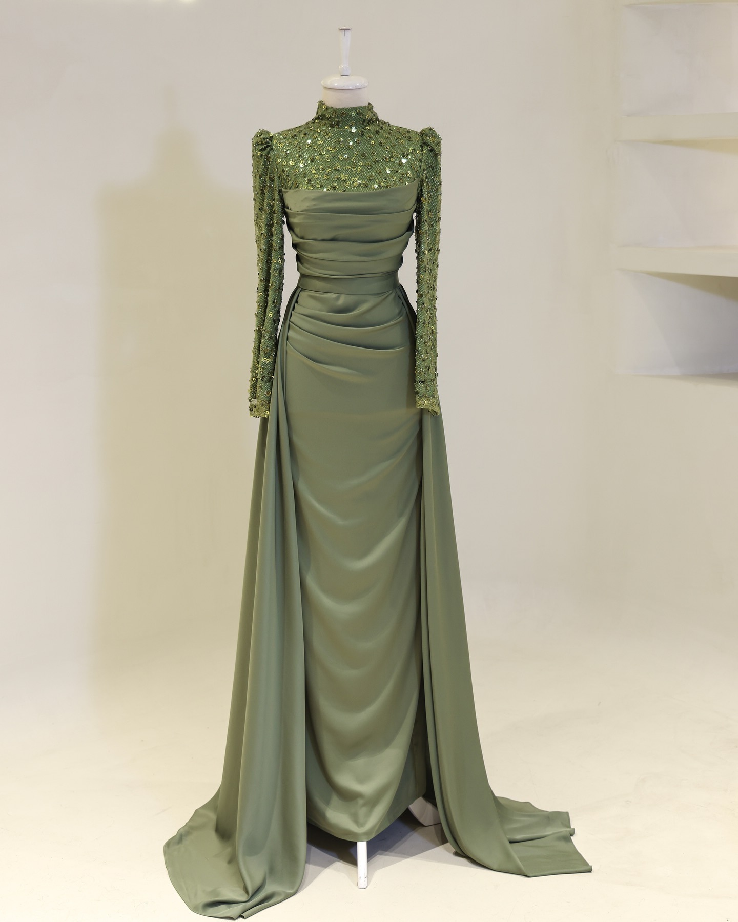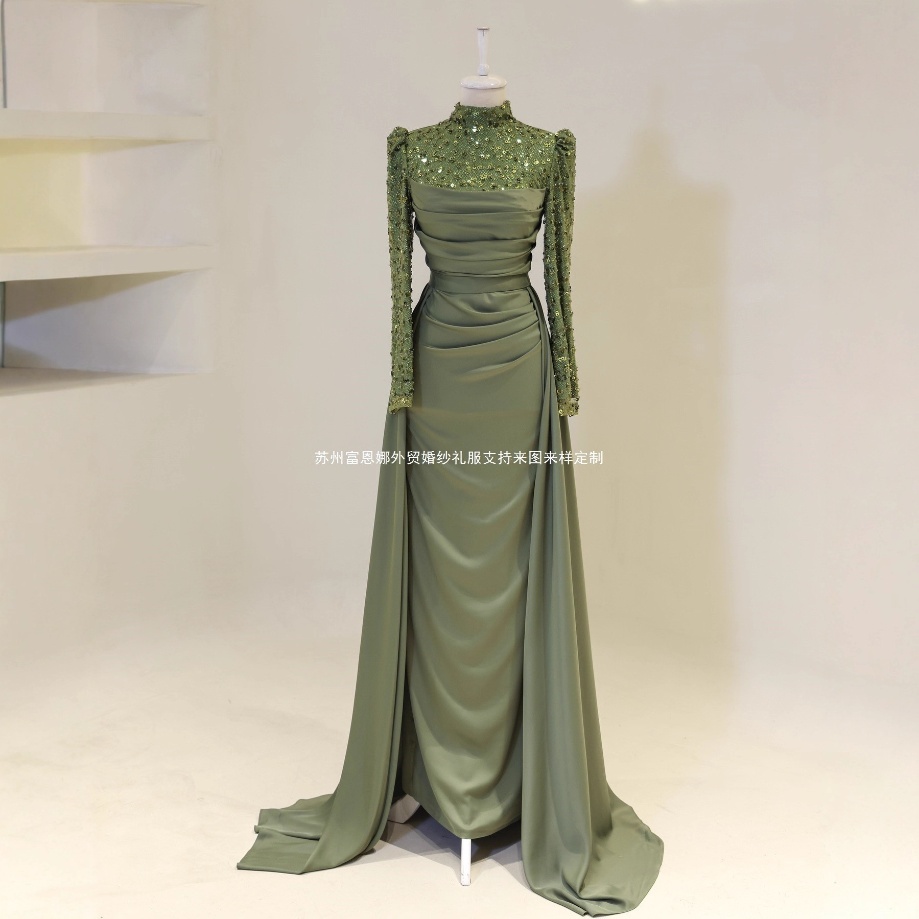 Factory direct sales stand collar full sleeved detachable two-piece evening gown with dignified and elegant temperament, satin dress